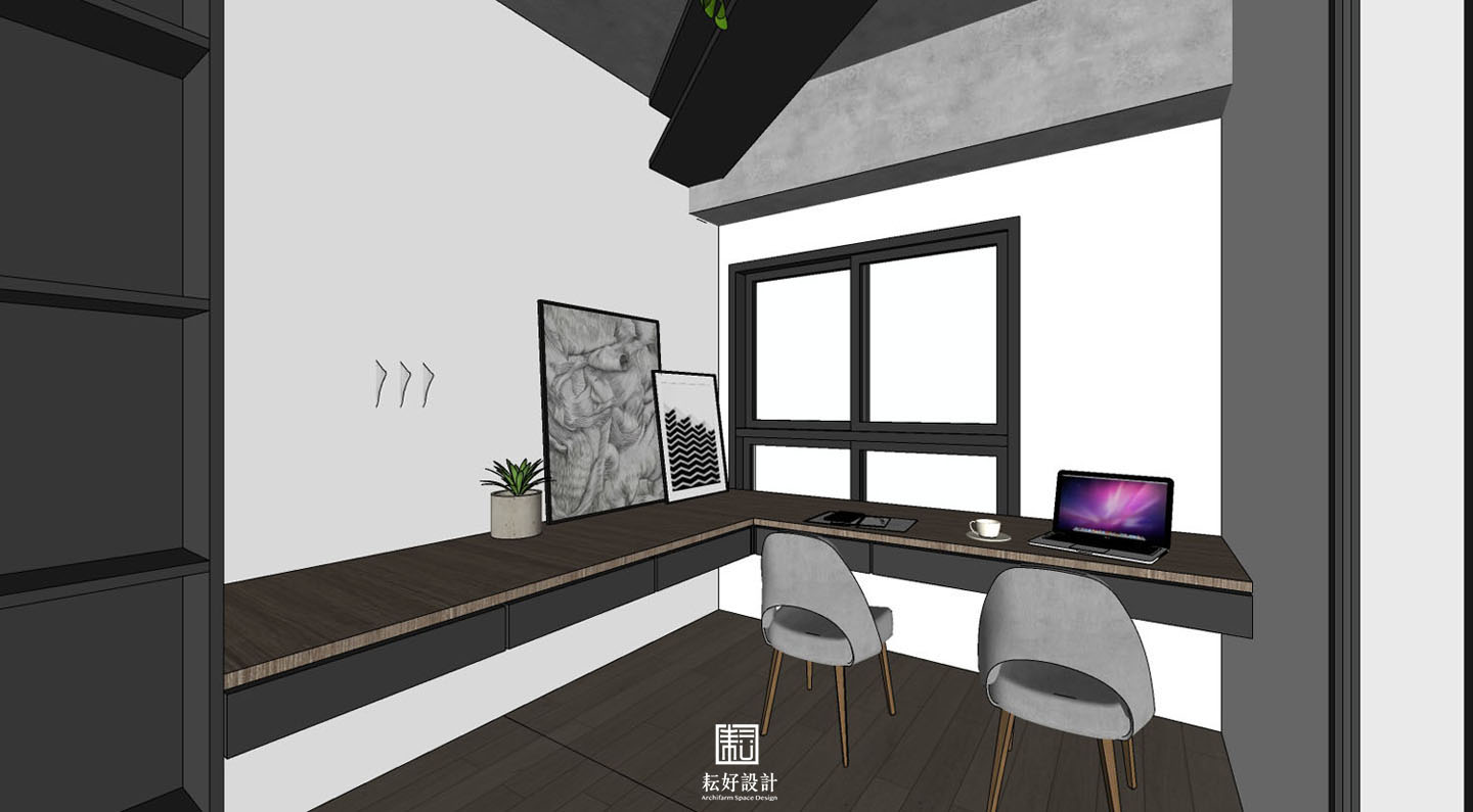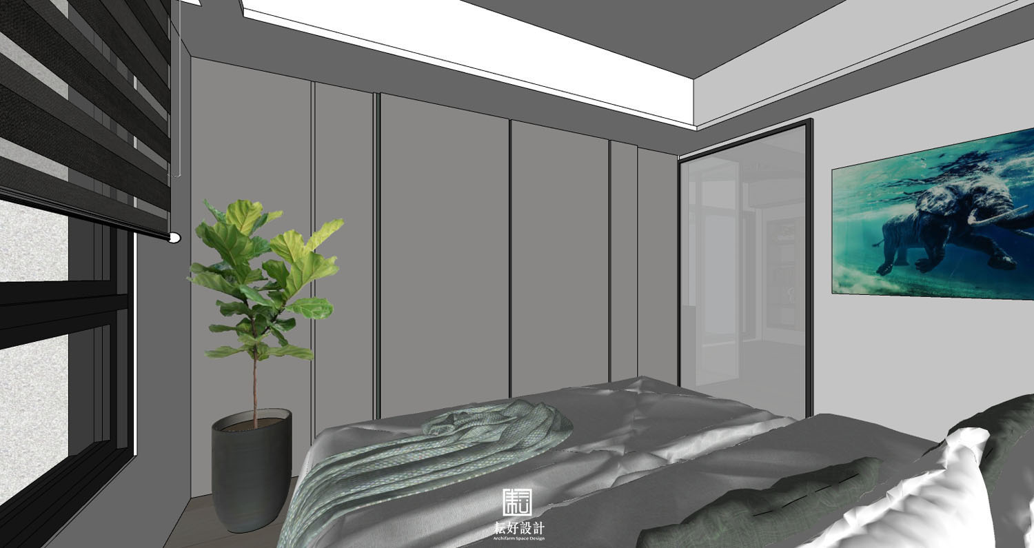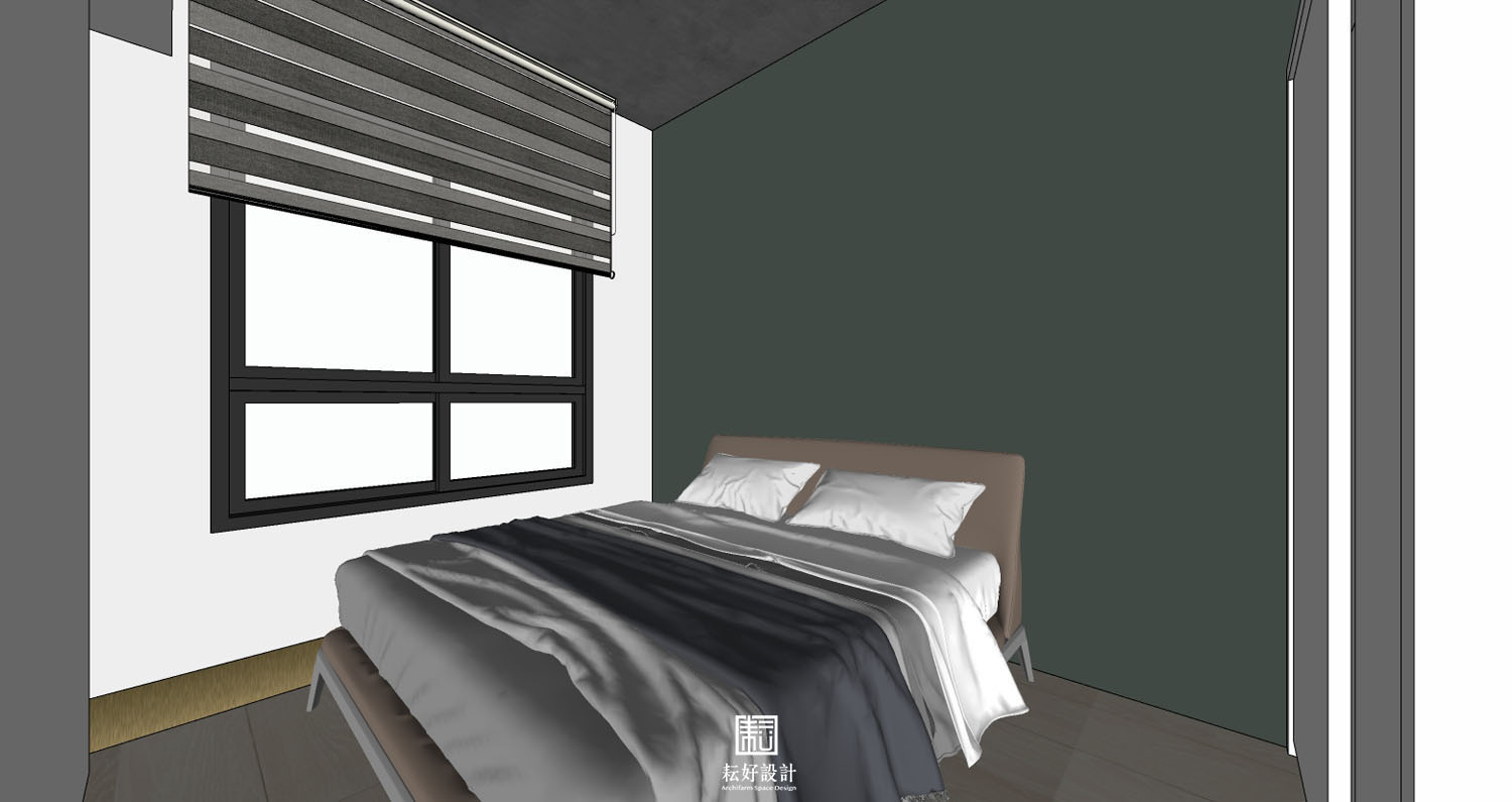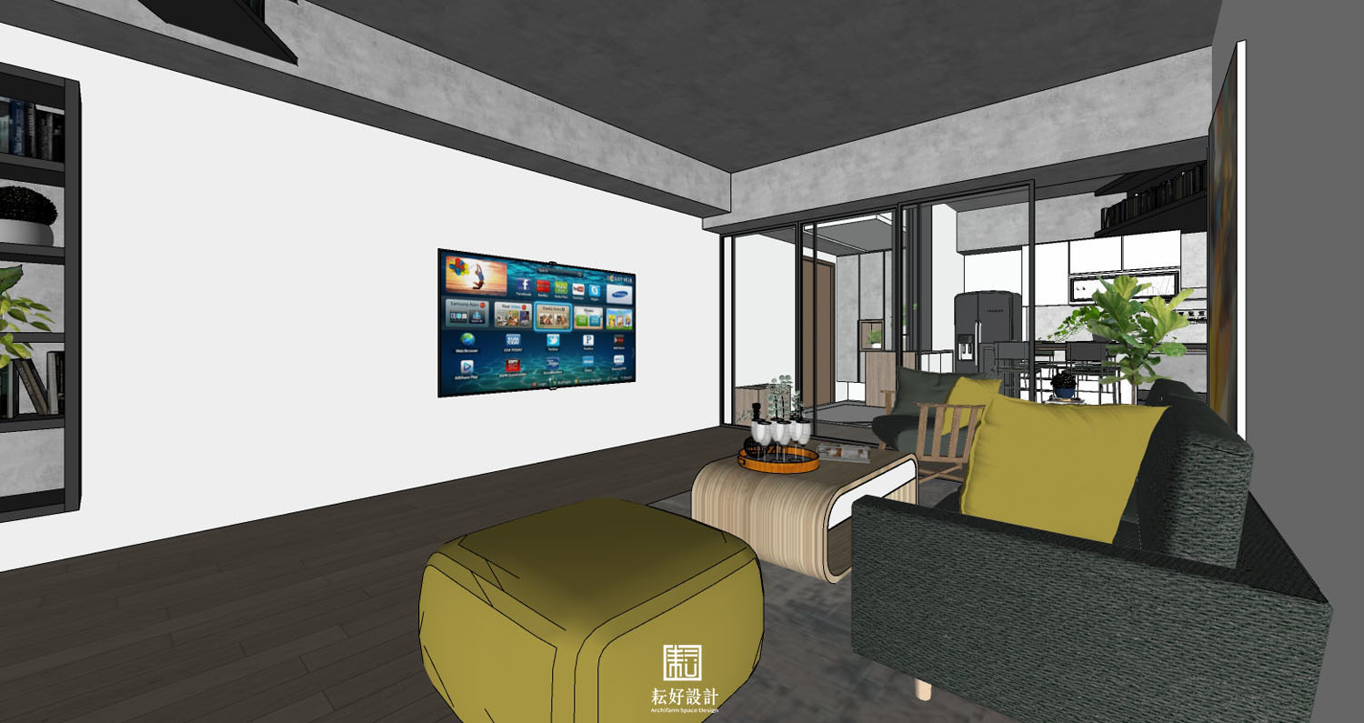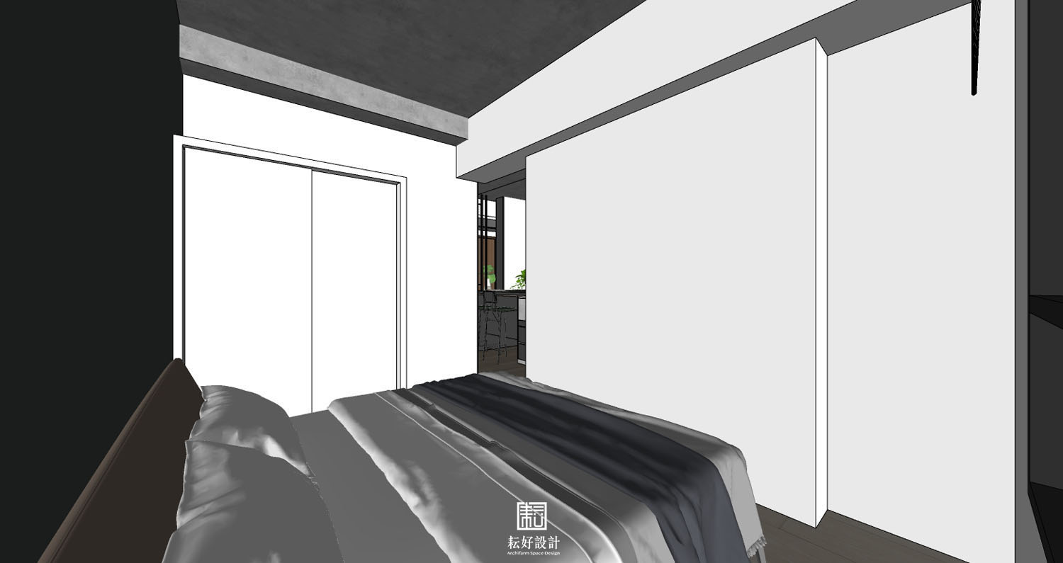 業主喜好工業風,喜好不那麼溫暖的工業風。因此主要元素以:白漆、樂土、仿水泥板、消光黑烤漆等灰白黑色調組成;只特別在主臥、客臥等私密空間以墨綠的跳色點綴床頭。在空間的中心電視牆處,也不擺置設備矮櫃等物件,沙發正對的牆面,壁掛一台電視、一組soundbar,其餘的零碎物品都收納至左側的懸吊櫃中,創造極為清爽、極簡的生活重心。