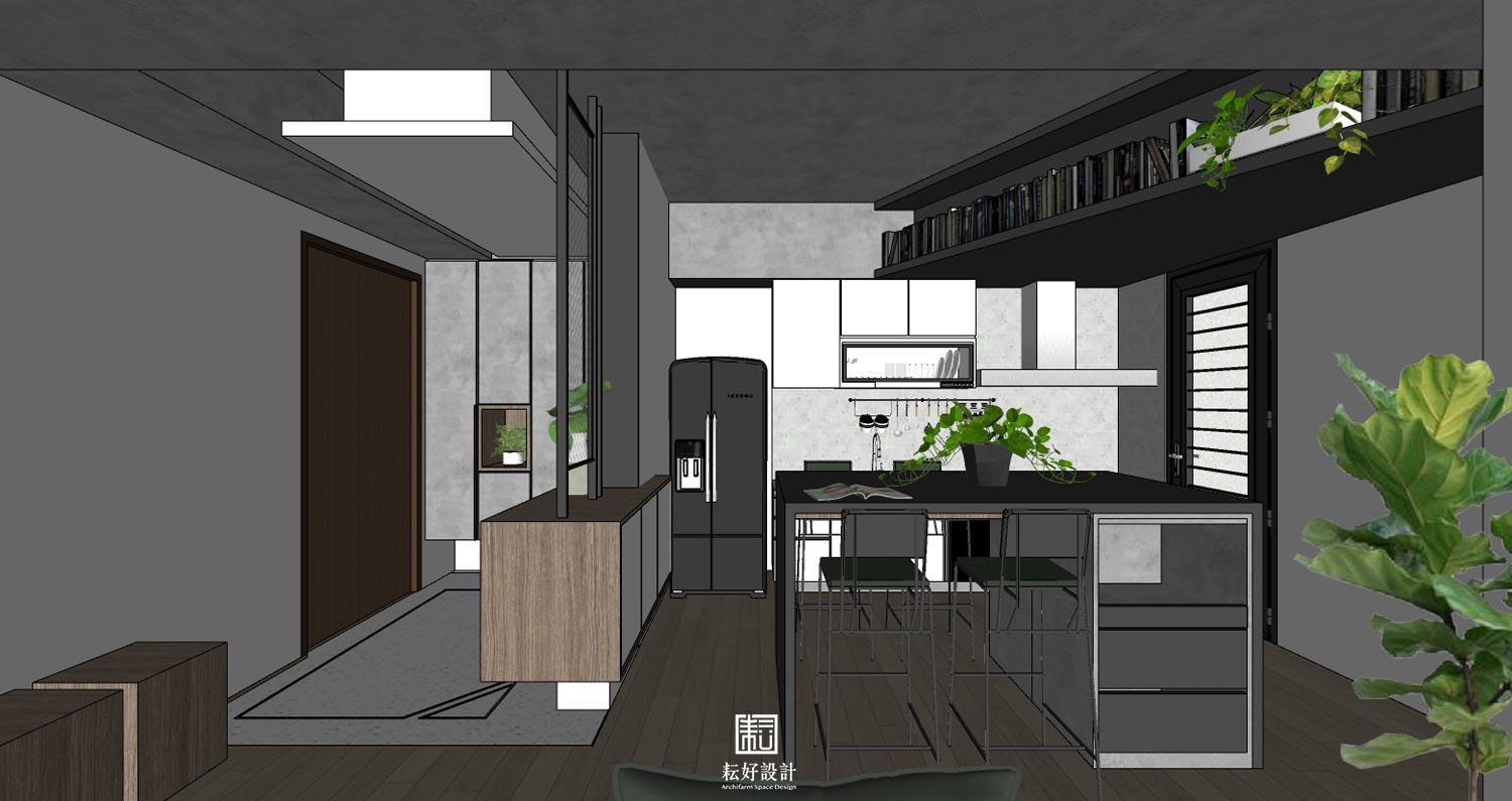 模擬圖:劉瓊蔚、許憶琳 地點:台南市東區 用途:住宅 事務所:耘好設計 主持人:謝耕宇 參與者:劉瓊蔚、許憶琳、謝秉均 空間面積:31.1坪 主要建材:樂土、鐵件、木地板、波麗板 設計日期:2021年6月至2021年10月