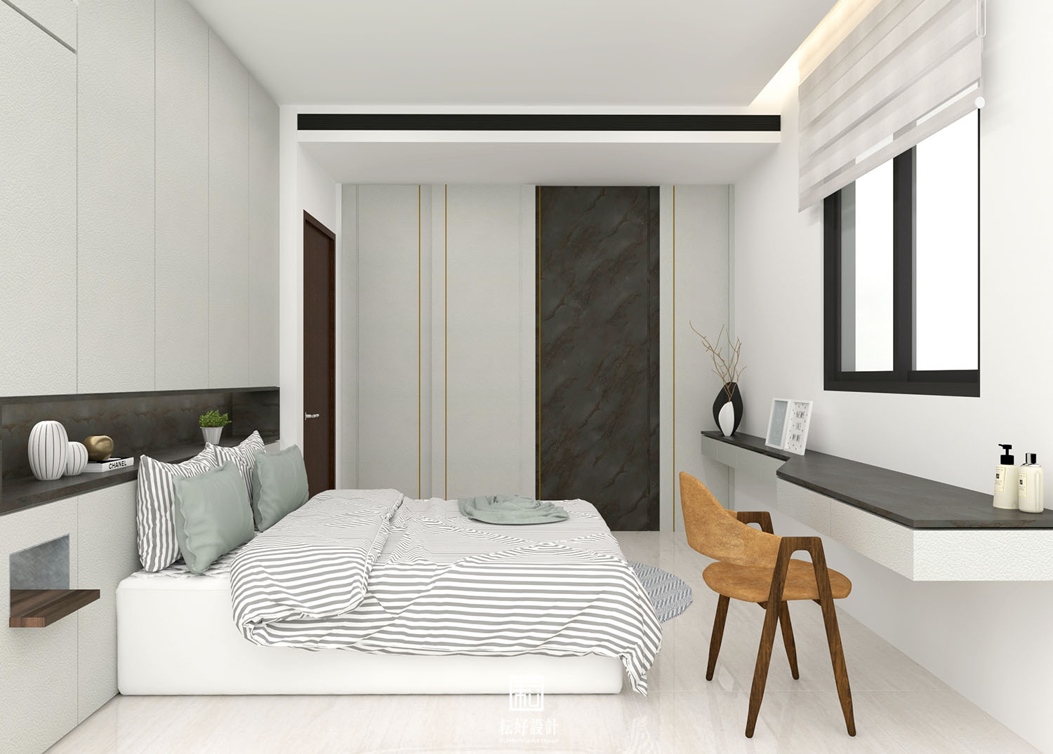 我們以內斂的白色為基底,搭配較深沉的碳化木、黑色鐵件、深黑長型石紋磚,塑造沉穩內斂的質感。另使用亮灰色系的天然石材,與上述材質形成白灰棕黑的漸層式顏色過渡,沉穩中仍能產生材質的交錯。主臥及次臥延續同樣的配色,於造形上有些許調整,使室內整體空間能具有一致的氛圍。