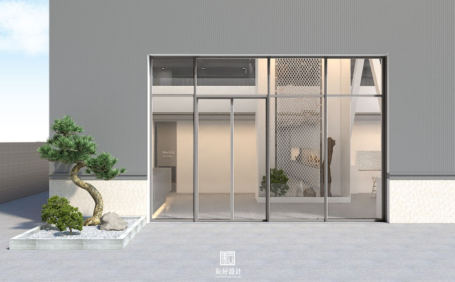 先由入口意象梳理,於捲門側配置樹形優美的緬梔,為門面妝點色彩與生氣。進入大門處,為巨大的企業識別主牆、並於左側設置迎賓櫃台。主牆後方為辦公區動線,左側為大小會議室、設備室,右側為主要辦公區、董事長室、會計室、機房。後側夾層考量到員工休息時的用餐、調理需求,以大面積的流理台為主要機能。