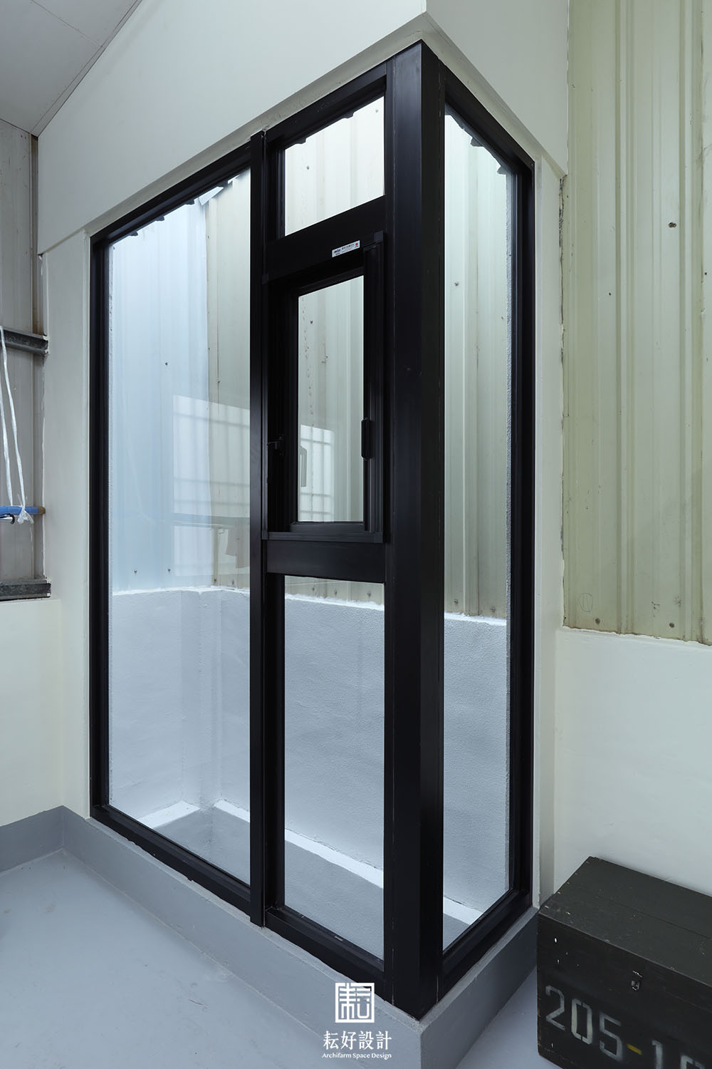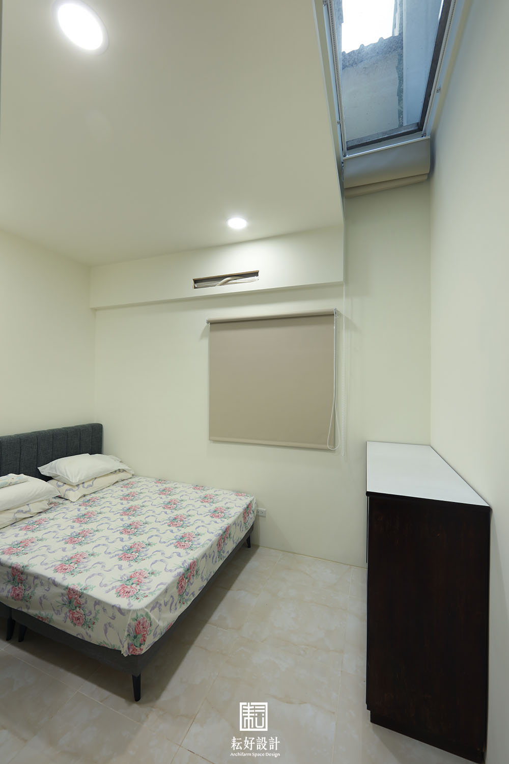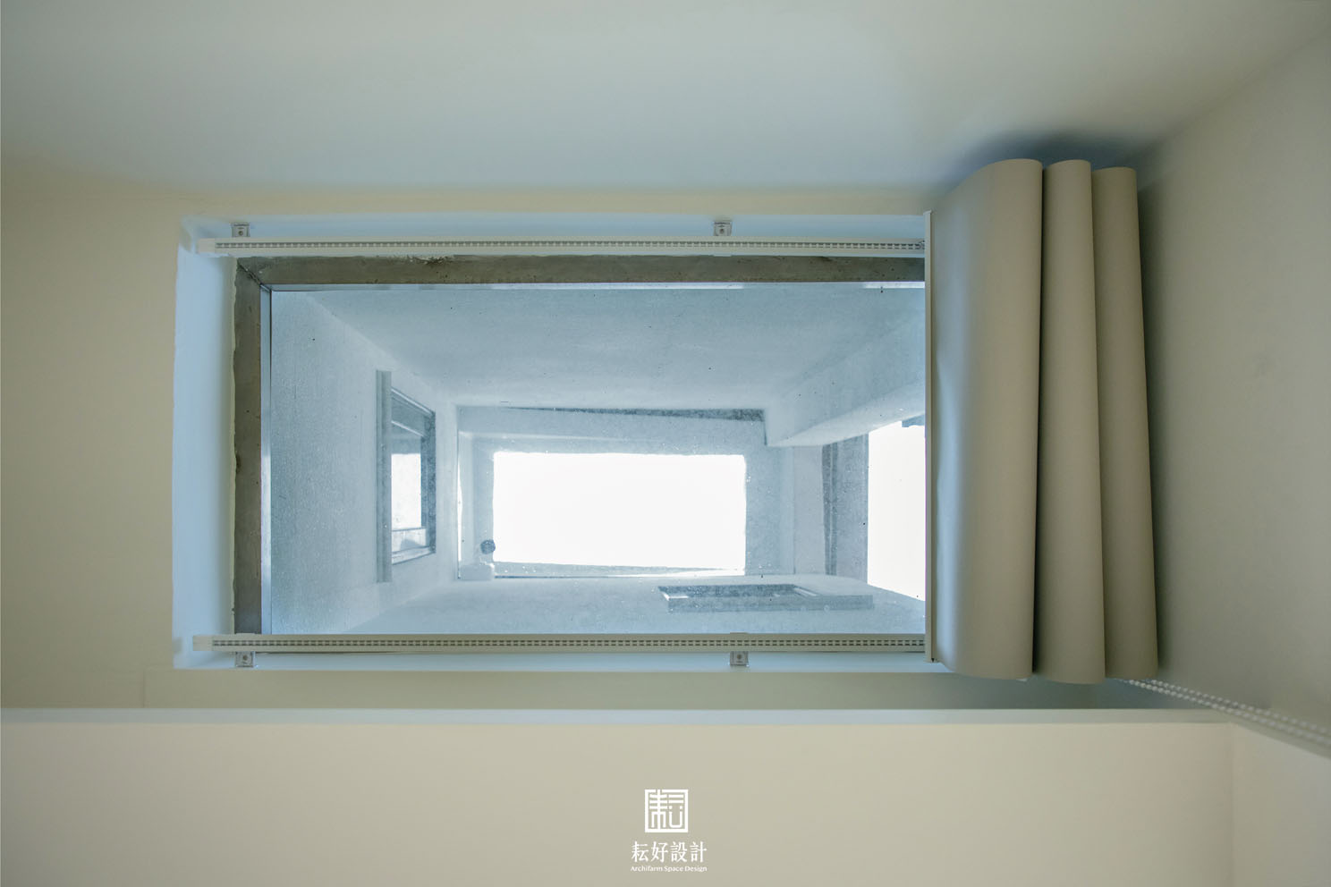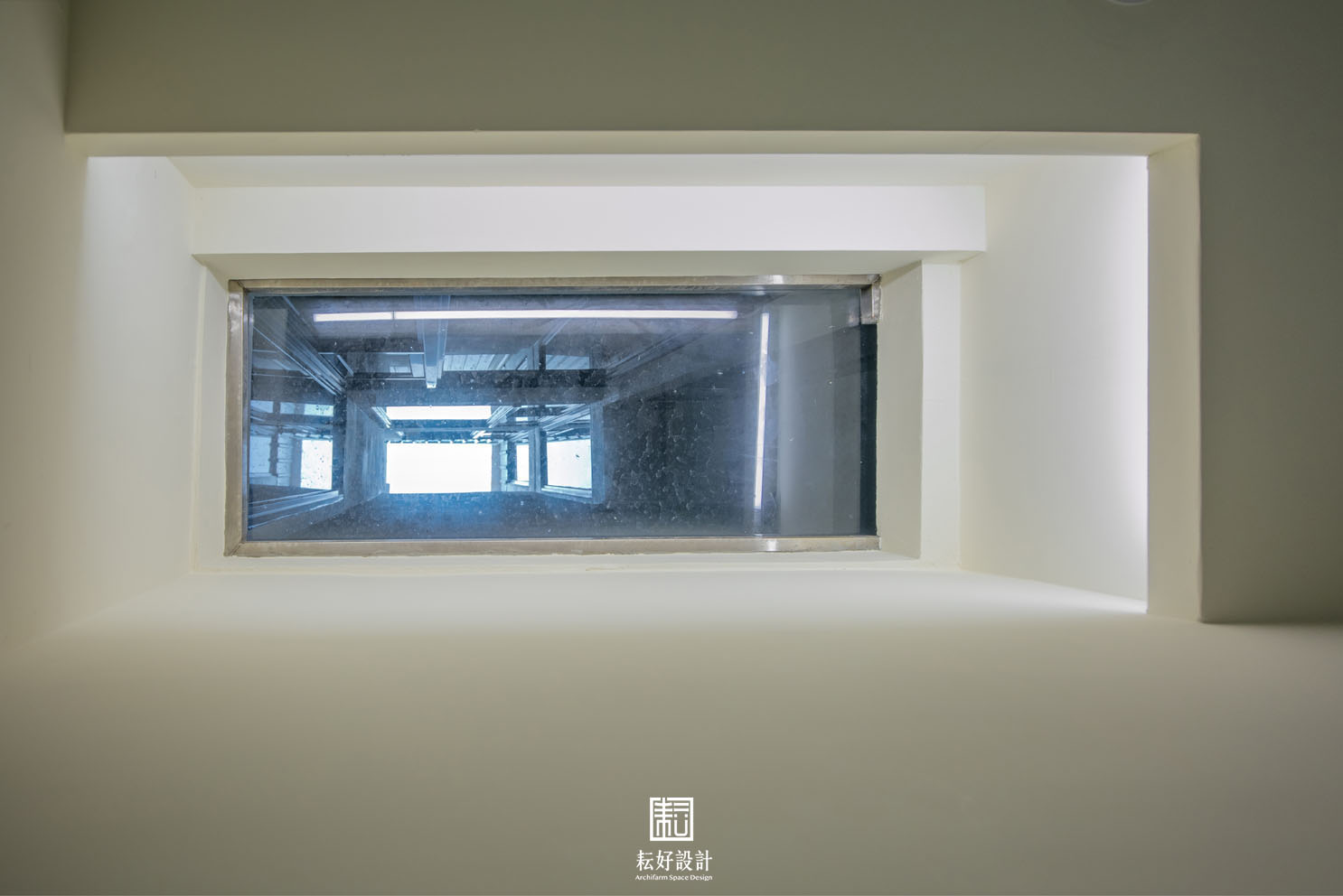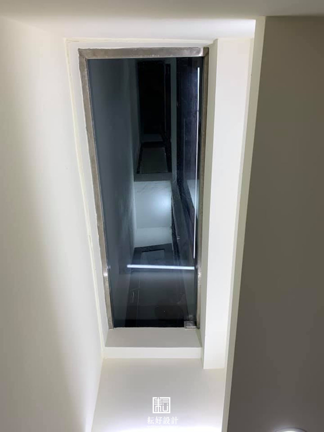 考量到臨地未來的建築可能性,我們為這棟街屋挖設了兩座天井。一座位於一樓後側臥室、一座位於餐廚空間處。餐廚空間處的天井直通四樓增建空間。藉著這座天井,一樓餐廚空間採光得到極大改善、二樓公共衛浴得以有對外窗、二樓後臥室、三樓後臥室及四樓倉儲區的採光改善,同時還可開窗形成室內對流。