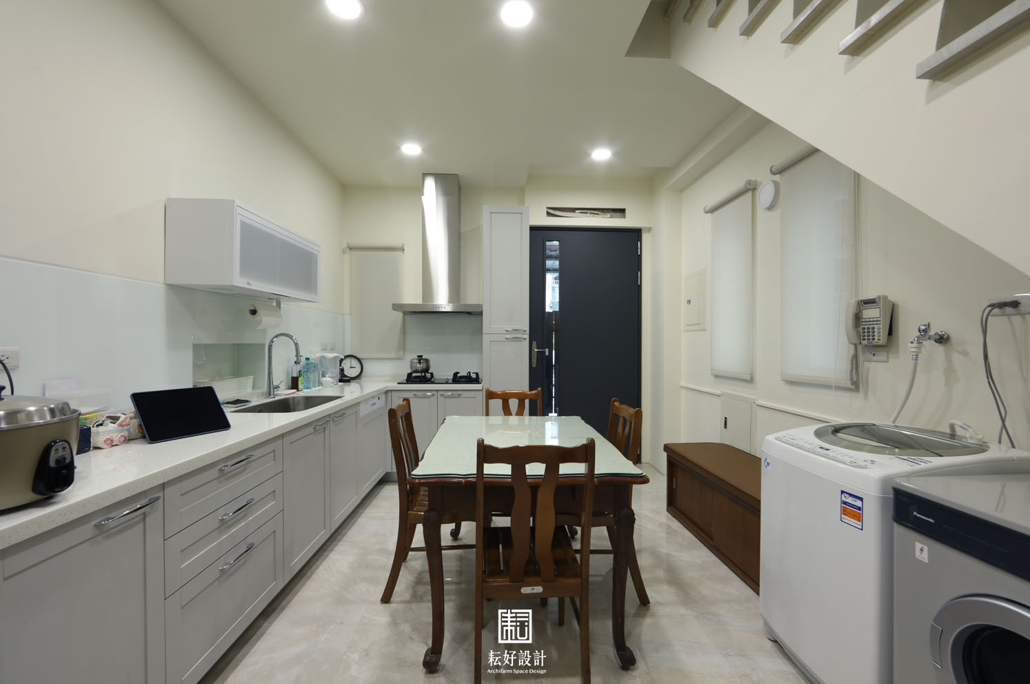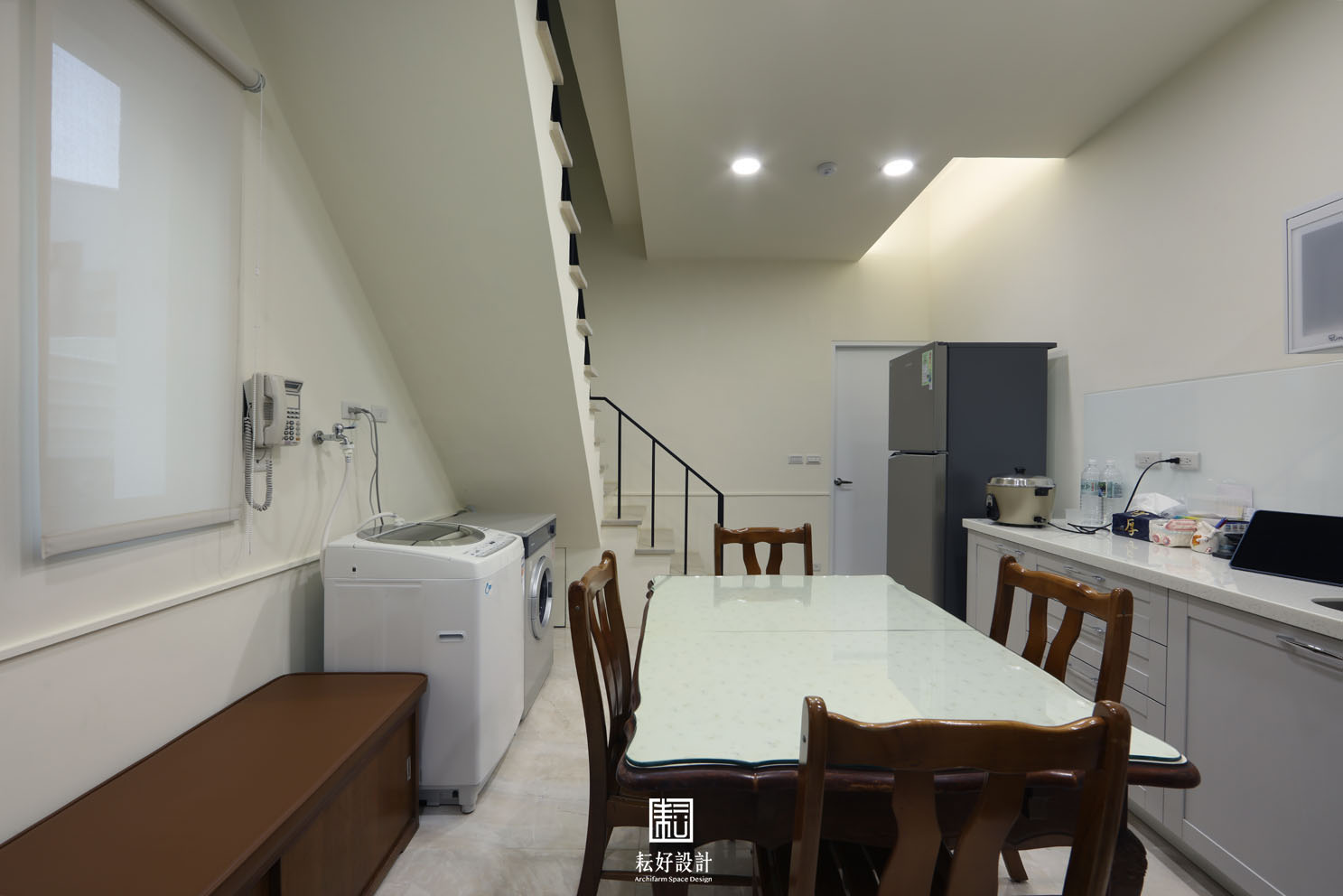 考量到業主大多數時間都待在室內,我們希望將業主的主要活動空間塑造得更為寬敞與舒適。因此,將主要承載生活機能的餐廚空間移至建築前端,如此可達成數項優勢:建物前側採光較佳、餐廚不包含浴廁格局較方正、廚具尺寸可放大、桶裝瓦斯不需搬運過遠、餐桌四周可使用座位增多、洗衣烘衣作業空間較便利舒適。業主每天花費最多時光的空間,即是此案最寬敞舒適的空間,是我們首要達成的任務。