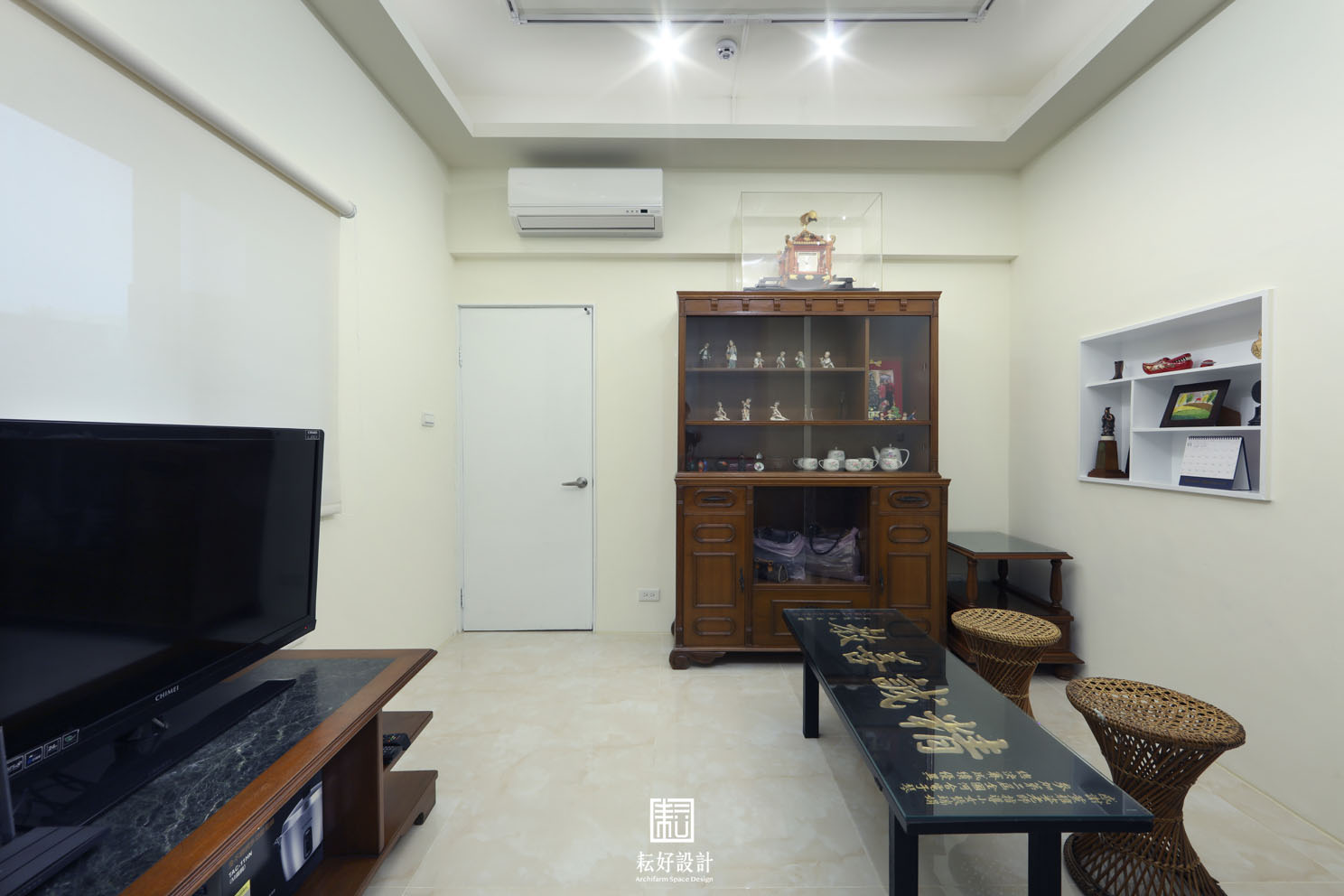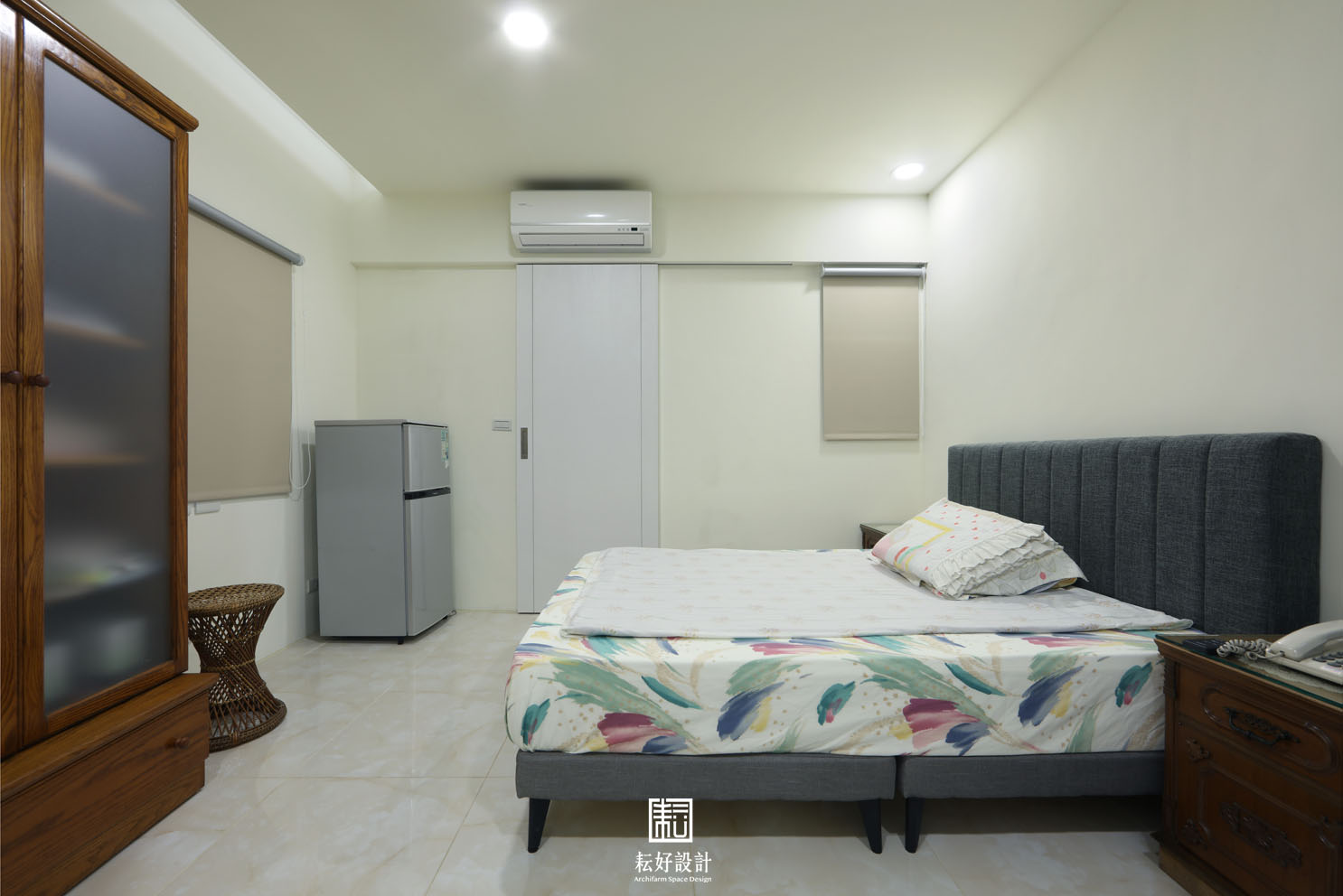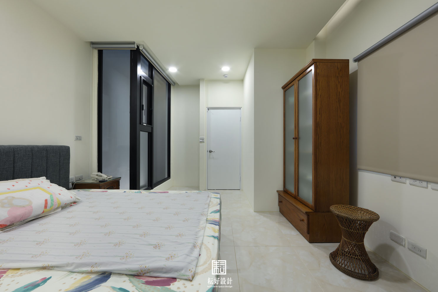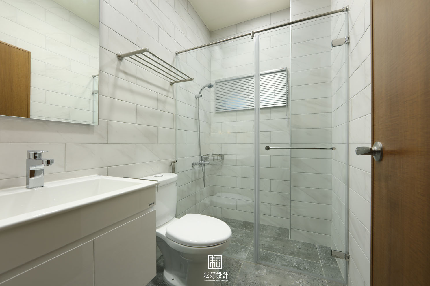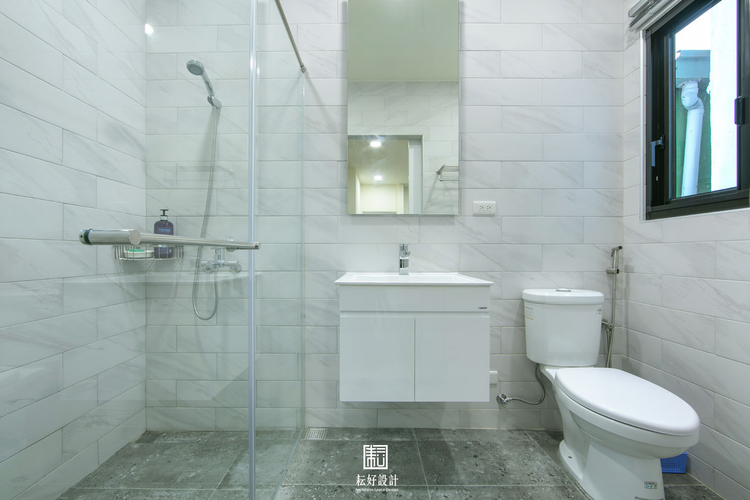 屋齡約四十幾年,我們著重於基礎功能的整體,包含水路、電路、鋁窗、浴廁等系統的更新。室內地坪搭配業主選材,以米黃石紋為主;浴廁則以耐髒的深色、灰白色系為主。