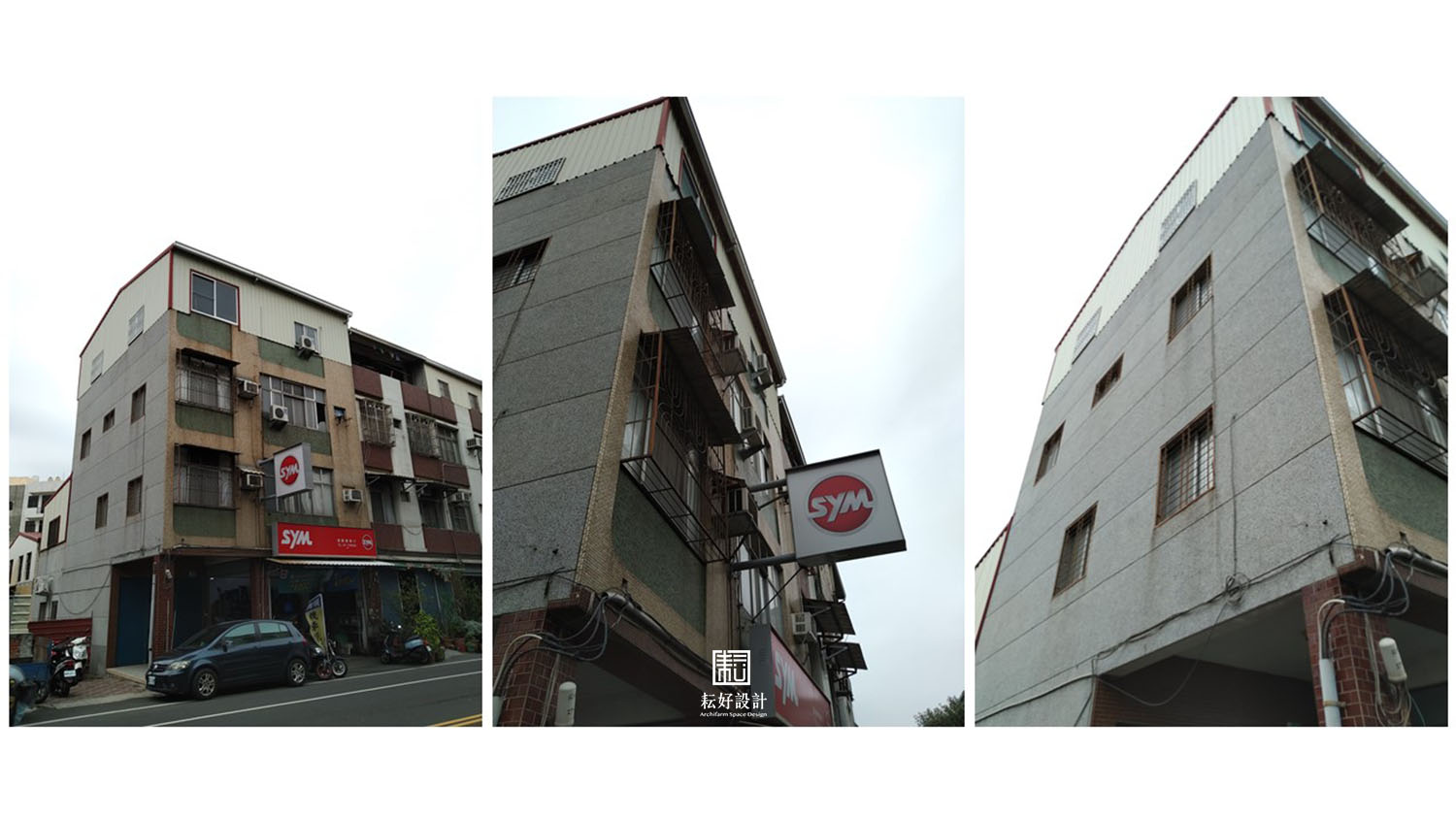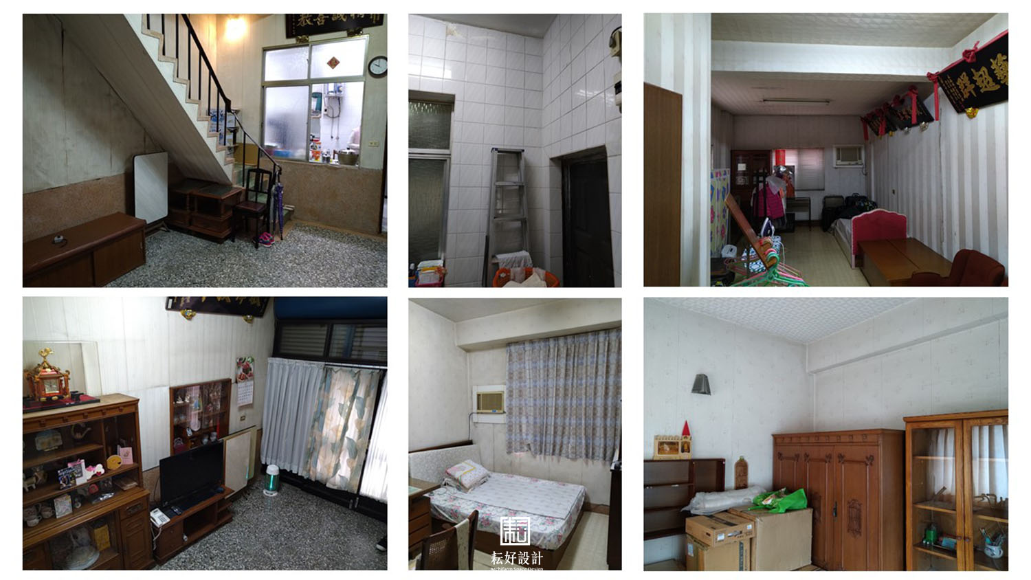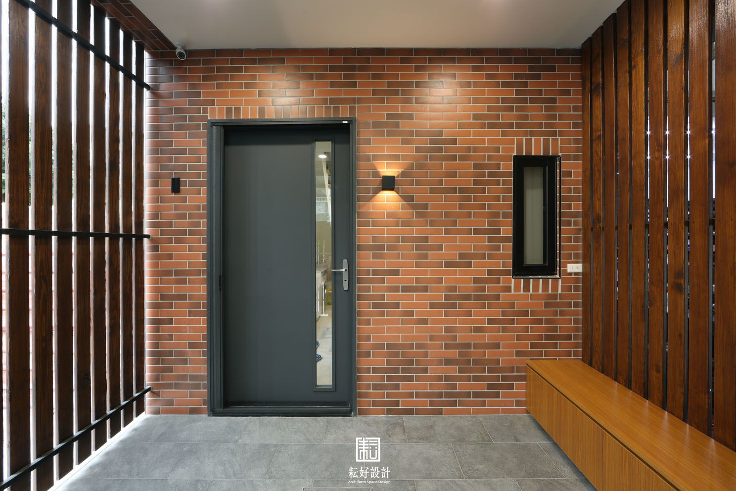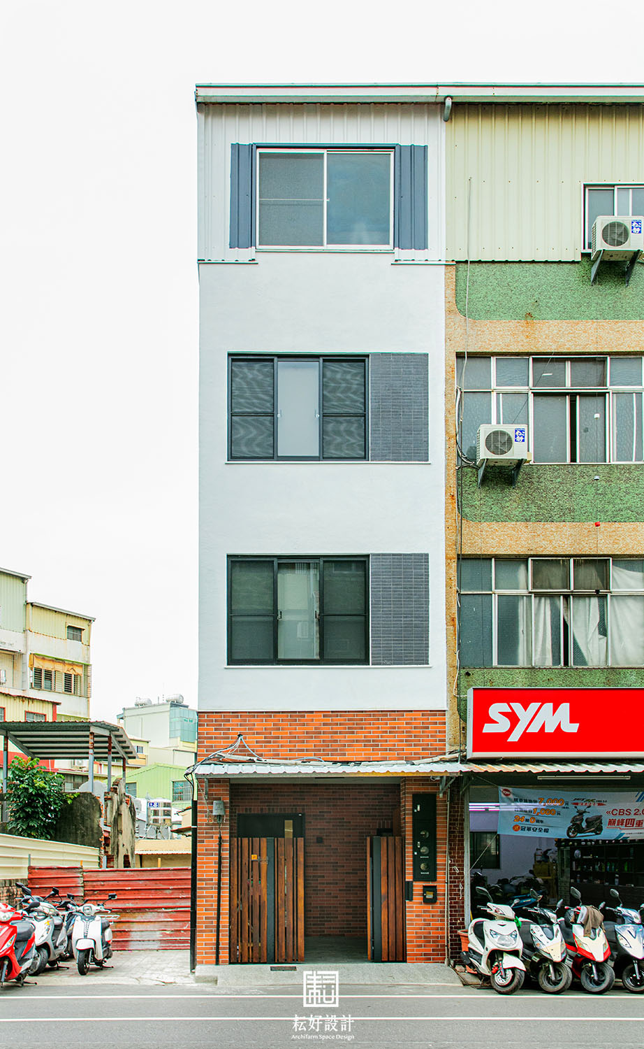 設計上於外觀著墨較多,將窗型空調孔填平、既有抿石子外觀修改成純白紋理塗料,並於騎樓處鋪貼仿舊紅磚二丁掛,為建物整體創造鄉村又簡約的外觀。騎樓處的南方松圍籬,以寬窄相間的韻律創造入口處的活潑氛圍。室內則以機能性造型為主,配色以淺色、米白等色系為主。