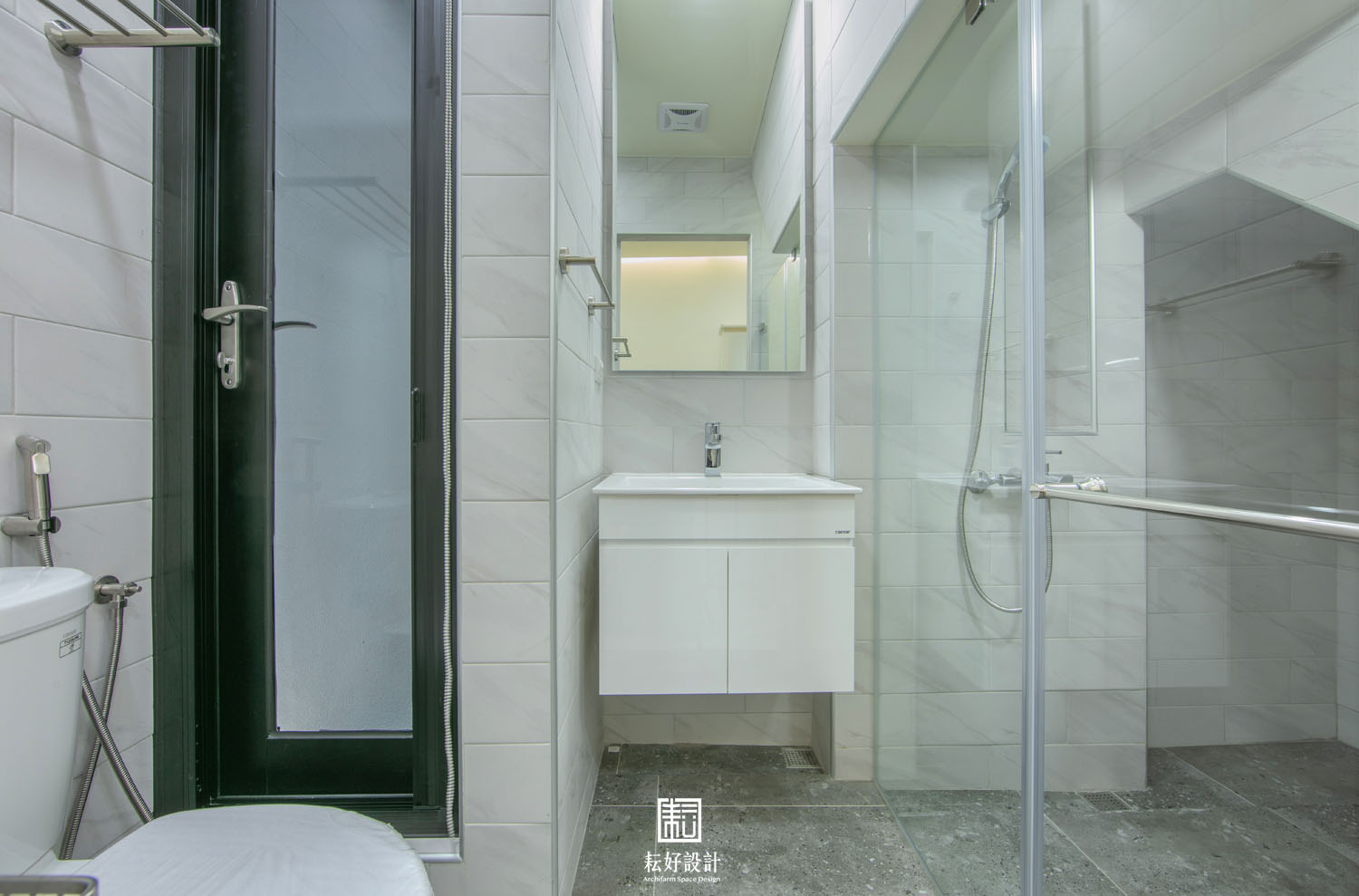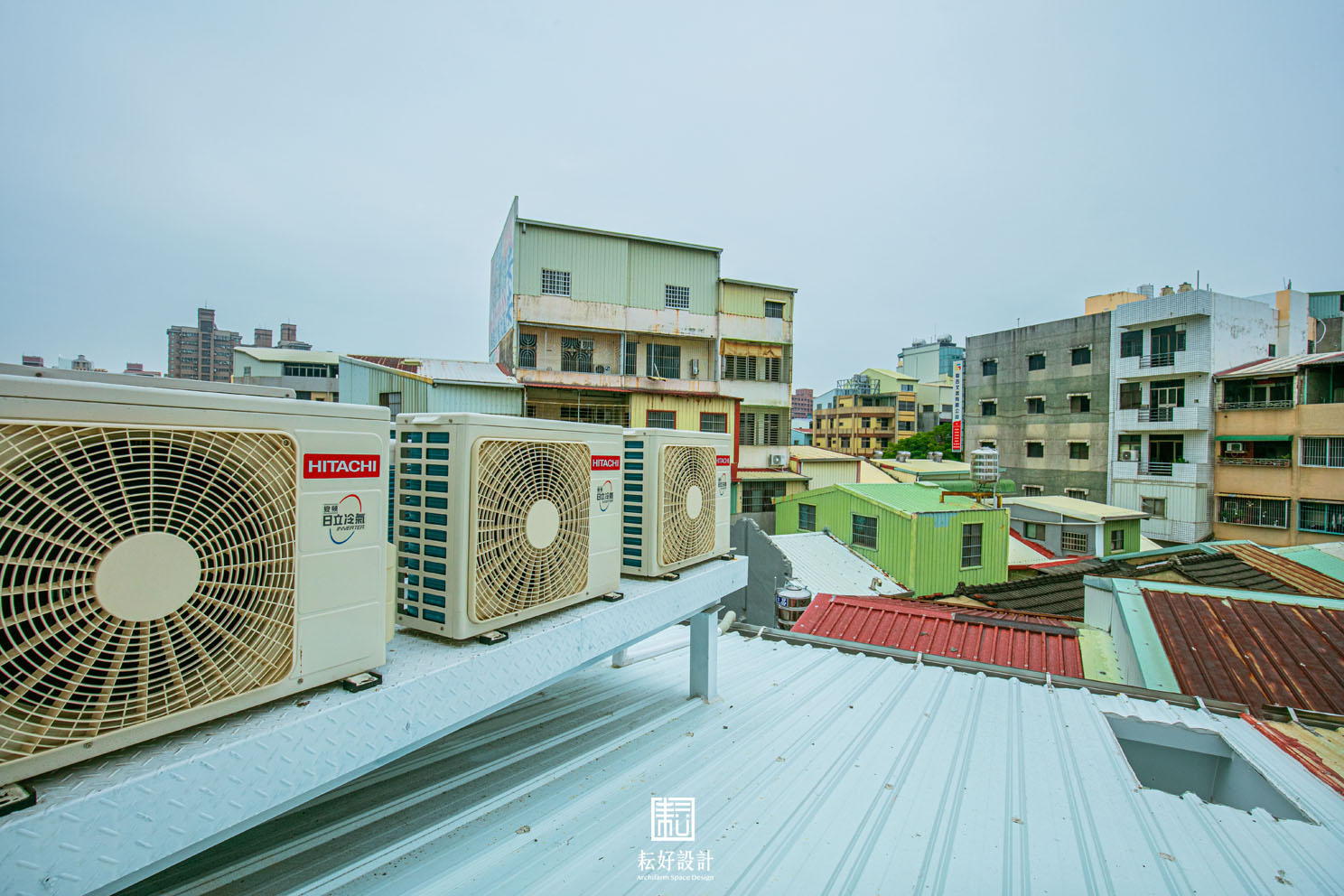 既有建築有兩座衛浴,我們將二座衛浴的空間格局皆做修改、同時新設一座衛浴於二樓後側臥室,為業主提供更為合理舒適的如廁體驗。二樓屋頂上方,新增一座空調設備平台,將正立面以及側立面的空調外機皆收納至此處,統一管理、也提供維修的便利性。