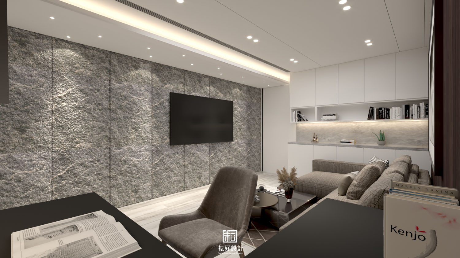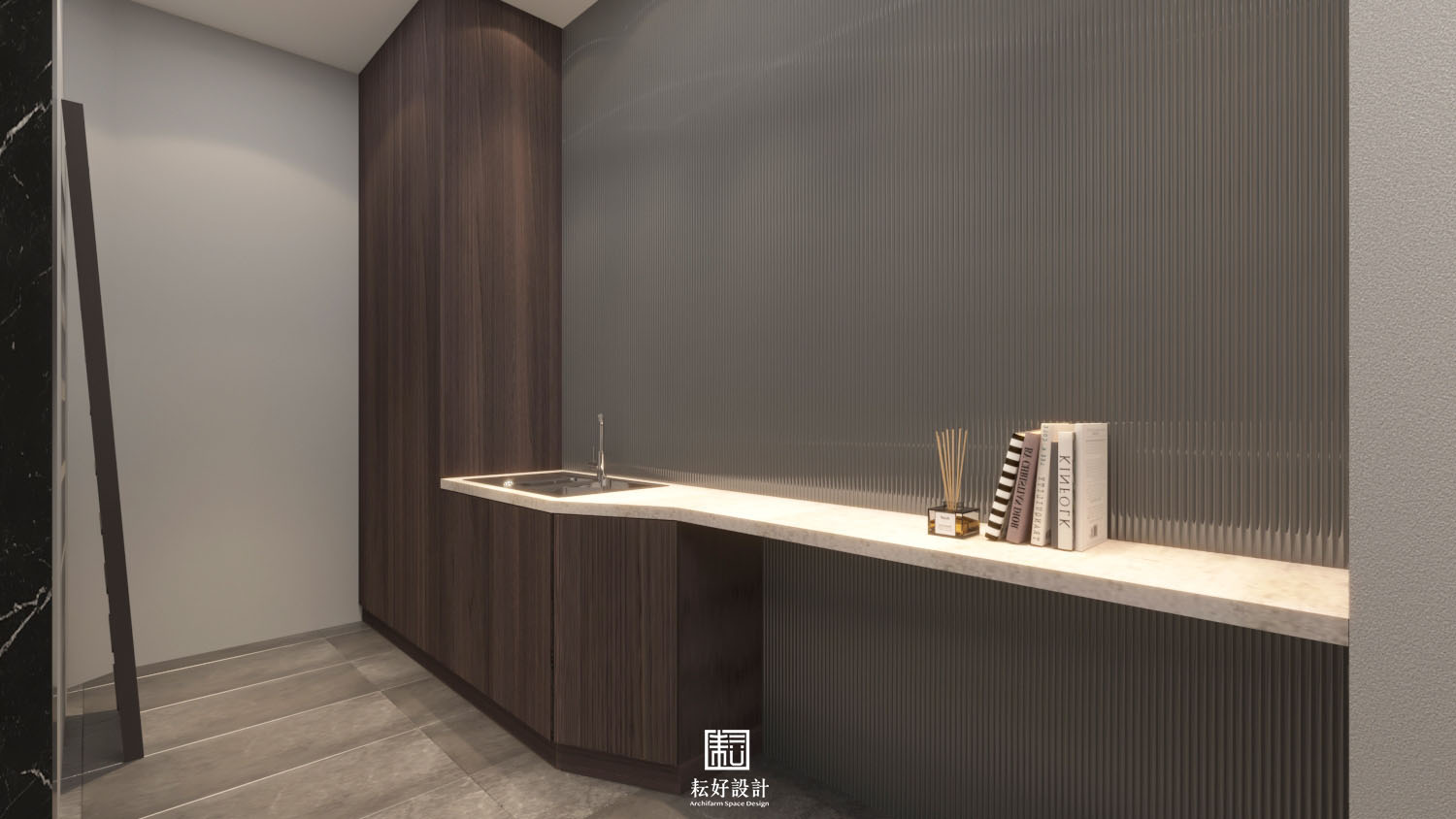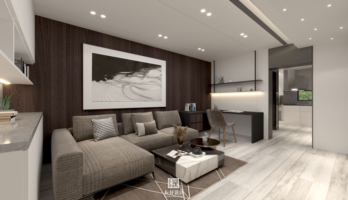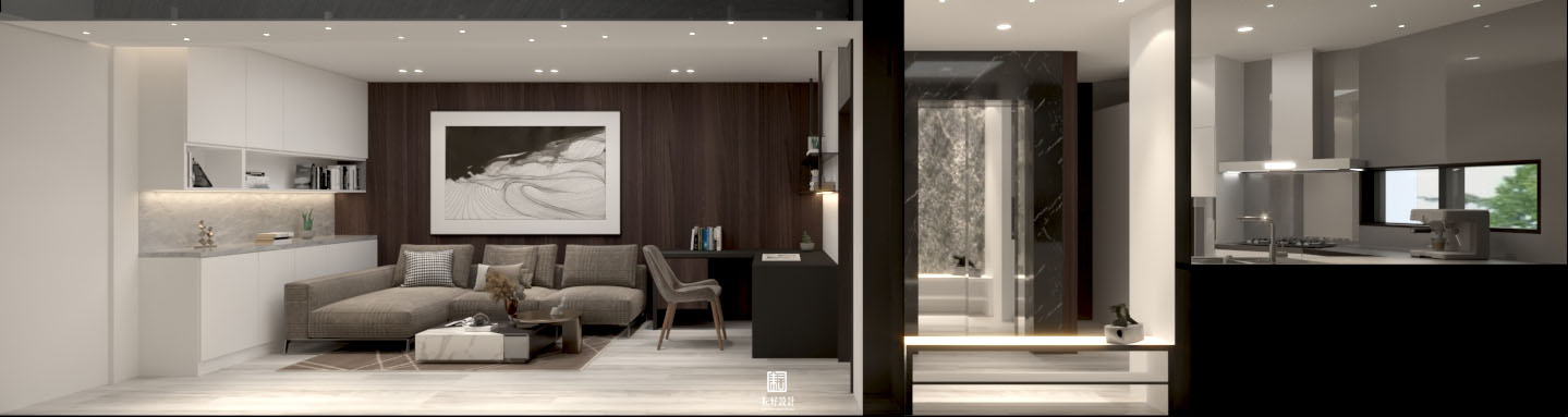 業主對生活品質有較高需求,整體風格以現代為基底,搭配沉色木紋、灰色系石材,為業主打造低調而內斂的空間。