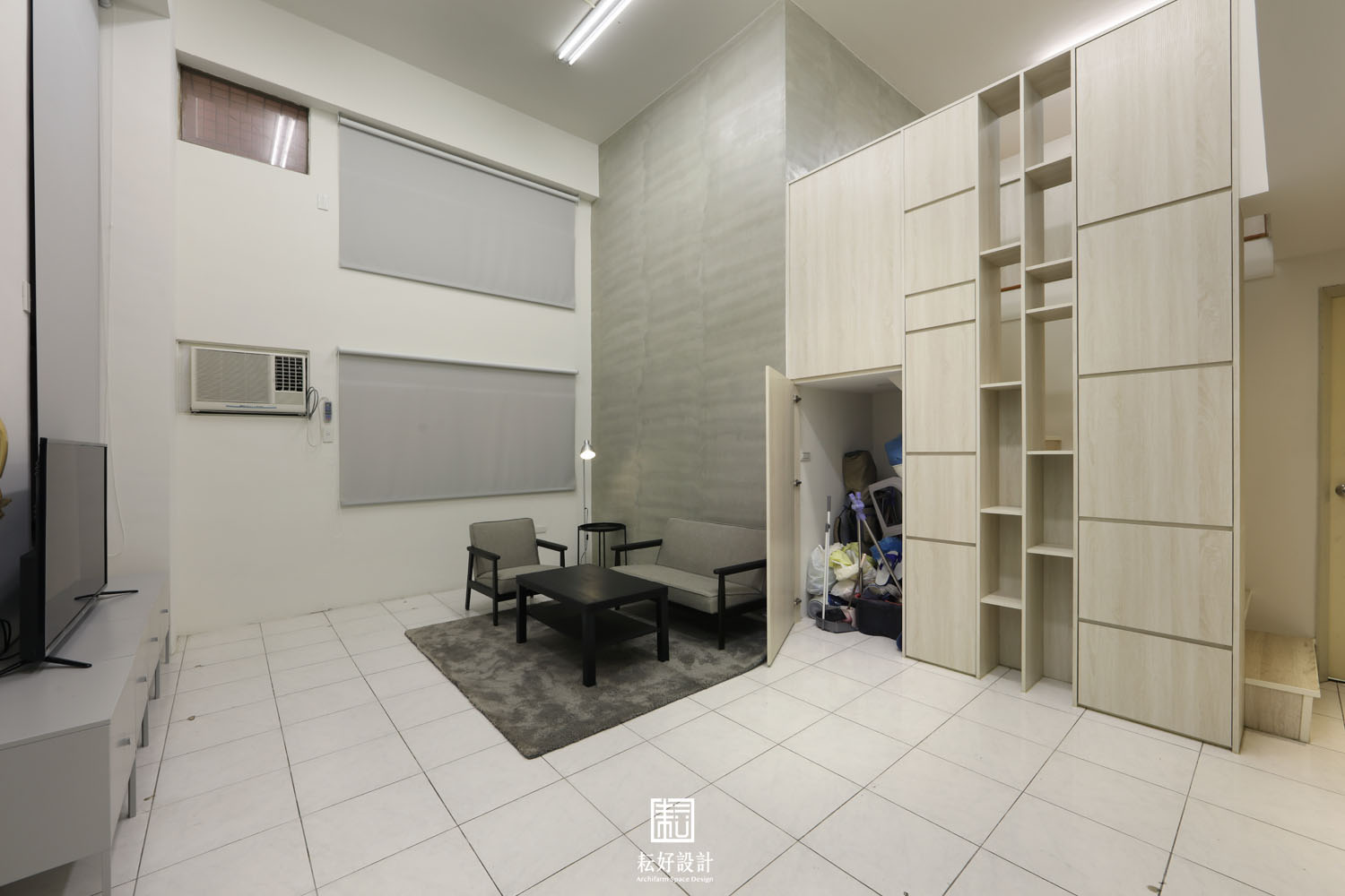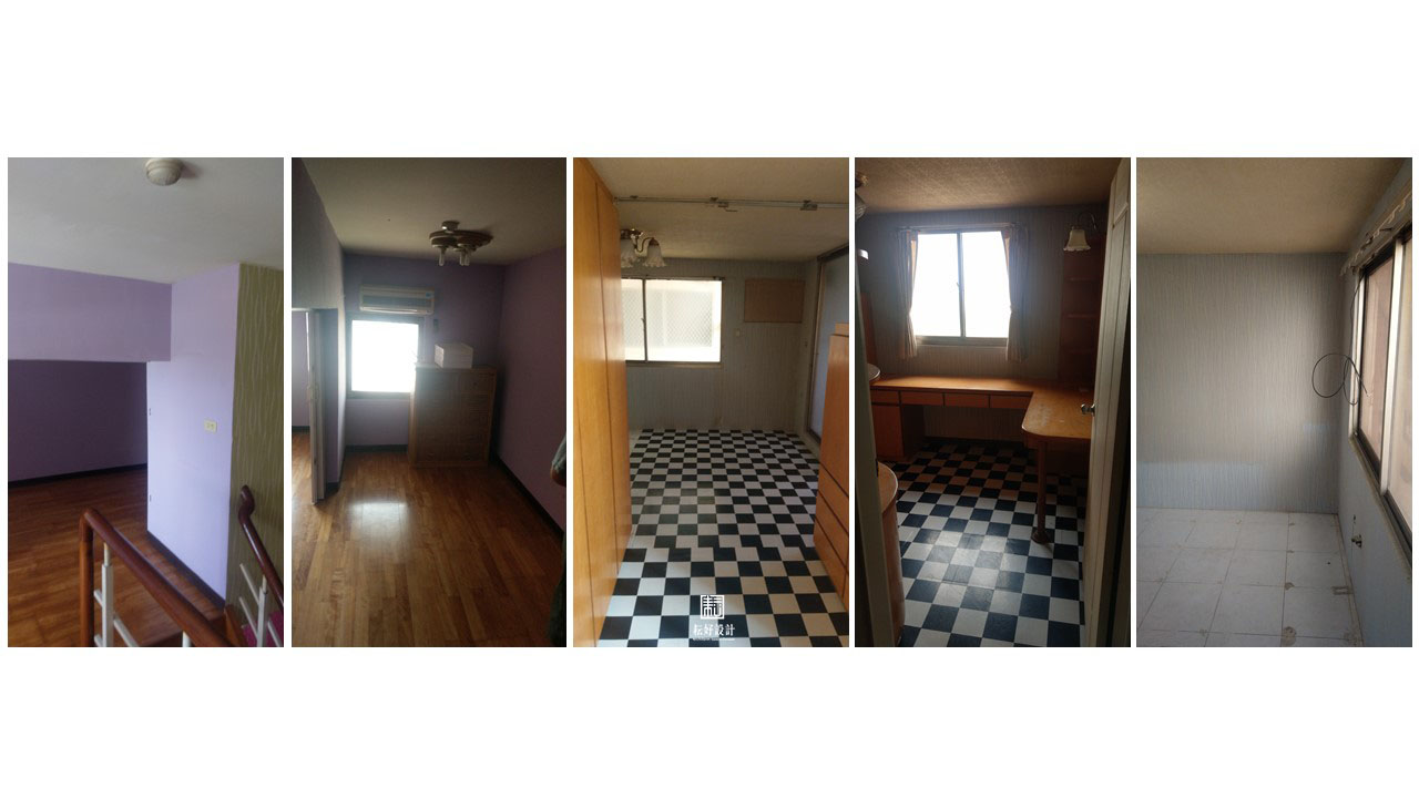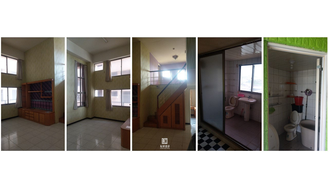 此案是該年代常見的樓中樓公寓戶型,一樓為客廳、廚房、公共衛浴、主臥、主臥浴室、二樓為兩間雅房。既有的裝修櫃體、壁紙、塑膠地板等,已經歷多年使用,狀態不佳,本工程以整理現況為主。此房為業主的起家厝,極有感情,三位小孩也都從小在此成長,因此以保留現況為主、不做過大的更動。
