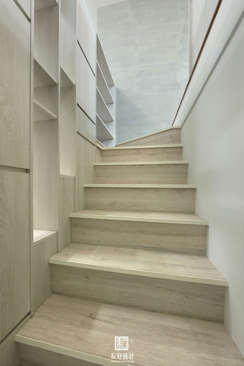 在配置上,我們做了兩次旋轉。一是旋轉電視牆的位置,使得沙發能夠朝向入口大門,增加居家的安定感、也使得電視櫃樣式更為精簡,以大面積的挑高窗扇為視覺主體。接著將夾層的樓梯也轉向,將沙發背牆尺度放大,也使得整體動線更為簡明清晰、不產生過多交錯。新做的樓梯,除了側牆設置展示櫃、收納櫃外,樓梯下方同樣保留儲物空間。