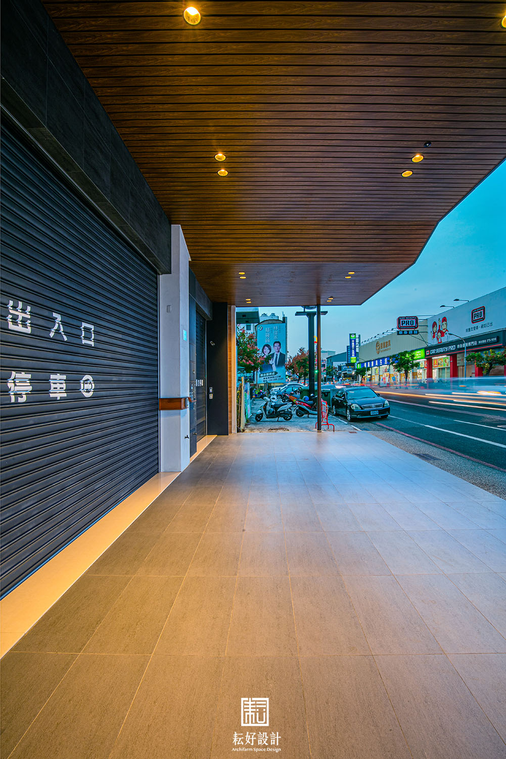 立面雨遮,因其深度及尺寸極大,中央須落柱才能達到最經濟的工法。惟業主考量車輛進出動線,堅持不能設置中央落柱。由此,與結構技師合作,以懸臂系統為主要支撐,兩側立柱增加地面層下之基礎,至此,使得取消中央落柱。