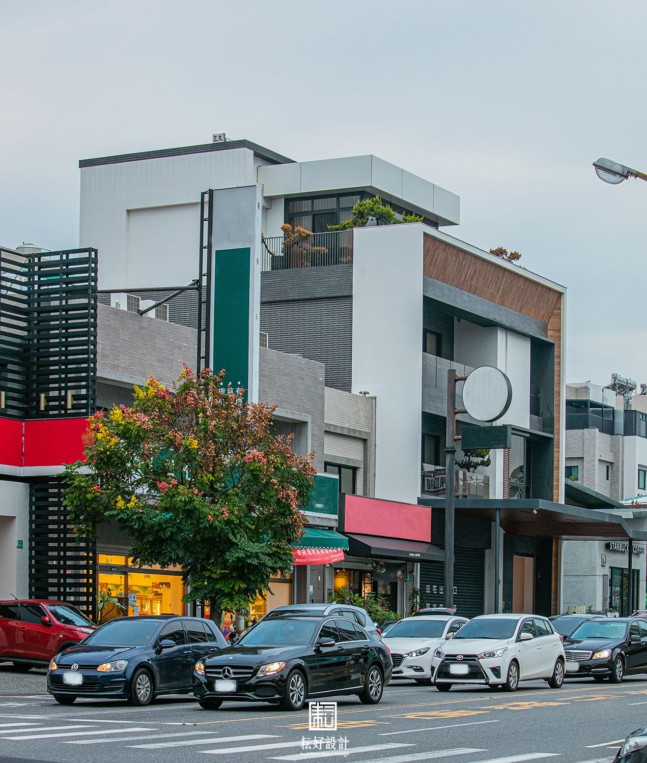 建築矗立於台南繁華的幹道邊,車水馬龍。業主希望於正立面創作一座簡約而有力道的造型雨遮。屋頂層計畫的茶室,同樣希望以簡約的造型呈現,以容納未來空間內的活動。