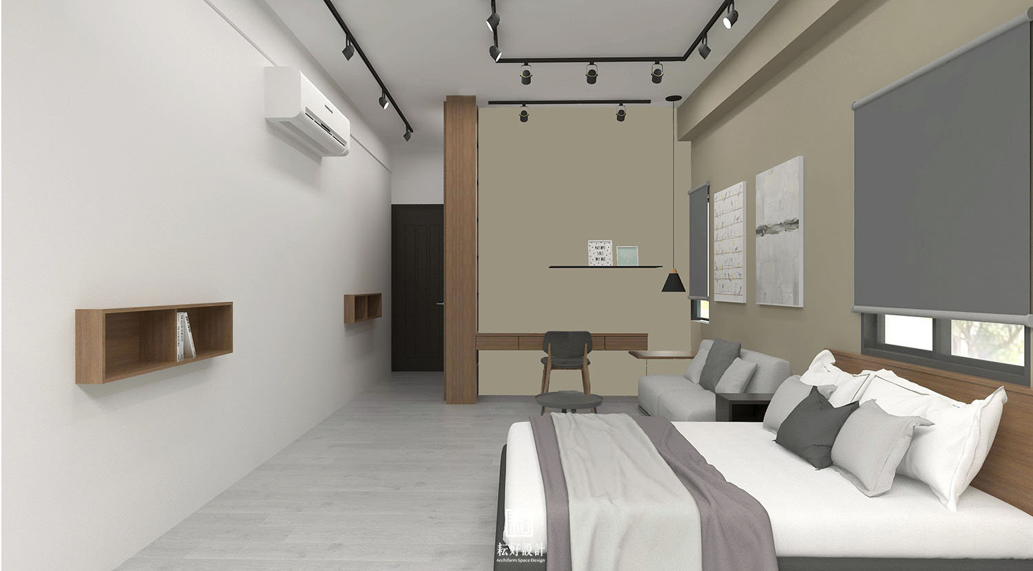 倉儲區可見辦公空間隔間以水泥板施作,搭配地坪粉光,不產生過多色彩。休憩區簡單以單色床頭背牆點綴,家飾部分皆以純白色系,提供簡單的職員休憩空間。