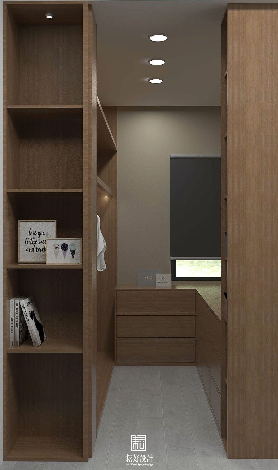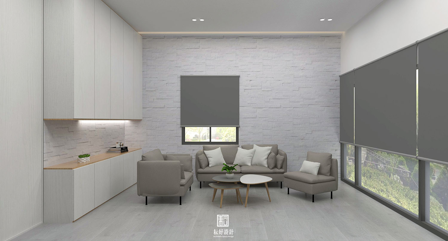 考量到辦公室營運狀況,將室內空間分割為三大塊:倉儲、辦公室、休息室。倉儲區以大型樣品、存料為主;辦公室包含會議空間、辦公空間、茶水間;休息室配置一處用餐區、兩間臥室。
