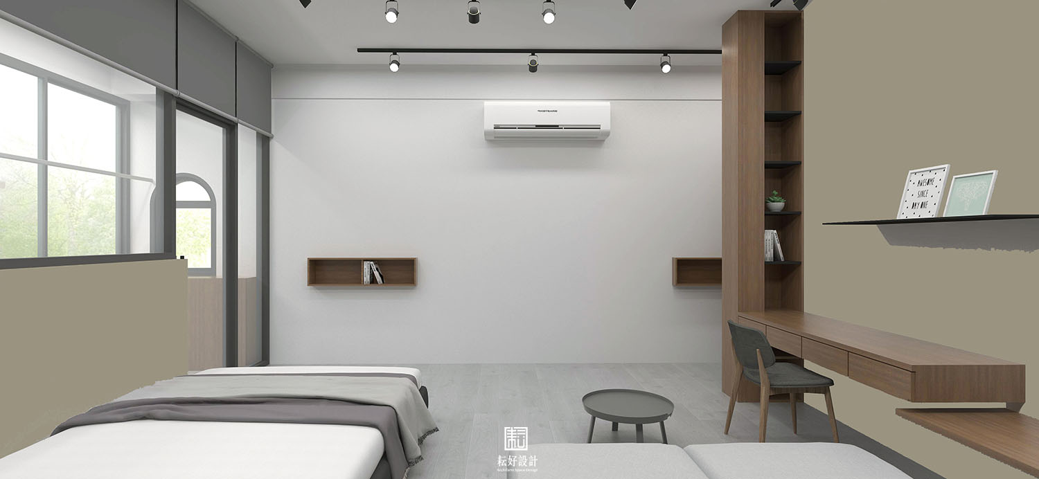 希望呈現簡約卻又不單調的均質空間,地坪維持既有粉光地坪的同時,讓外露的H鋼承擔更多的視覺焦點,以木作水泥板配合木紋線條,為壁面天花兩個面創造相同的分割線條;未免分割線條造成整體空間的雜亂,以白色為空間主調。另一面壁面以素白的壁面及整面白板組成,緩和其餘兩面的線條數量。浴廁空間同樣延續辦公空間的語彙,並佐以大面明鏡,將空間內側線條修飾簡明。茶水間以綠色薄板作為主色調,其餘色彩維持白色,並放置一幅大色塊綠畫,為光線不充足的茶水空間點綴綠意。