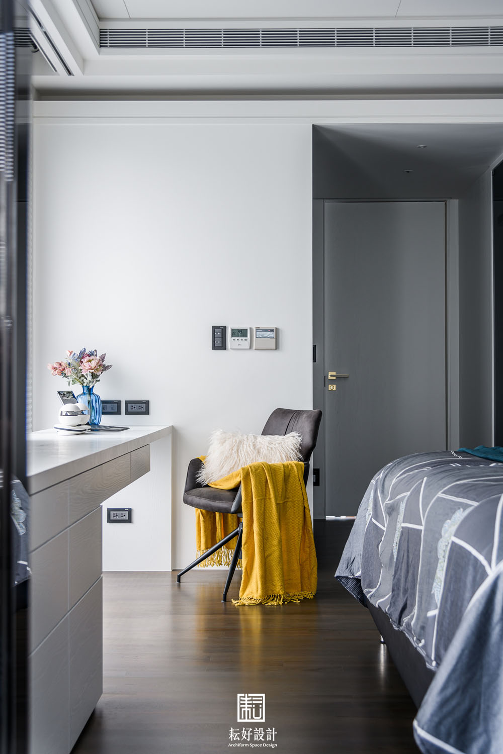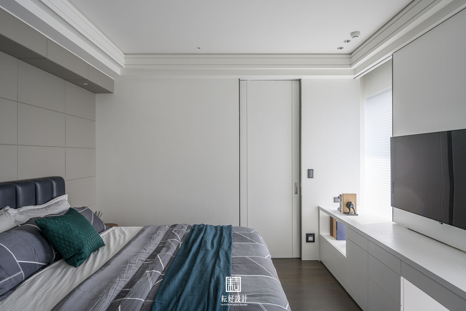 男孩房的選色有著較大的差異,整體空間仍以白色為主,但局部的裝飾則以灰黑色為主。其中的白色,不似其餘空間的實木噴白,而是輔以烤漆,使得空間的底色泛著瑩白光芒,極為細膩柔滑。受限於該處格局,床鋪正對大面開窗,因此以二重奏的風琴簾為使用者提供彈性的光線佈局。晴朗日光透過展開的紗質簾,勾勒出柔和煦人的白色光線,極為宜人。