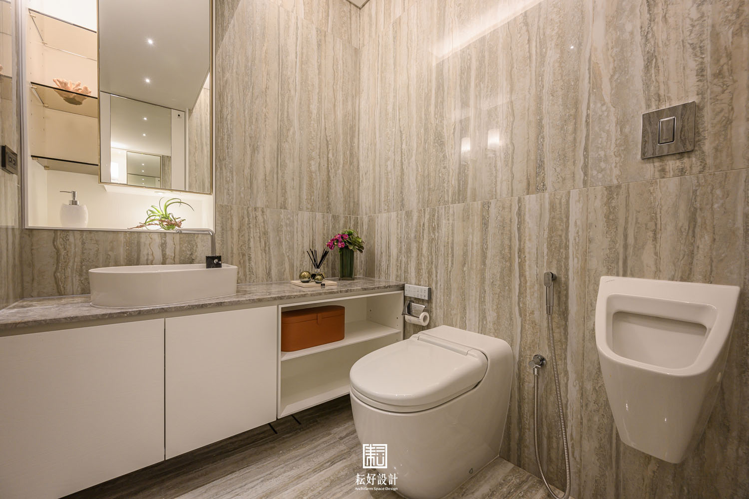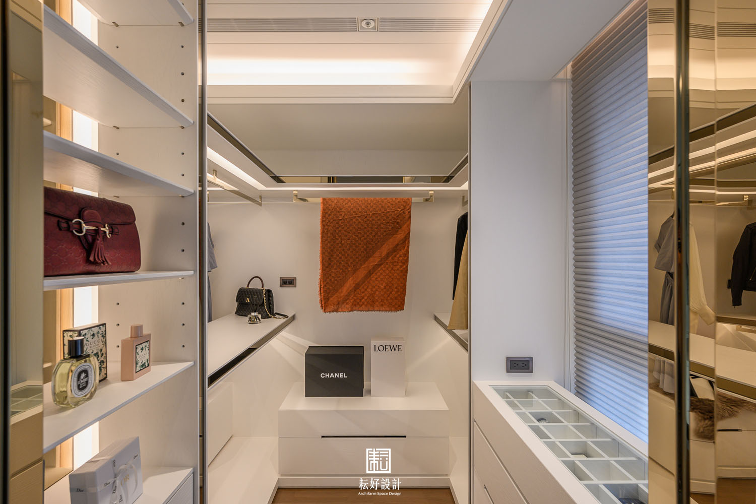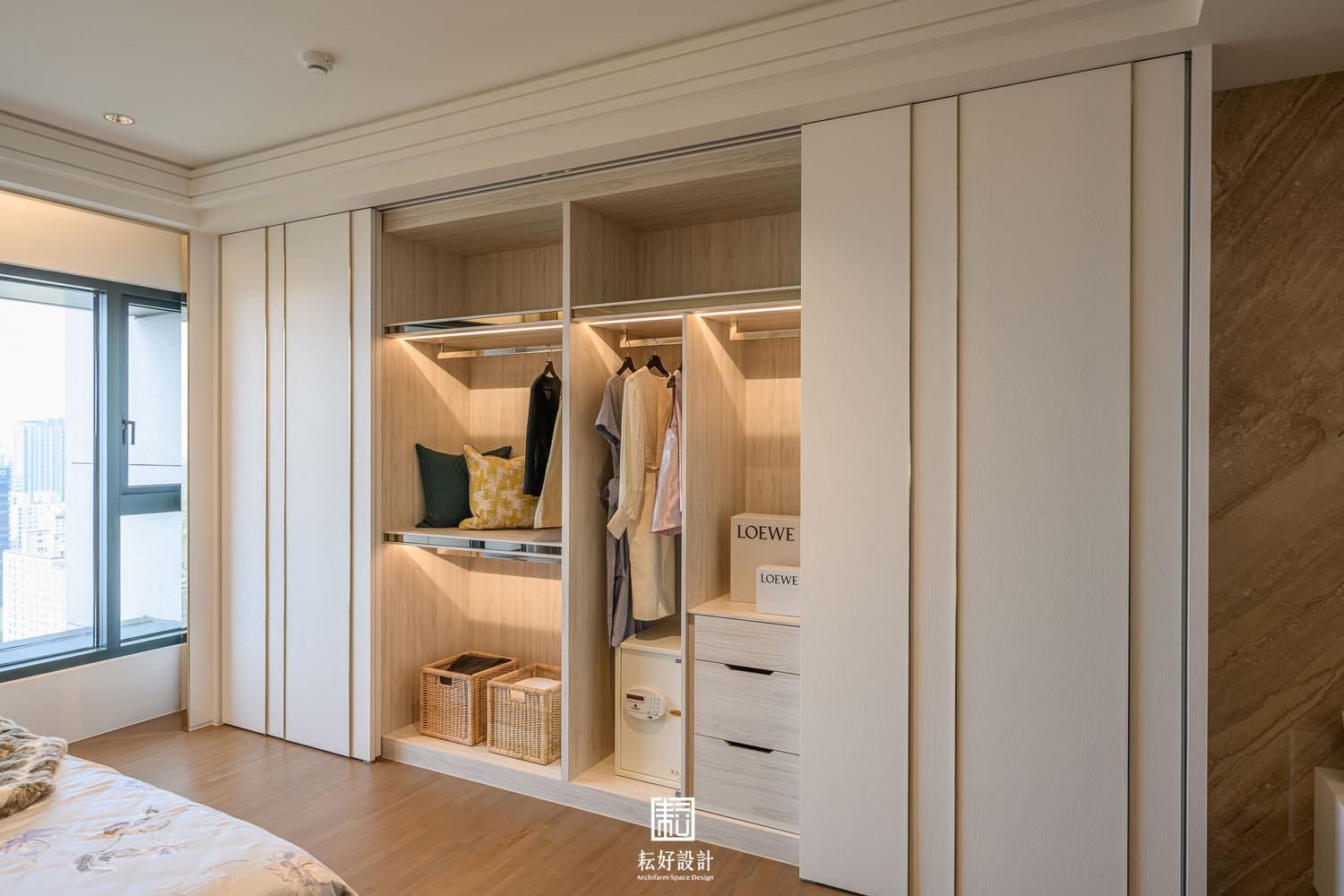 本案鄰近的綠意景觀及高樓層的優勢極為難得,因此在配置上做了詳盡的調整,公共空間區劃了玄關、衣帽間、書房、客廳、餐廳、兩間廚房、以及兩間儲藏室。業主特地加大了熱炒廚房的空間,使其有著完善的使用機能;而輕食廚房的配置也為開放的客餐廳空間提供一處端景。從輕食廚房往客廳落地窗望去,豐富的軸線視野依序展開。因業主的戶型位於雙拼的外側,具備絕佳的景觀視角,三間臥室及三間衛浴皆能向外開窗,尤其是主浴的浴缸處縱覽景觀公園,為業主提供舒適大氣的休息場所。主臥室提供業主完整的使用機能,配置了視聽區、整面牆的衣櫃、衣帽間、梳妝室及浴室,衣帽間、梳妝室及浴室的空間,以語彙相同的橫拉門隔開,為睡眠區劃設了整潔的立面空間。女孩房的使用面積較小,卻仍與主臥有著相同的豐富機能,衣帽間、梳妝室,以及業主女兒特別強調的展示空間,為其長久來的收藏提供亮相的機會。男孩房的空間較為單純,有著衣帽間及開放衣櫃。