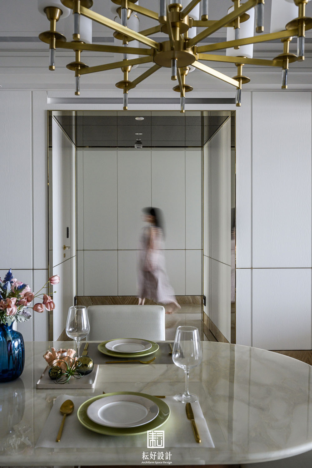 在風格上,以現代古典的風格去塑造空間,盡最大的努力讓空間顯得端莊素雅不過於繁複。整體以白色為主,藉著極薄的金色飾條,勾勒出素淨的背景。每處天花與壁面的銜接處、每處樑下空間,皆以最細緻的造型及工序處理,包含數道層疊的造型板或線板尺寸的調整,以使天花在高層建築的樑柱限制下達到罕見的淨高度,除水平空間的開闊視野外,垂直高度的氣勢也不落人後。空間過渡的通道門、拱門、廊道,以及幾處展示櫃體,則以較突顯的色彩搭配。玄關及書房通道門的金色框架被細分成數塊的茶玻,豐富了電視牆面的視覺感受。客廳、餐廳、輕食廚房的過渡區拱門,則以黑色的咖啡絨石材及仿古茶鏡,塑造出兩座大氣的大拱,除創造了空間的焦點外,也讓使用者忘卻其為高層建築的堅實結構,輕食廚房的拱門尺寸經過細緻的調整,遮蔽住輕食廚房的廚具高櫃,卻又不至於與前方的拱門產生不協調的氛圍。通往臥室區的通廊,隱含著一處公共廁所及儲藏室,藉著木作及石材的造型細節,使得兩處空間皆不明顯,看似通道空間的兩座屏風。整大面的倒吊仿古茶鏡除了延續外側大拱的元素及氛圍,也藉著尺寸的調整,極好地隱藏大橫樑的存在,也鋪展開了臥室區過道的氣勢。越過了左右兩側屏風,進到三間臥室的過廊時,挑高的天花除呼應公共空間的天花造型外,也使得這處動線有著極罕見的氣勢,不因其通廊的空間性質而狹窄不適。