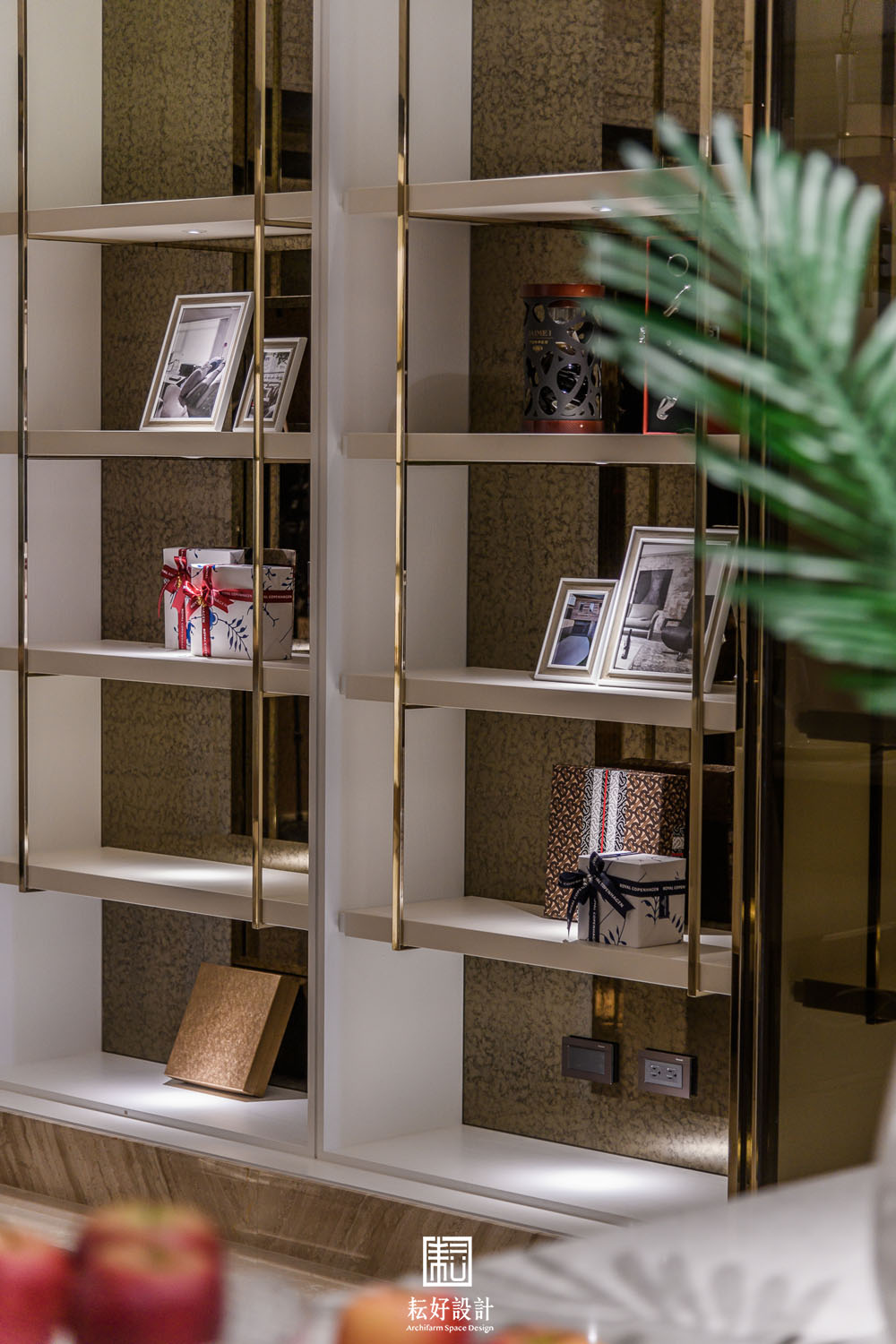 幾處較顯眼的端景,則以相同的材質或色彩搭配,藉著造型上的設計,使其不過於喧囂,卻又吸引目光佇足。玄關衣帽間的造型櫃不似傳統櫃體,數層長向的造型層板為其上的鞋款或包款提供一處特色的展示台。客廳電視牆的石材過渡到米黃色地坪不過於突兀,電視背襯暗色石材,使其融入至電視牆的造型之中。客廳後側高櫃除顯眼的直紋玻璃及金色格柵外,開放的層板櫃以白色實木皮搭配白色壁紙與白色皮革,豐富的材質紋理卻有著相同的顏色,呼應了空間低調而細膩的風格,上述的手法也延續到了書房的書櫃之中。餐廳的展示櫃是本案較為突顯的端景,材質多樣造型也較為繁複,為業主提供了重點展示的空間。輕食及熱炒廚房的裝飾是簡單的,只以整面的烤漆玻璃或琺瑯鐵板包覆,但輕食廚房的中島除了美麗的紋理外,大跨距的空隙則創造了一處簡單卻也吸睛的用餐背景。