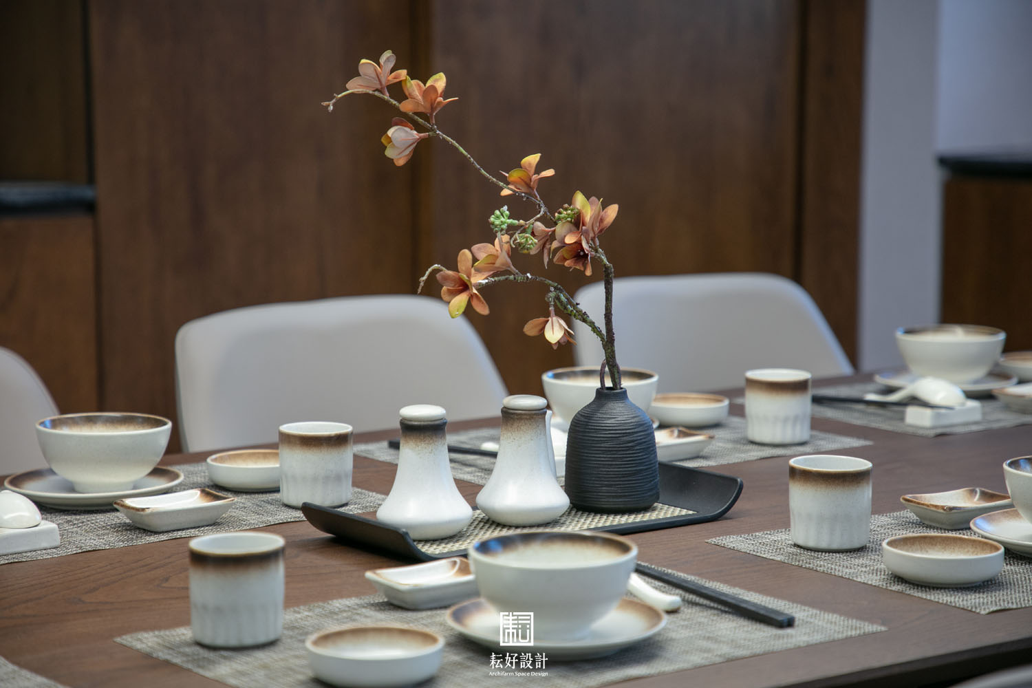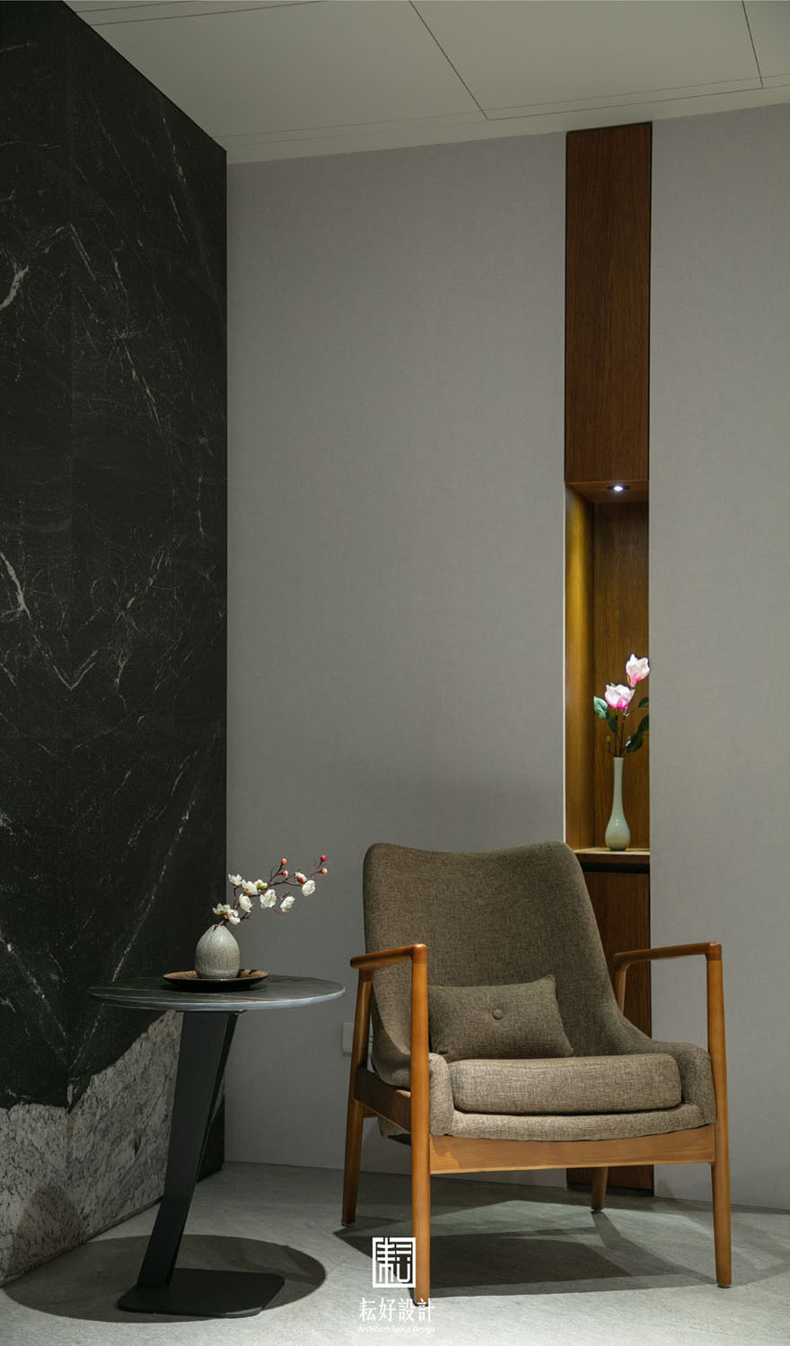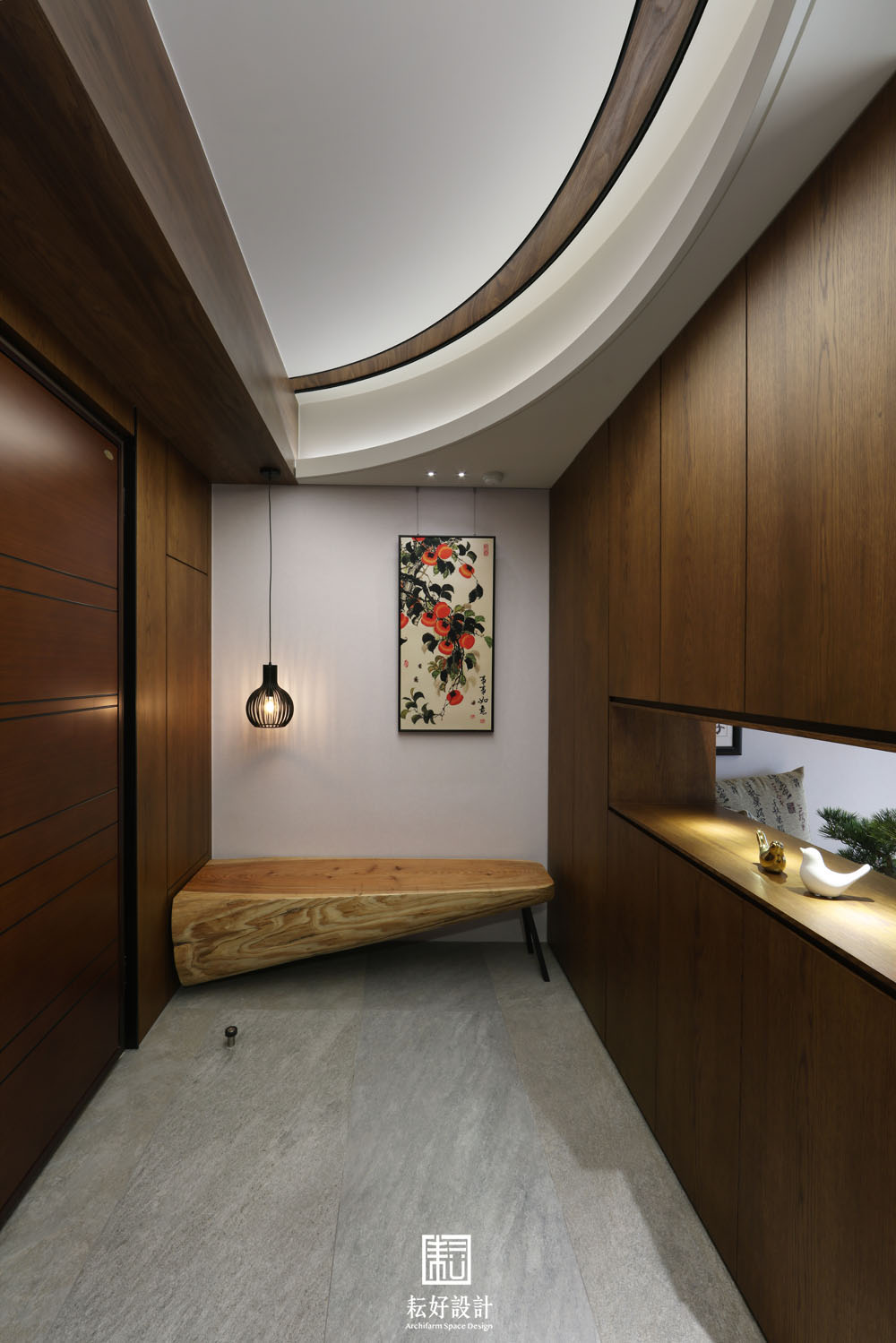 軟裝佈置不見常備綠色植栽,借景窗外即可,反倒是多配置繽紛的花果枝枒,增添室內的人味。搭配的擺件字畫也以禪風為主,使室內空間有極為一致的調性而不過於喧嘩。