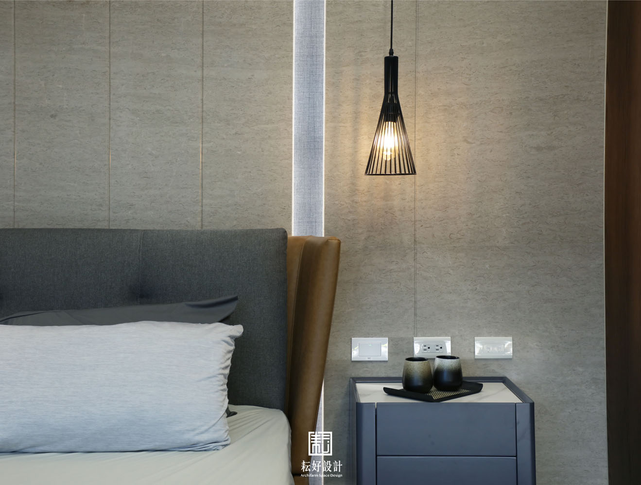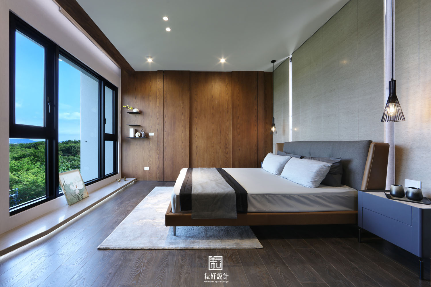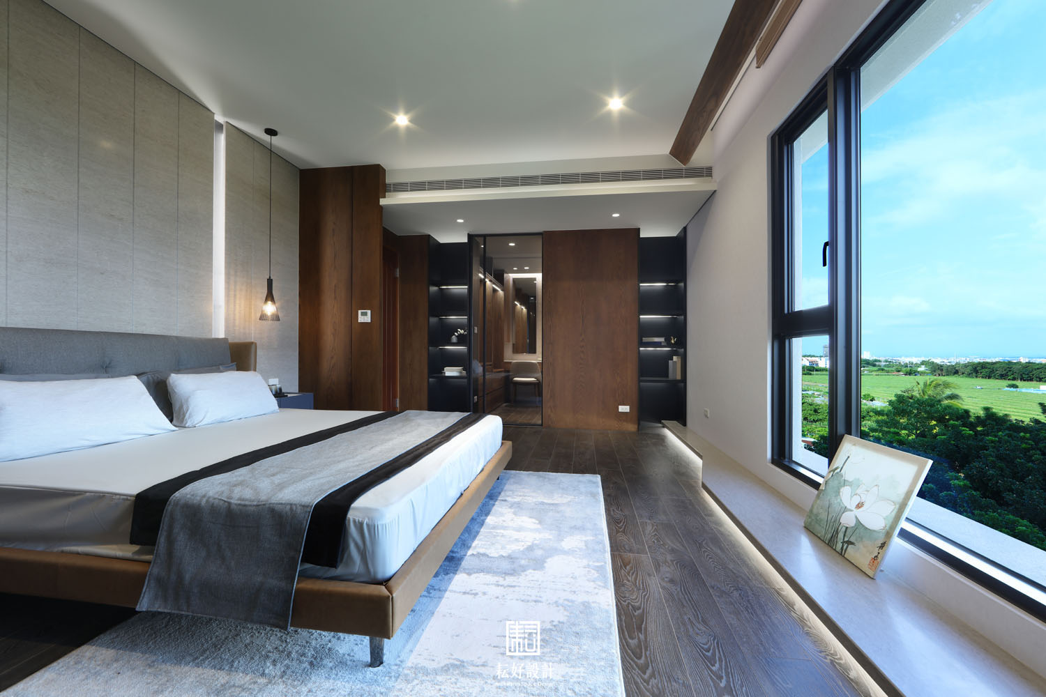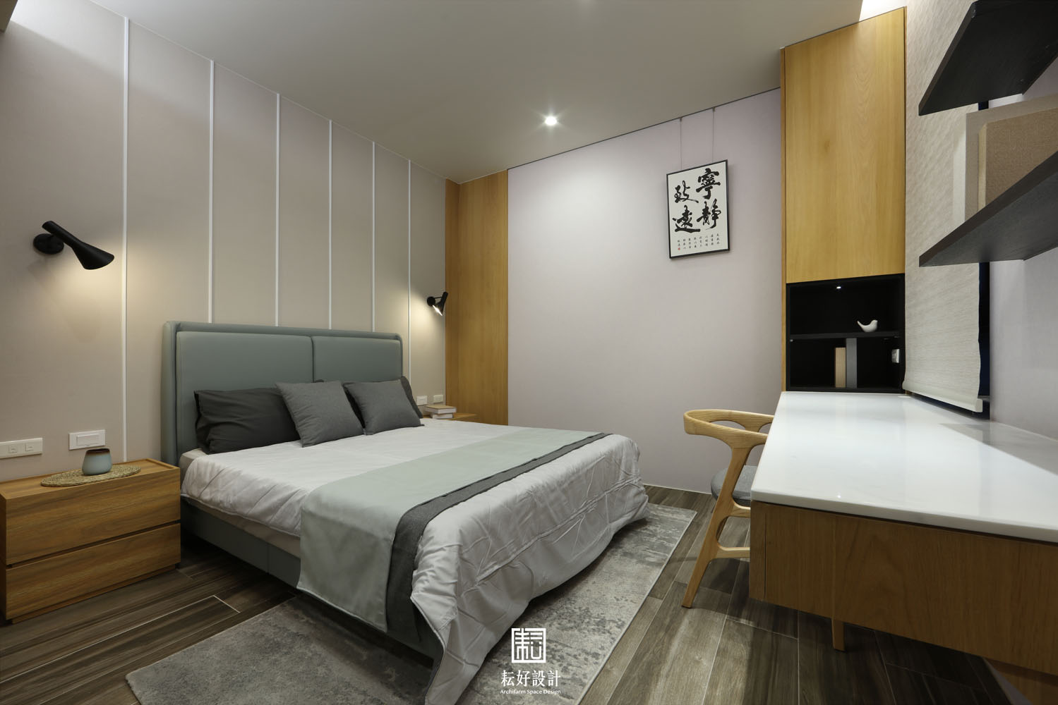 此案有極佳的外部條件,室內無須造景,而以引景入室為規劃的重點。整體氛圍以日式禪風搭配建築外觀的語彙,塑造寧靜、祥和、溫潤、人文的氣質。以木材及石材為主要材料,減少光亮面的色澤以符合整體材質質地。客廳的電視主牆,以建設公司欽點輕井澤施作,將大筆的白墨筆劃拼接為連綿的山巒,與窗外綠景相映成趣。主臥背牆以垂直溝縫修飾新灰姑娘的均質紋理,為主人房帶來暖心的居住體驗。兩間臥室則大面使用橡木原色與米白的壁紙,空間雖小,卻不產生壅擠的氛圍。