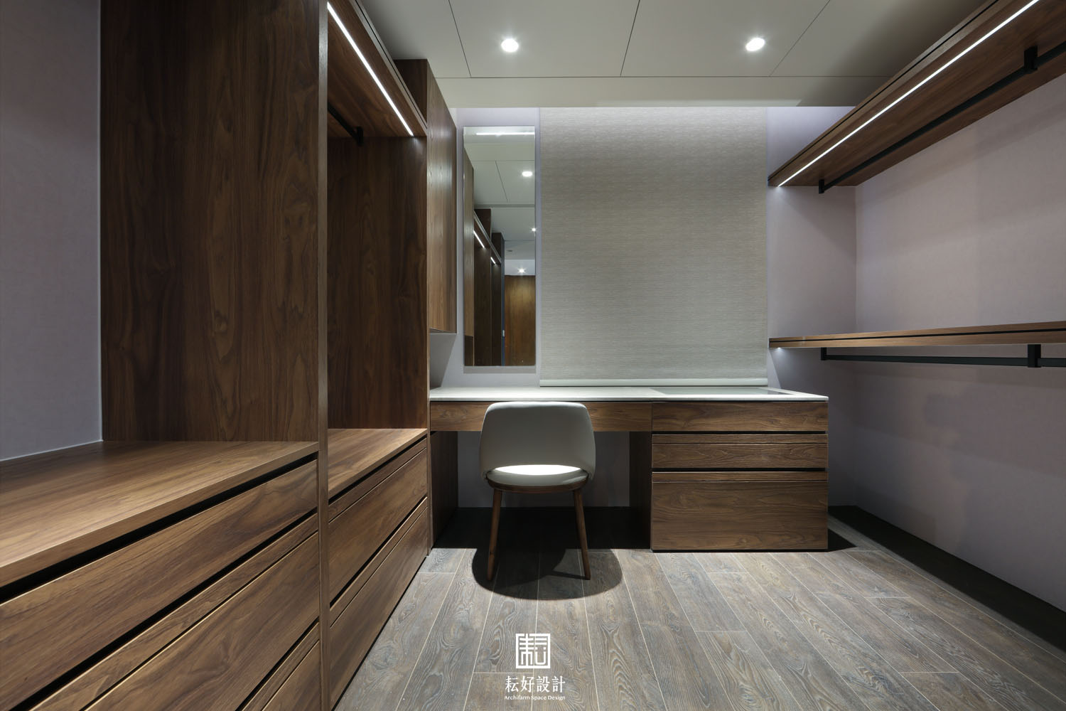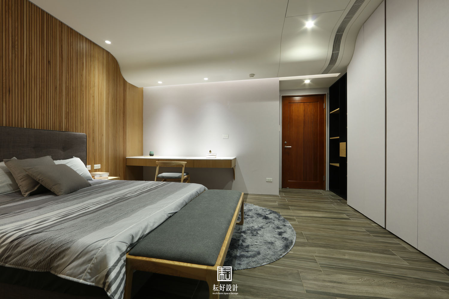 主臥內除更衣室外,並留設一處按摩椅空間,大面開窗前不設置電視矮櫃,將完整窗景留作主臥的最有價值的藝術品。臥室一及臥室二微調隔間牆位置,為兩間臥室皆設置大尺寸書桌,提供完整的臥室使用機能。
