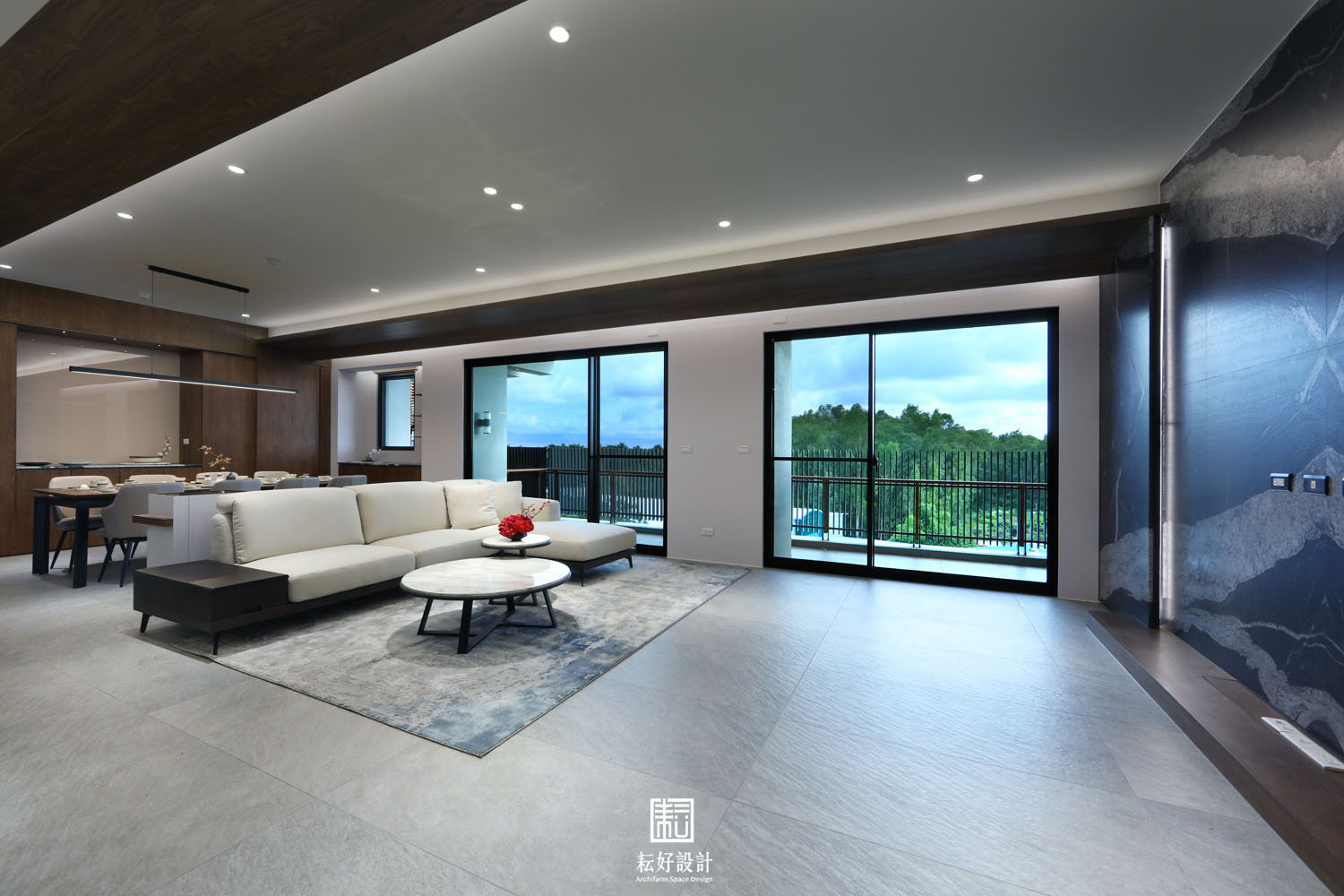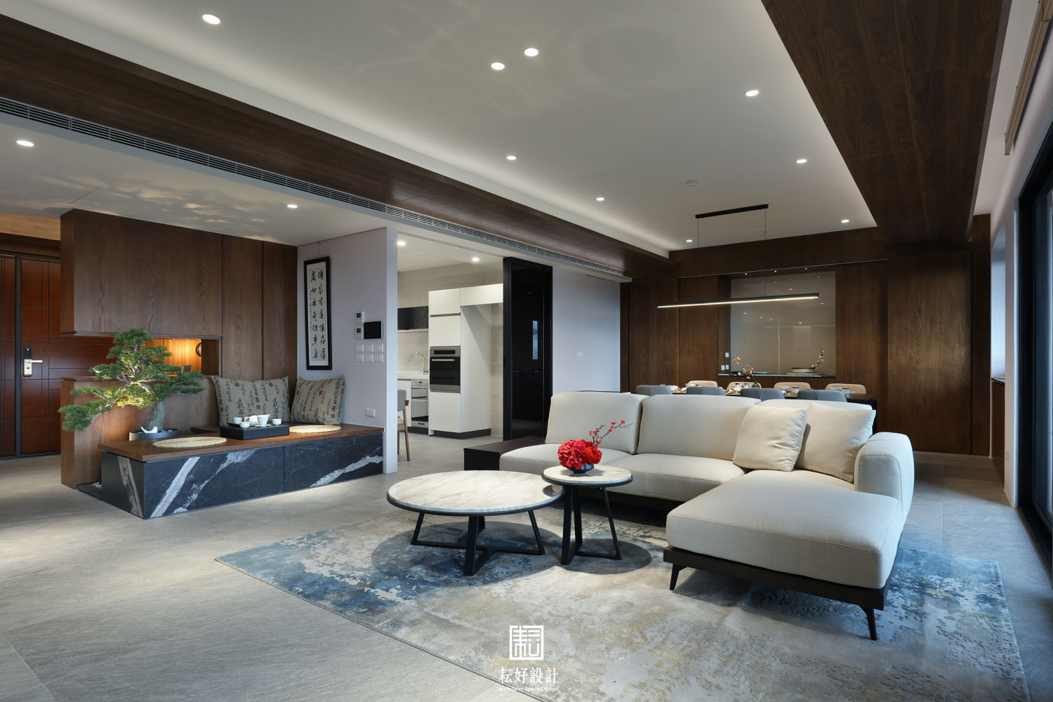 踏入大門,以一堵半遮擋的櫃體,為其後的萬坪綠景妝點出欲語還休的期待感。玄關處配置有充足的收納空間,右側儲藏室兼作室內環控、客廳影音的設備空間。移步換景後的客廳餐廳連貫成整體的大氣空間,此時回看入口處,公共空間的中心地帶是低矮臥榻搭配飄型的仿真羅漢松,沒有過於突兀的量體,以突顯整體空間的空靈氣質。廚房、洗衣工作間皆以簡潔的線條收斂,藉此強調客餐廳空間的整體性,塑造大氣的one room公領域空間。廊道兩側分別是主臥及兩間臥室的入口,皆以橫拉門隱藏住視覺的窺探;為賓友來訪時提供完整的接待空間、使私領域與公領域之間的活動不至於互相叨擾。特別調整臥室一二入口玄關的位置,將客廳電視主牆尺寸放大,冀望為此案塑造更為闊綽的視覺質感。