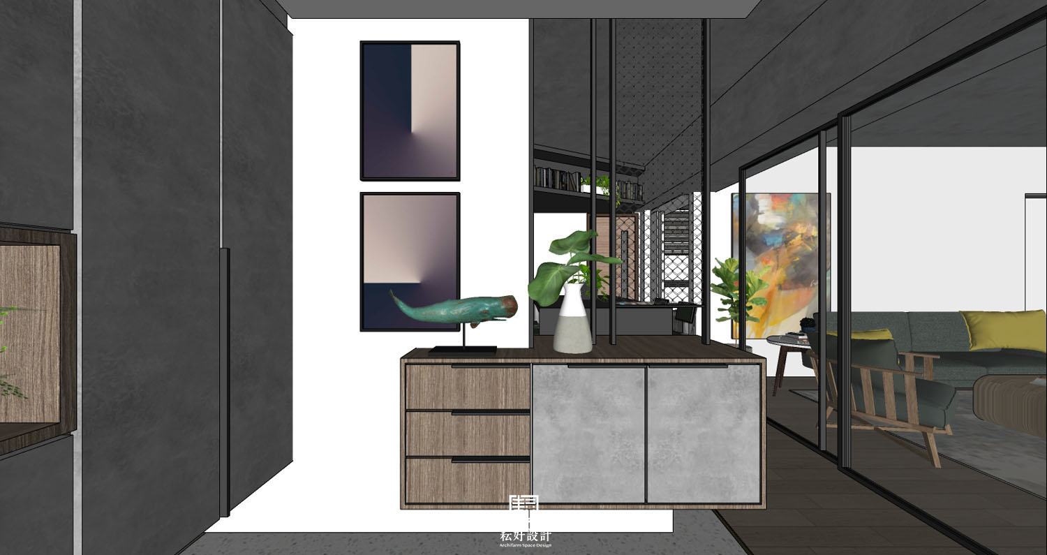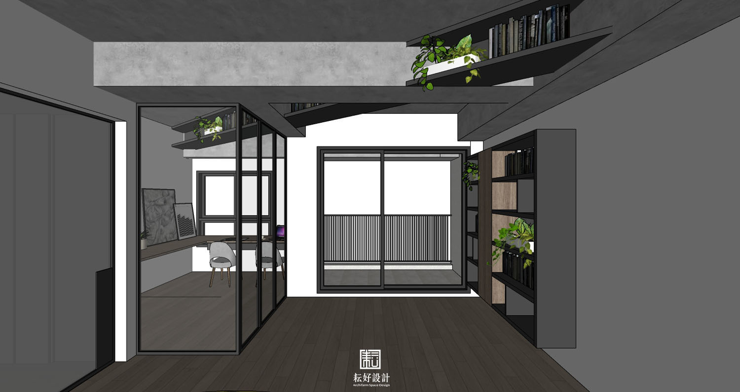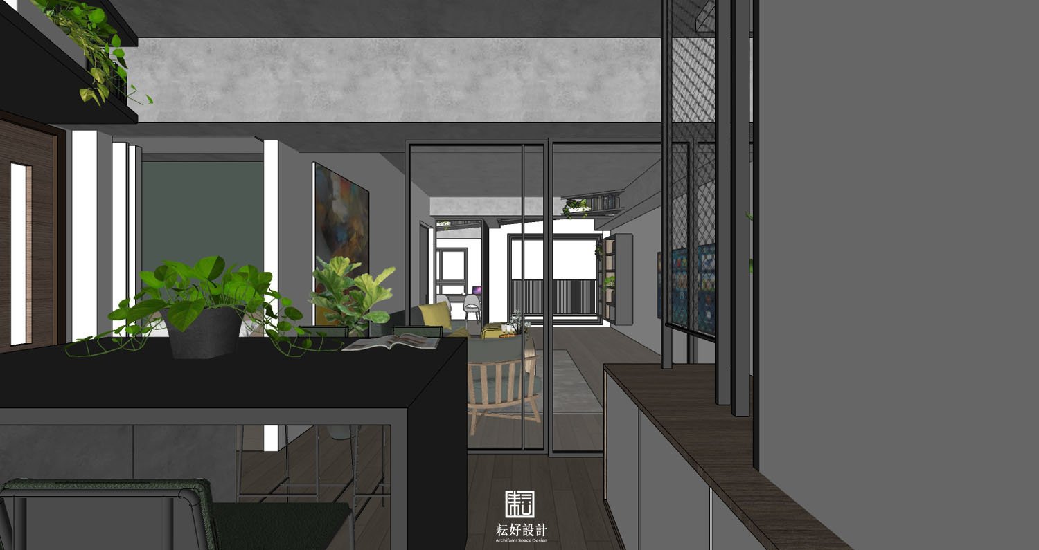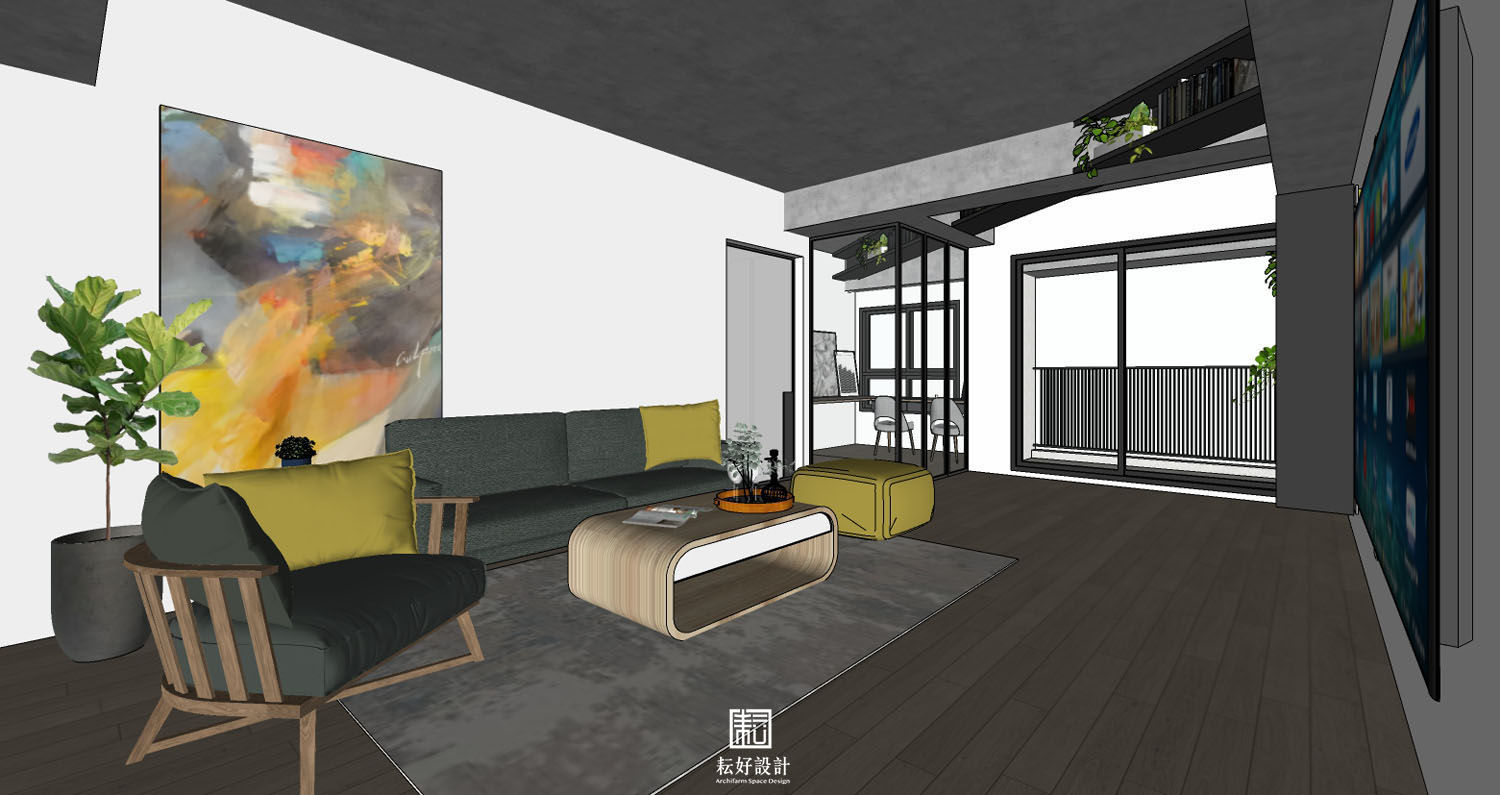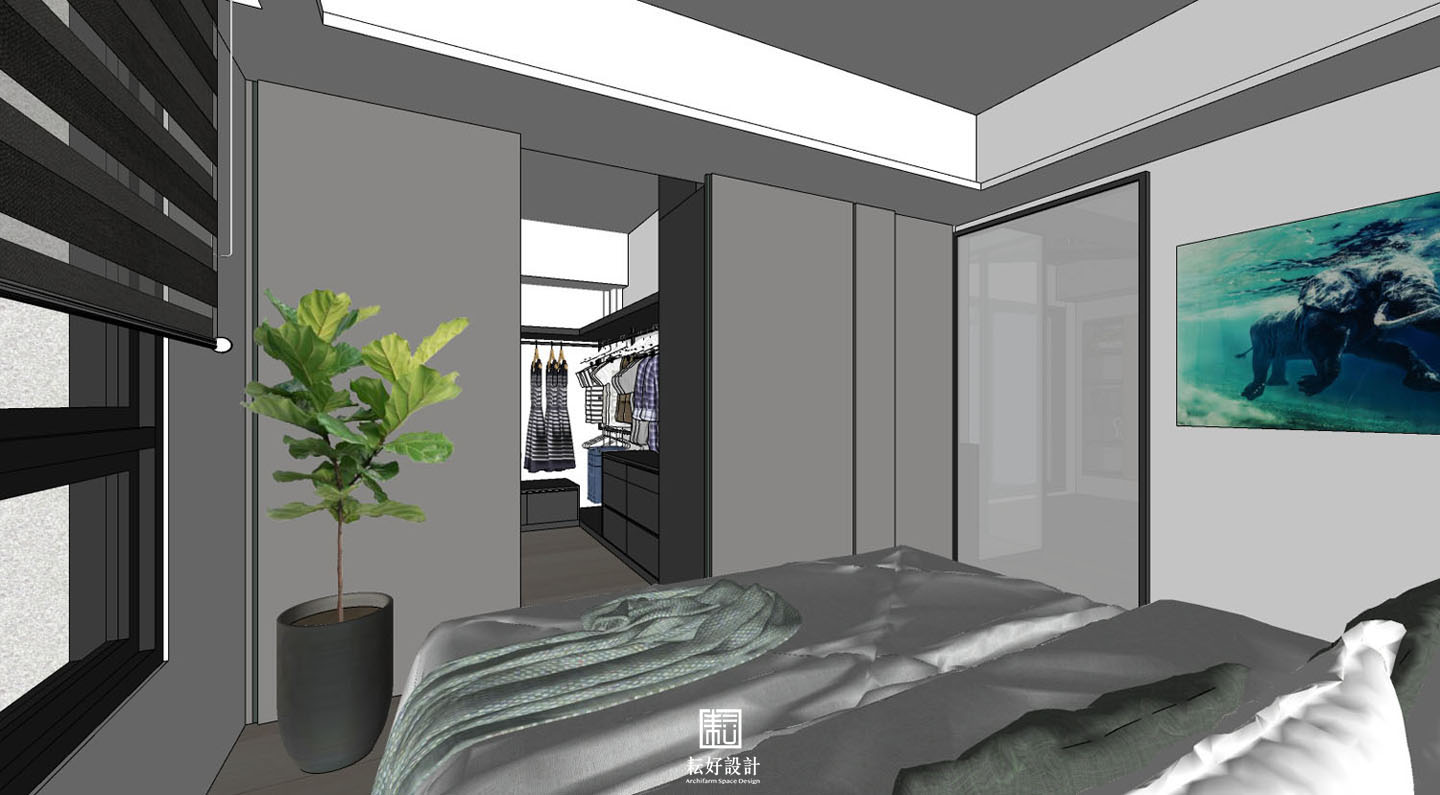 業主喜好工業風,喜好不那麼溫暖的工業風。因此主要元素以:白漆、樂土、仿水泥板、消光黑烤漆等灰白黑色調組成;只特別在主臥、客臥等私密空間以墨綠的跳色點綴床頭。在空間的中心電視牆處,也不擺置設備矮櫃等物件,沙發正對的牆面,壁掛一台電視、一組soundbar,其餘的零碎物品都收納至左側的懸吊櫃中,創造極為清爽、極簡的生活重心。