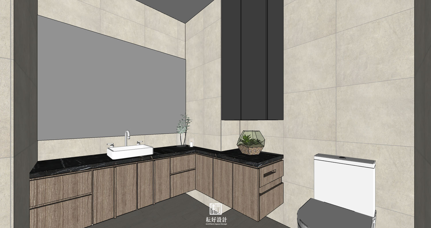 業主依據自身使用狀態,將三房修改為兩房,其中主臥另規劃更衣間。客餐廳間以透明玻璃拉門區隔,維持室內的開闊視野。客廳底部另規劃工作間,設置深桌面,供業主進行閱讀、模型、3C等興趣的作業空間。為展示業主收藏品,另參考厄瓜多設計師Aquiles Jarrín的案例,於天花設置兩組45度斜角展示櫃,也達到實體串聯空間的效果。主臥浴室將原有浴缸移除,擴大檯面尺寸,塑造出更為大氣的居家空間。