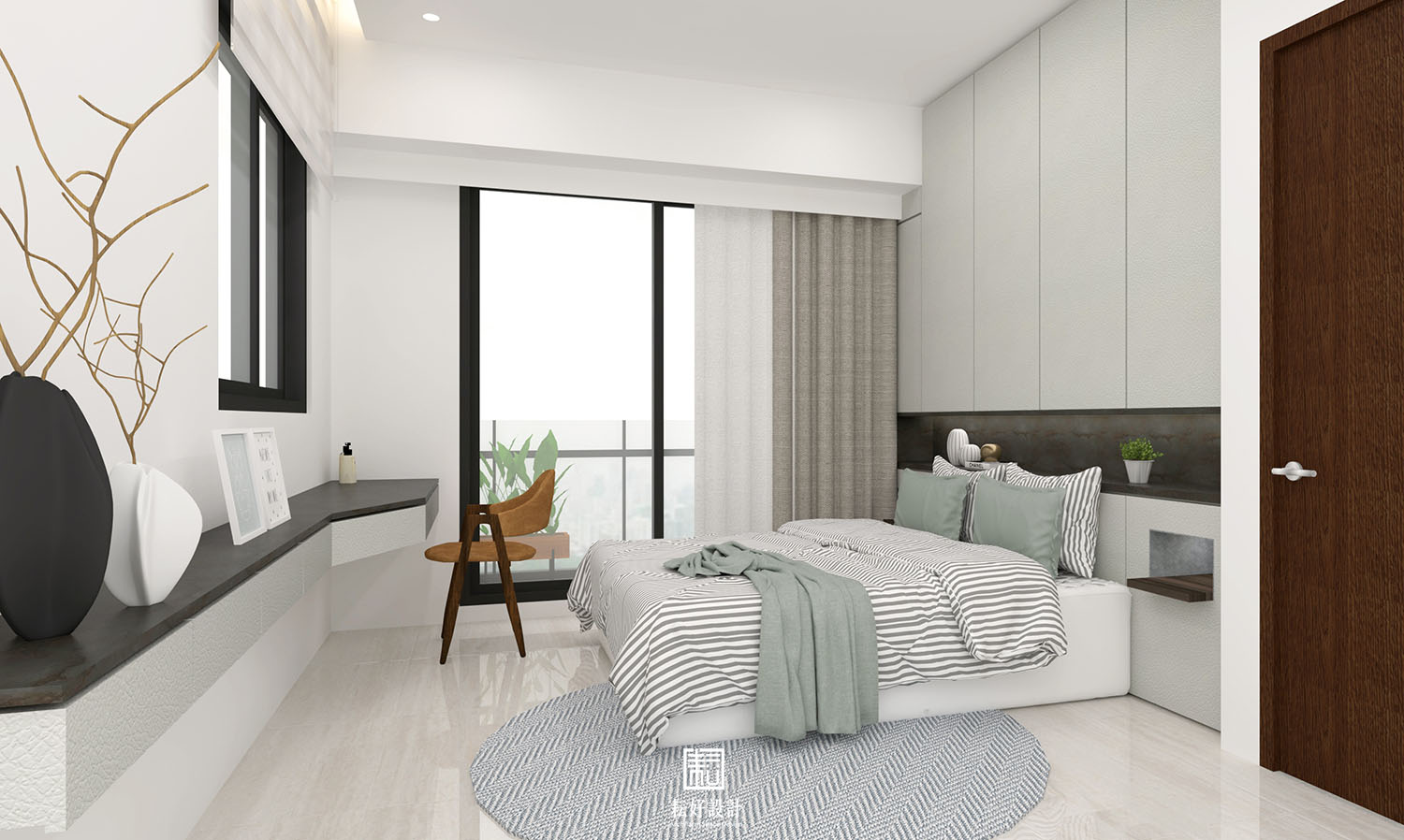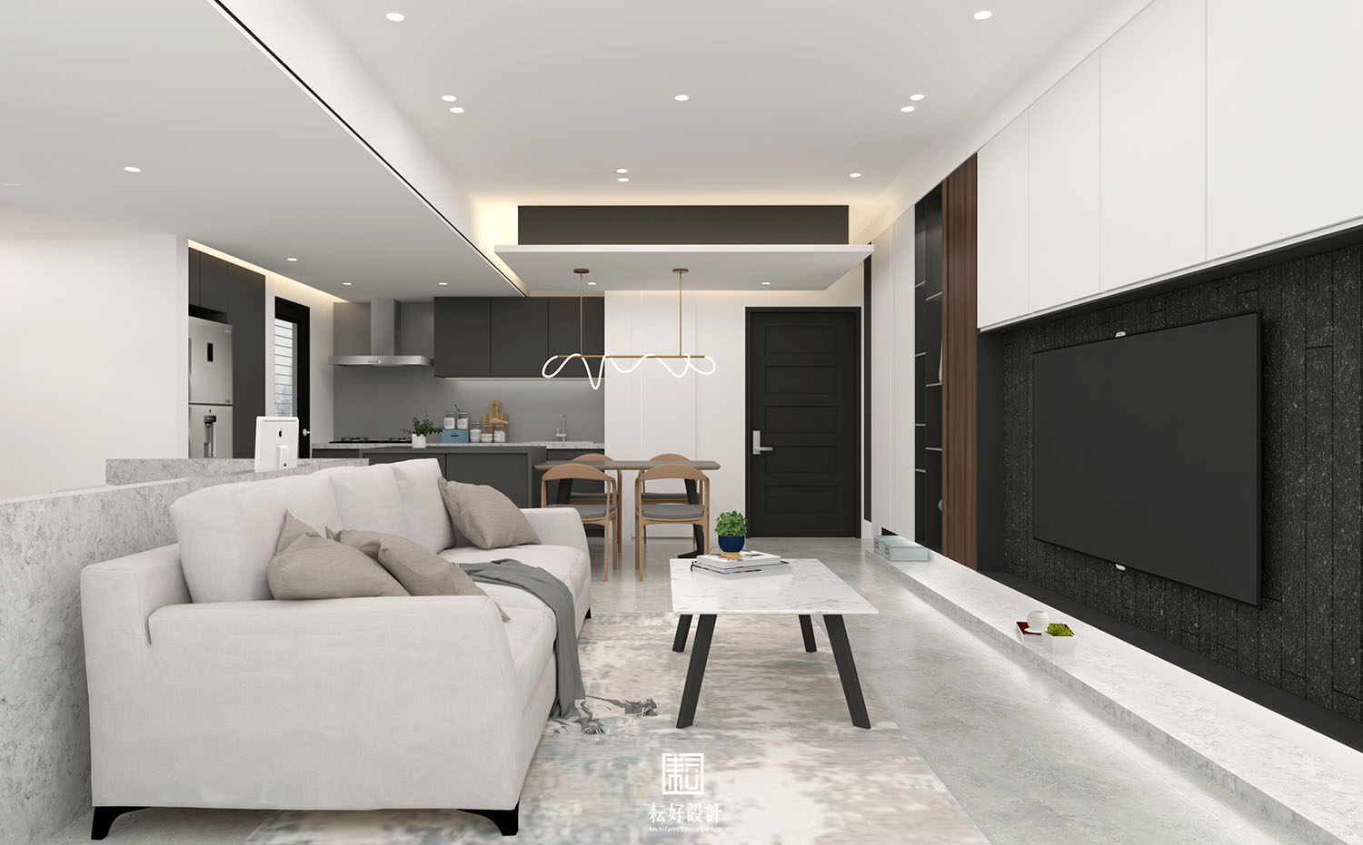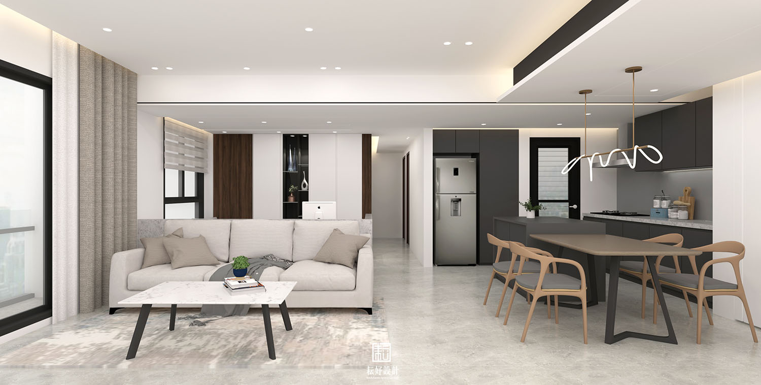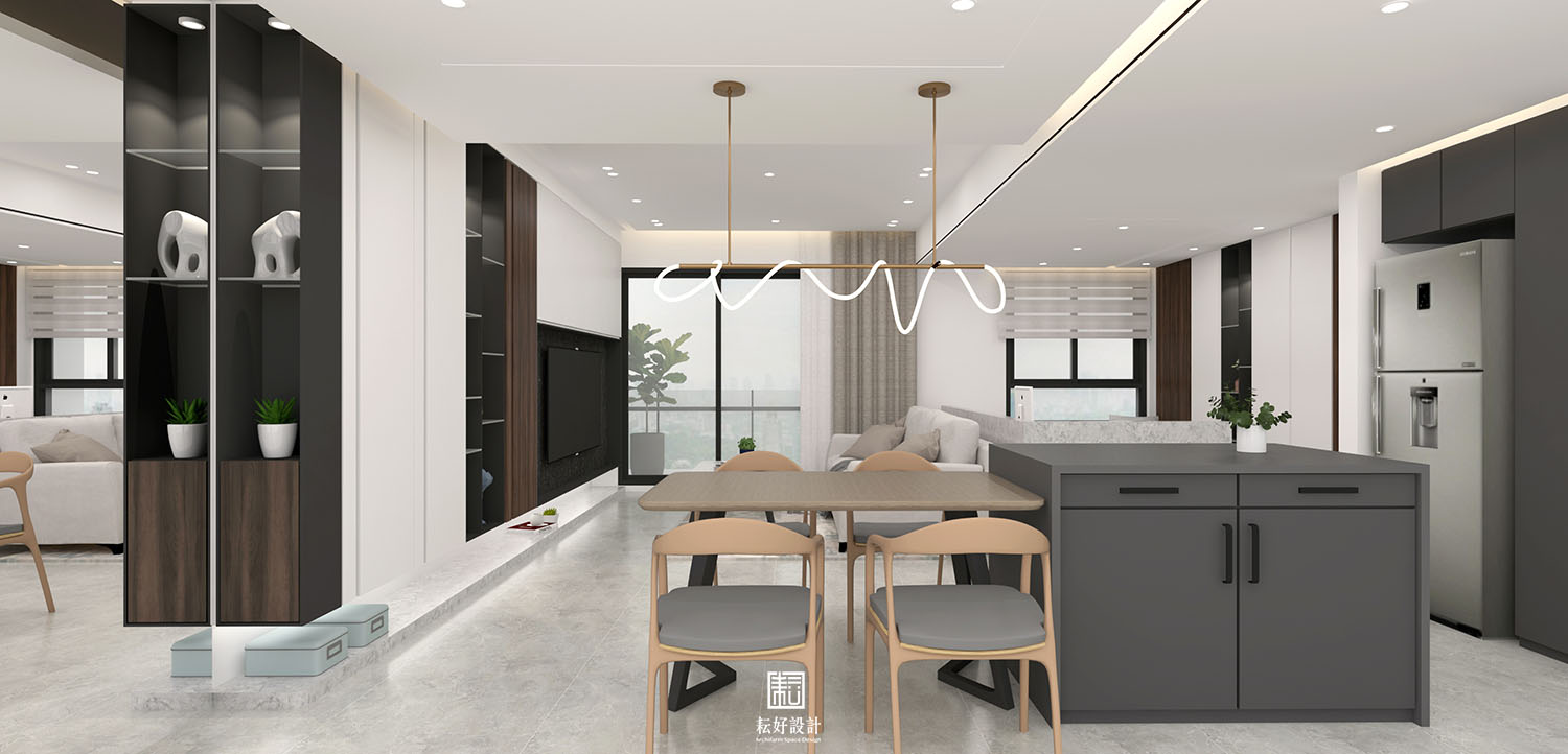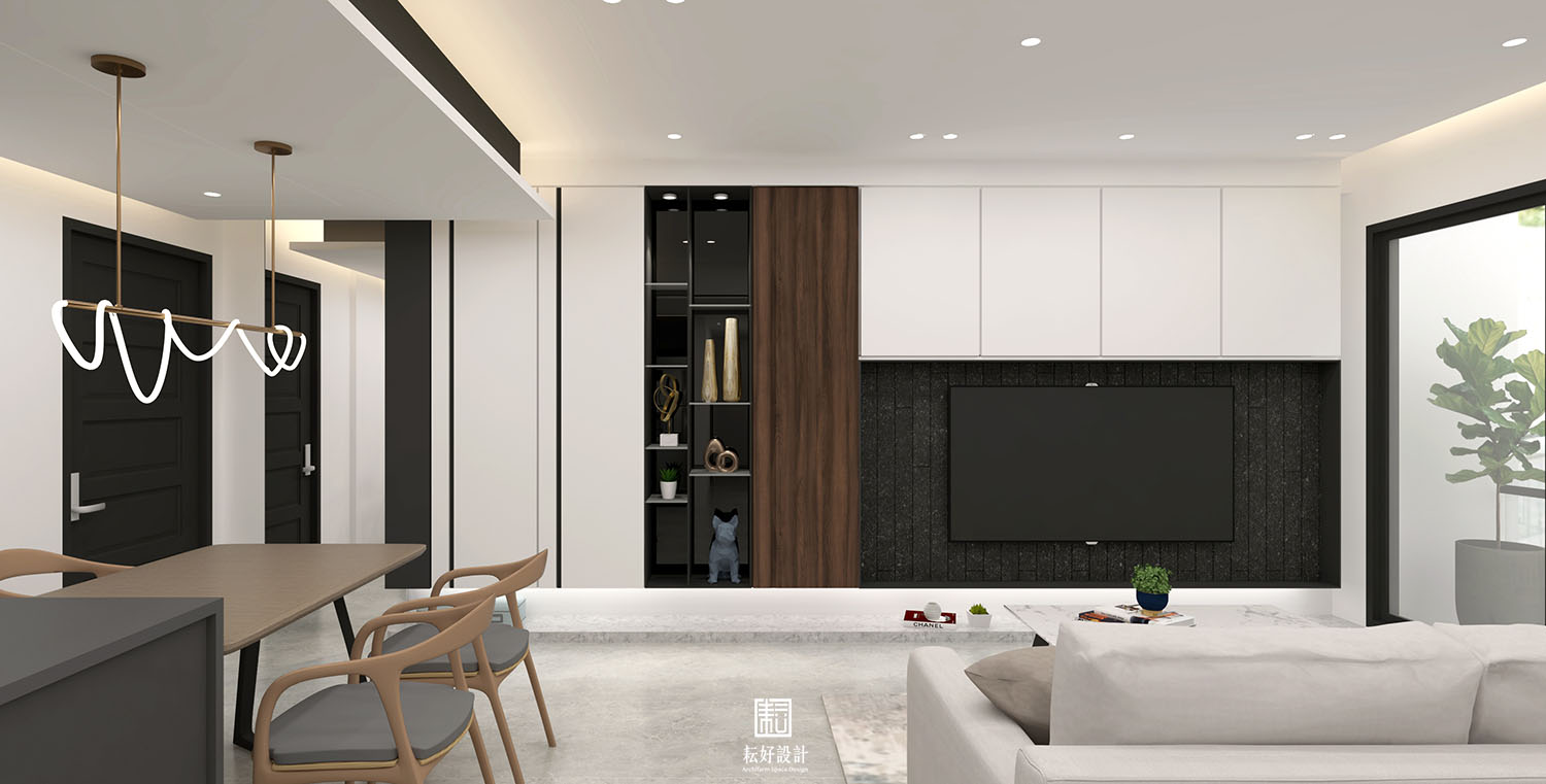 我們以內斂的白色為基底,搭配較深沉的碳化木、黑色鐵件、深黑長型石紋磚,塑造沉穩內斂的質感。另使用亮灰色系的天然石材,與上述材質形成白灰棕黑的漸層式顏色過渡,沉穩中仍能產生材質的交錯。主臥及次臥延續同樣的配色,於造形上有些許調整,使室內整體空間能具有一致的氛圍。