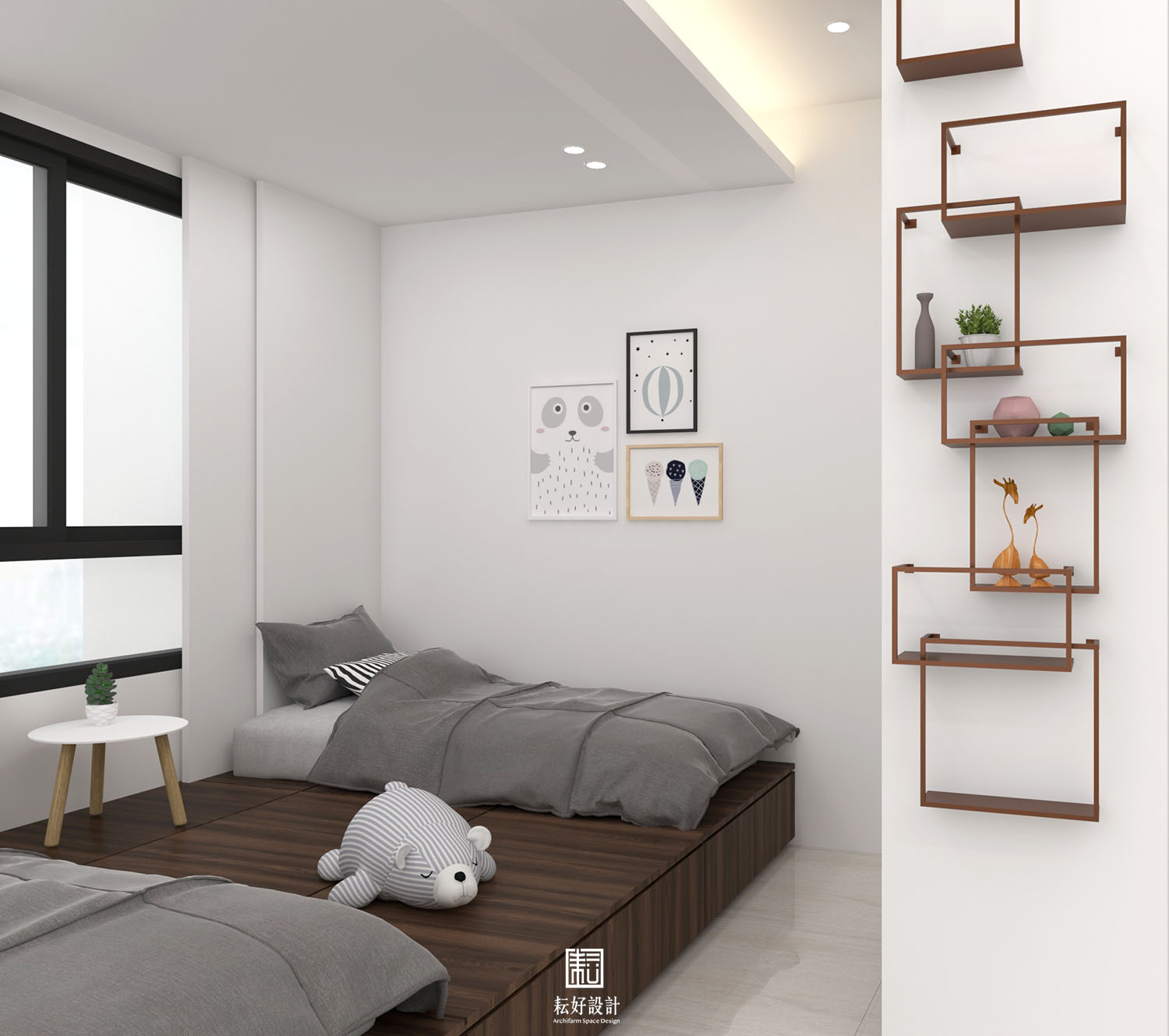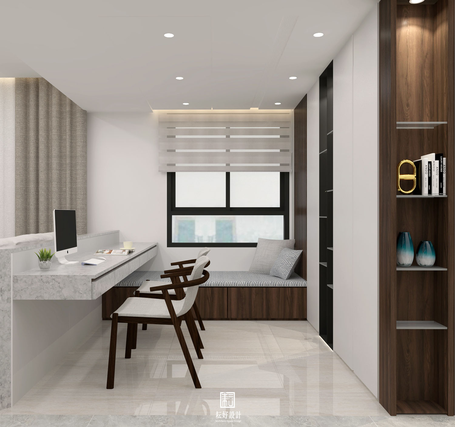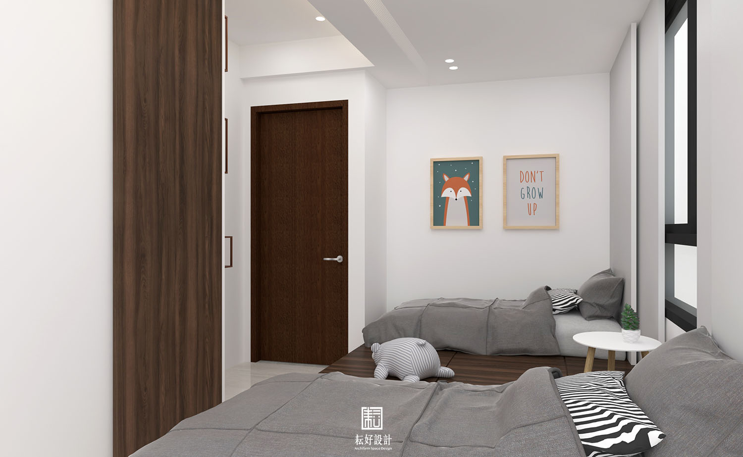客餐廳依據建商規劃微調,以整面置物櫃與電視牆整合,其中包含設備機櫃、鞋櫃、置物櫃等空間。書房處以半腰牆塑造開闊的視野,於窗邊臥榻處增設大型置物空間,可收納行李箱等大型物件。主臥將浴室入口收納於衣櫃序列,隱而不見,床頭橫樑下增設櫃體,將床架推離之外,同樣增加收納空間。次臥修改為通鋪造型,供兩位小孩共同使用,通鋪下方是可上掀的收納空間。