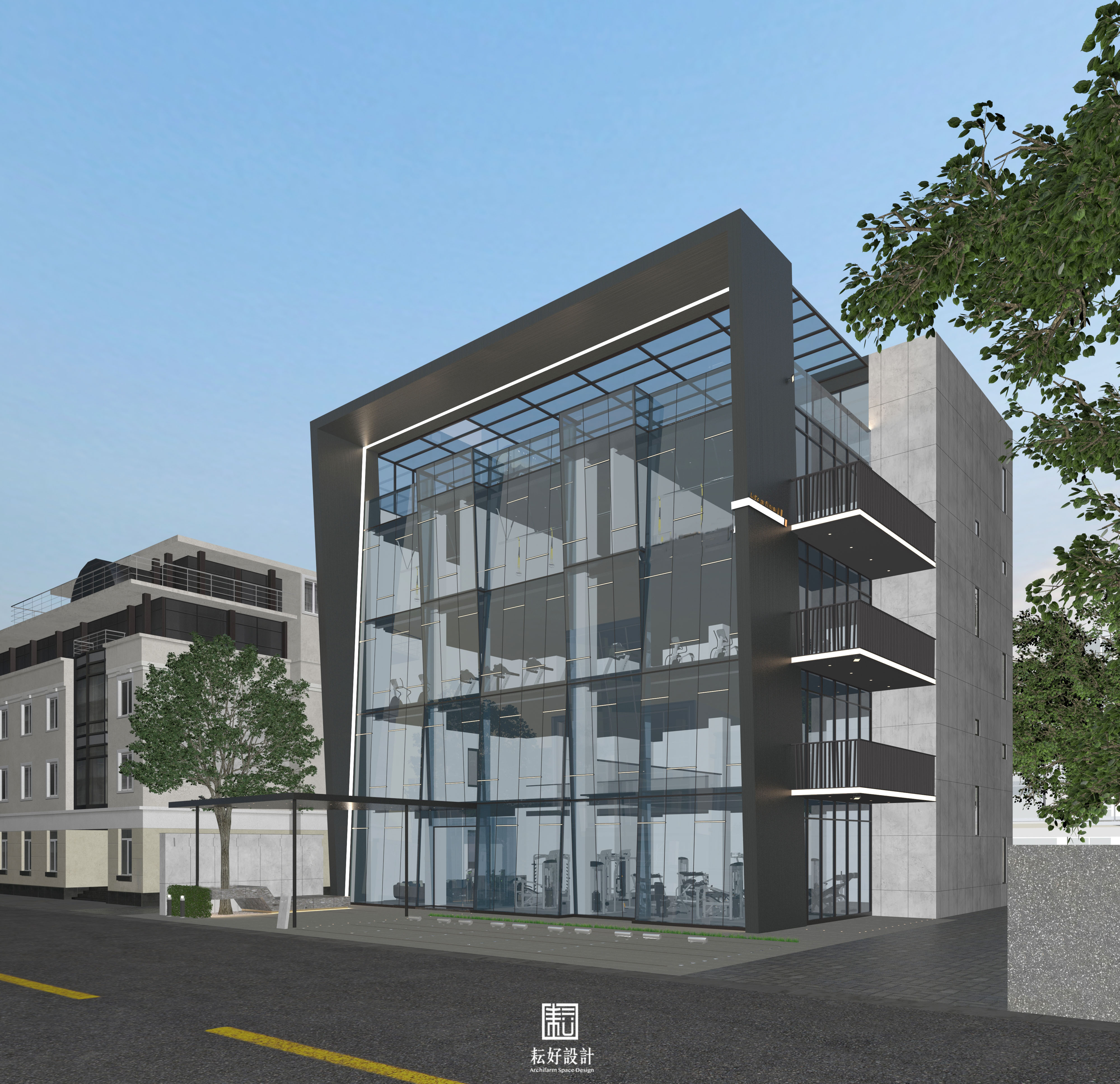 模擬圖:耘好設計 地點:台南市新化區 用途:健身中心 事務所:耘好設計+劉勇信建築師事務所 主持人:謝耕宇+劉勇信 參與者:林佳妮 空間面積:一 層:98.23坪 二 層:67.18坪 三 層:97.72坪 四 層:97.51坪 屋頂層:55.60坪 主要建材:鋼構、玻璃 設計日期:2020年9月至2021年4月