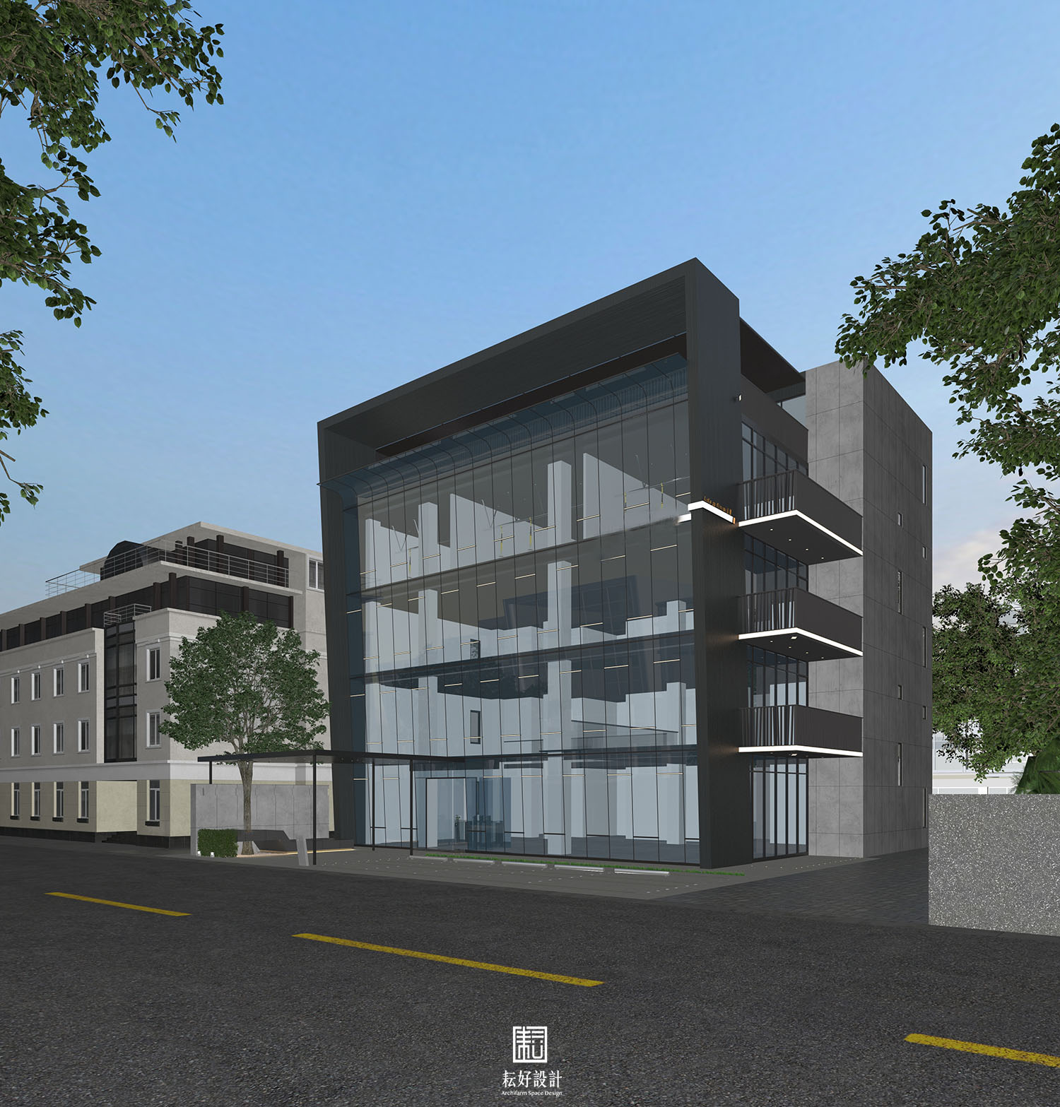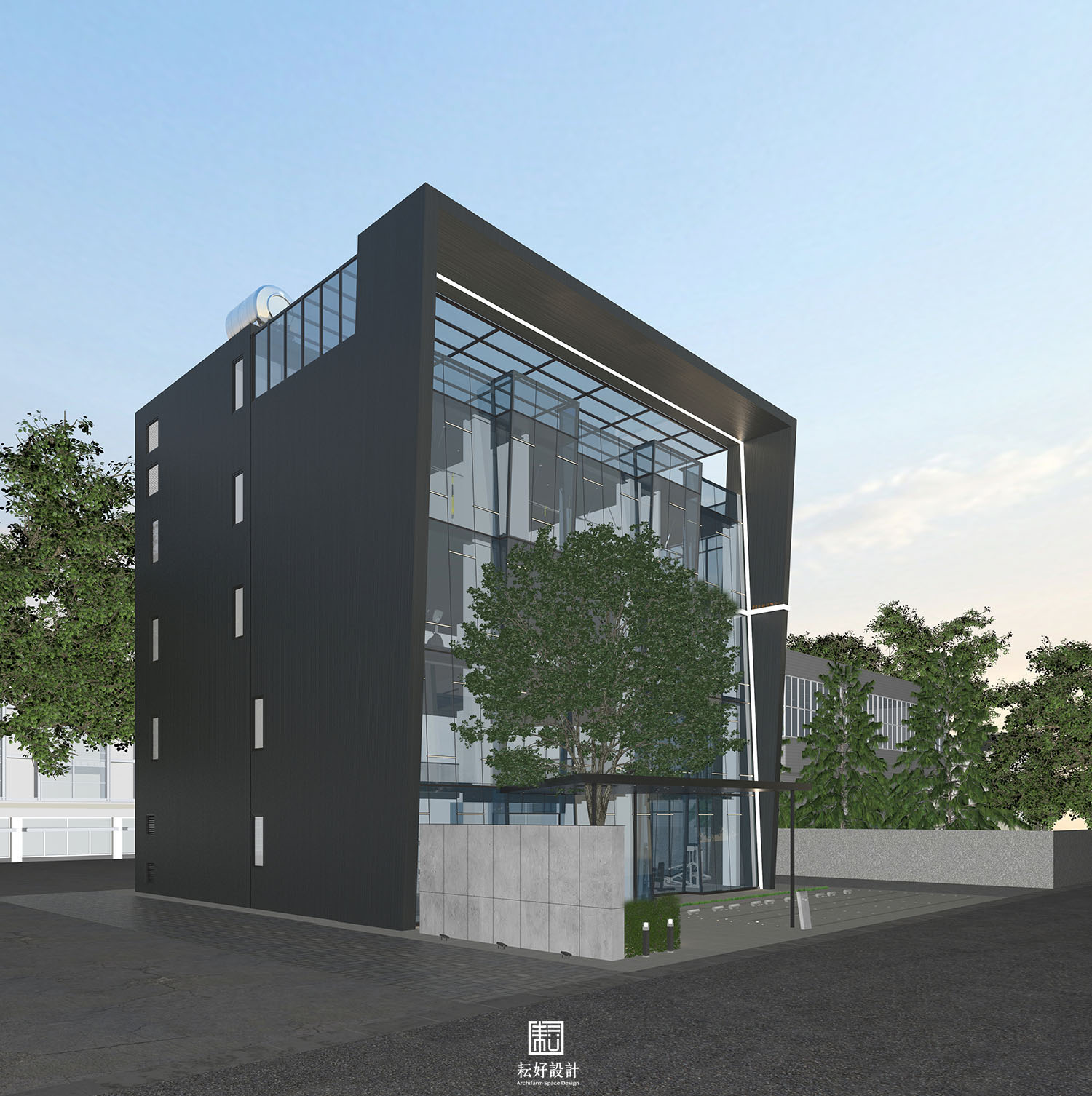建築左側配合陽露台的設置,結合企業識別燈箱,平衡建築量體的輕重。左後方的安全梯則以清水模搭配柯比意窗,為樓梯內的健身活動提供饒富趣味的光線體驗。