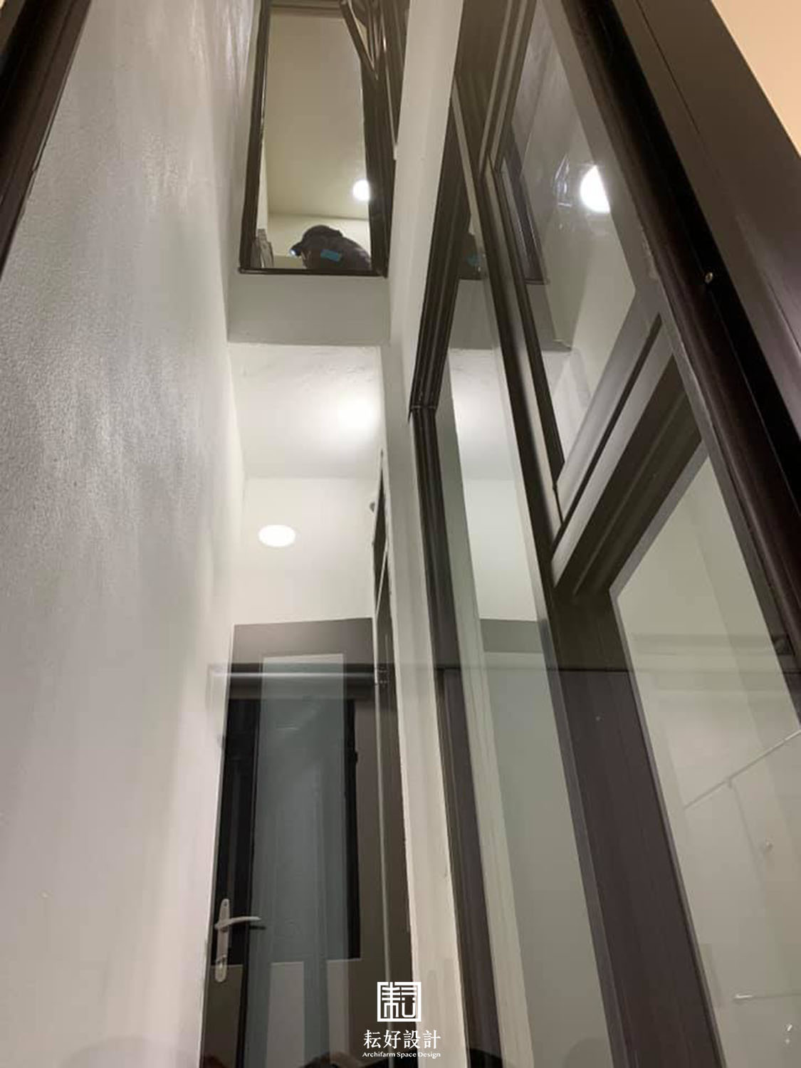 考量到臨地未來的建築可能性,我們為這棟街屋挖設了兩座天井。一座位於一樓後側臥室、一座位於餐廚空間處。餐廚空間處的天井直通四樓增建空間。藉著這座天井,一樓餐廚空間採光得到極大改善、二樓公共衛浴得以有對外窗、二樓後臥室、三樓後臥室及四樓倉儲區的採光改善,同時還可開窗形成室內對流。