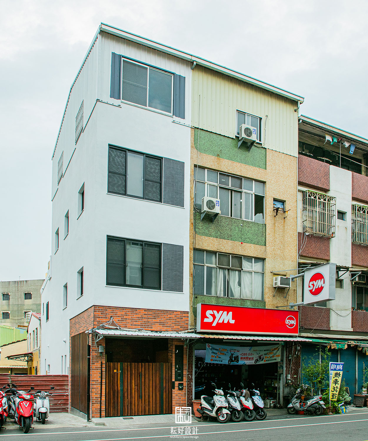 設計上於外觀著墨較多,將窗型空調孔填平、既有抿石子外觀修改成純白紋理塗料,並於騎樓處鋪貼仿舊紅磚二丁掛,為建物整體創造鄉村又簡約的外觀。騎樓處的南方松圍籬,以寬窄相間的韻律創造入口處的活潑氛圍。室內則以機能性造型為主,配色以淺色、米白等色系為主。