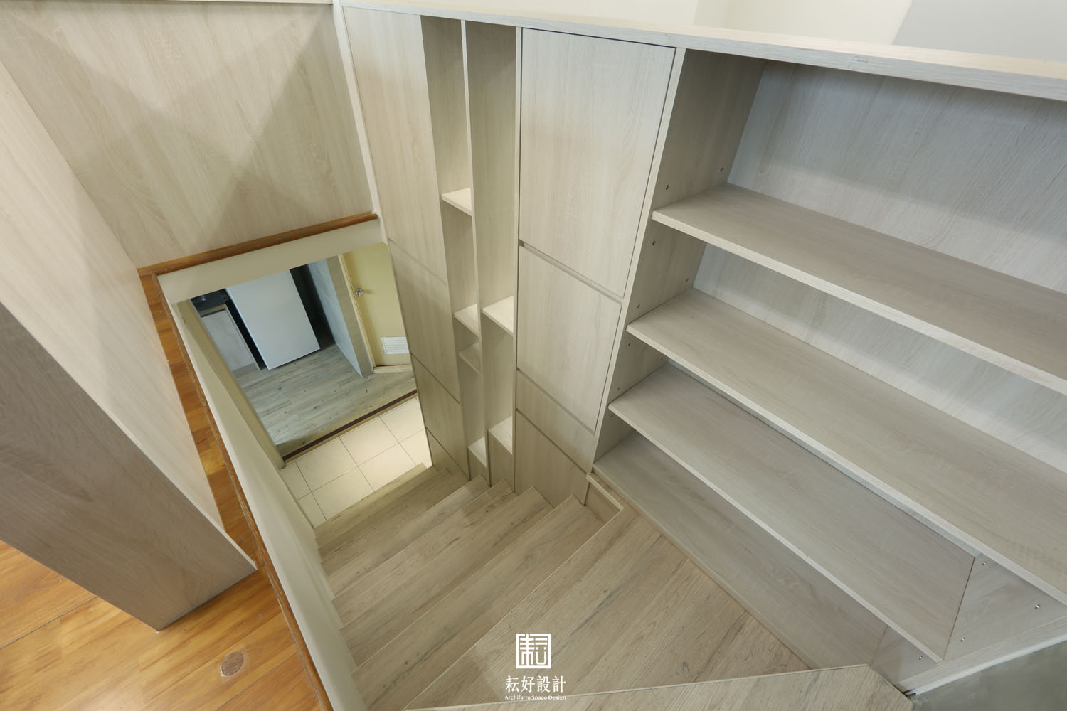 此案是該年代常見的樓中樓公寓戶型,一樓為客廳、廚房、公共衛浴、主臥、主臥浴室、二樓為兩間雅房。既有的裝修櫃體、壁紙、塑膠地板等,已經歷多年使用,狀態不佳,本工程以整理現況為主。此房為業主的起家厝,極有感情,三位小孩也都從小在此成長,因此以保留現況為主、不做過大的更動。