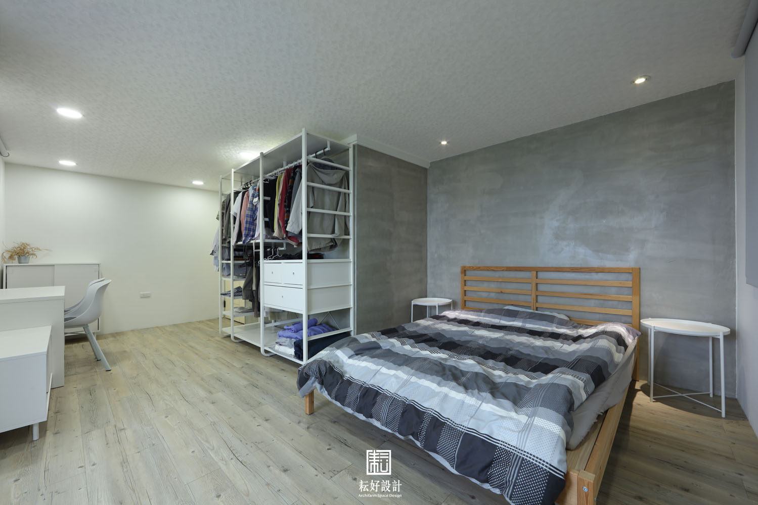 既有的空間色彩繽紛,較為雜亂。我們將空間回復至白色為主,並於幾處牆體披上樂土,增加工業風的質感。家具多配置ikea的輕巧、淺色、開放置物櫃,增加室內的視覺通透感。