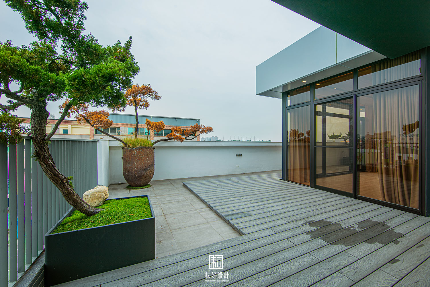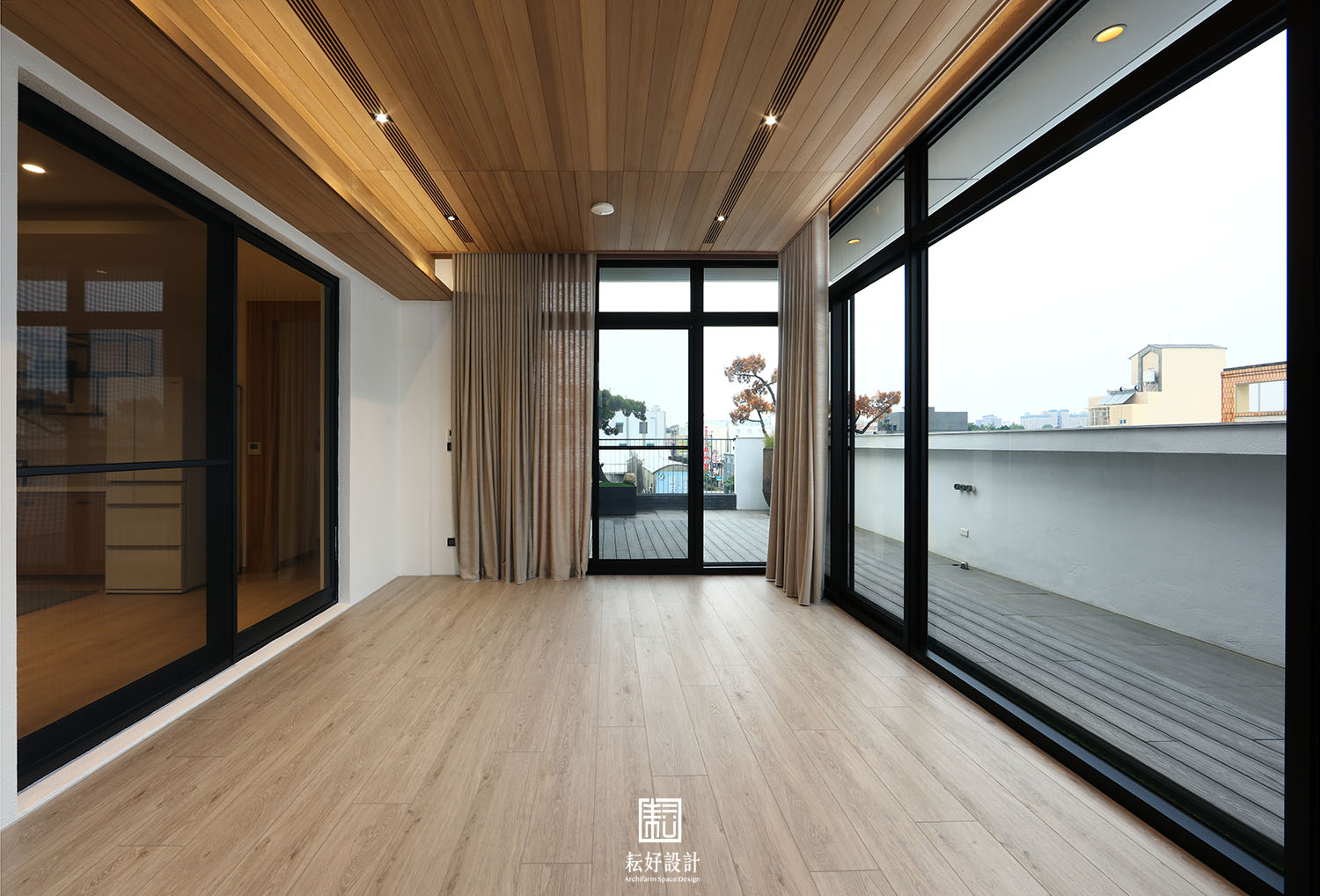屋頂玻璃茶室,則以非常簡約的白色鋁包板處理結構部分,室內則以香杉木料修飾天花,為室內提供寧心靜氣的天然精油氛圍。