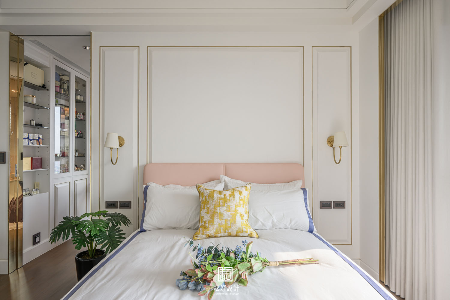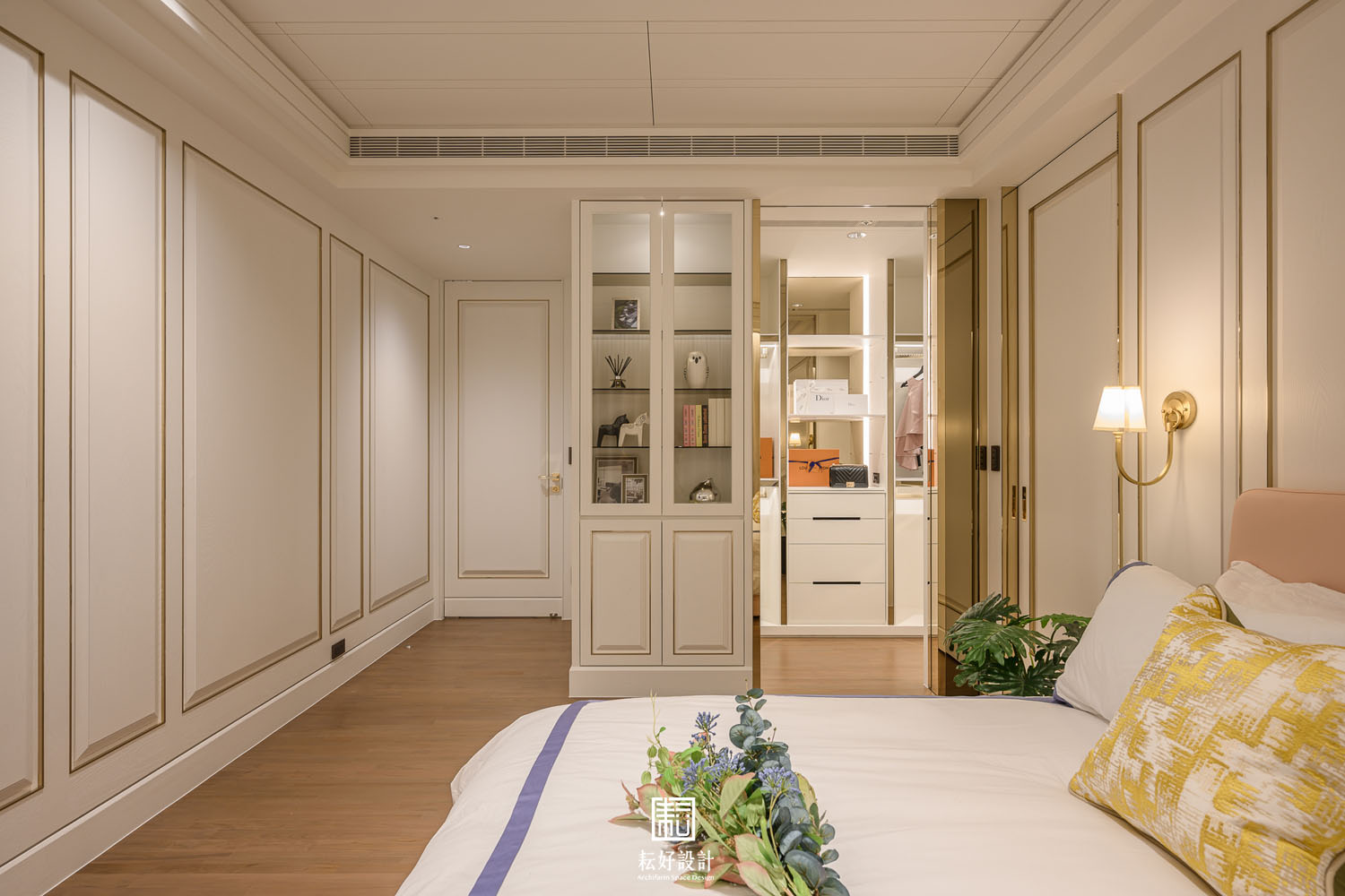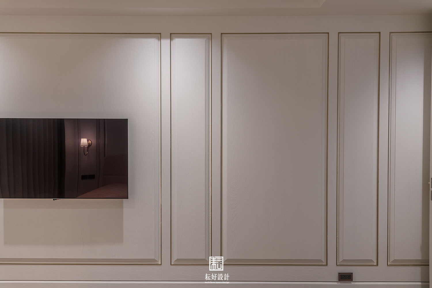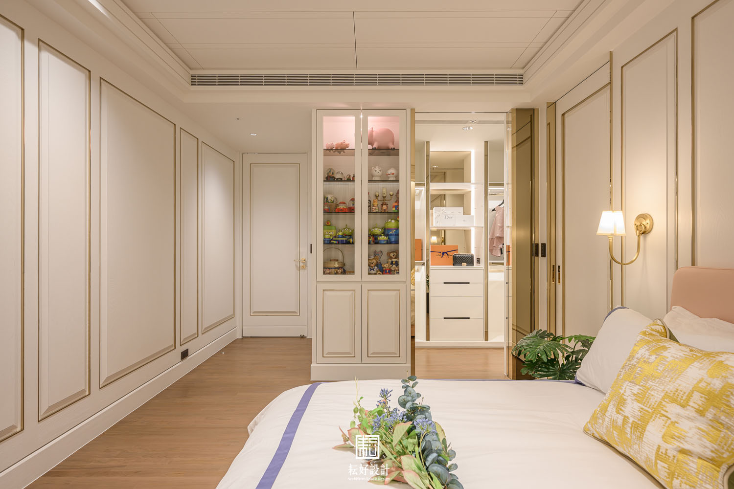 女孩房的風格因相同的材質,而與公共空間及主臥有著相同的氛圍。考量到使用者的不同,以細緻的線板框景為主體,處處可見不同尺寸的線板。線板的表現極為繁瑣,以數層木作疊合,創造深淺不同的外框及肚板,最後更輔以金色飾條框景,增添整體造型的品味。