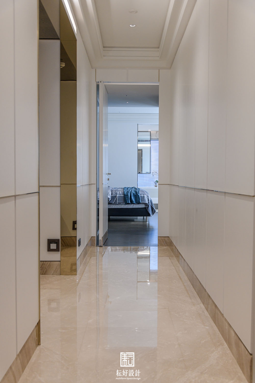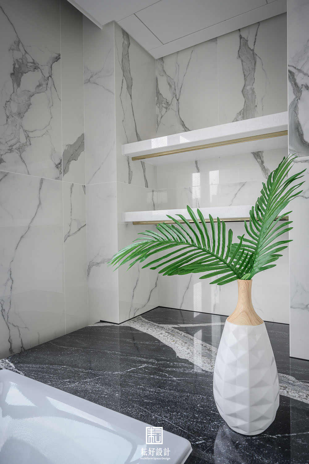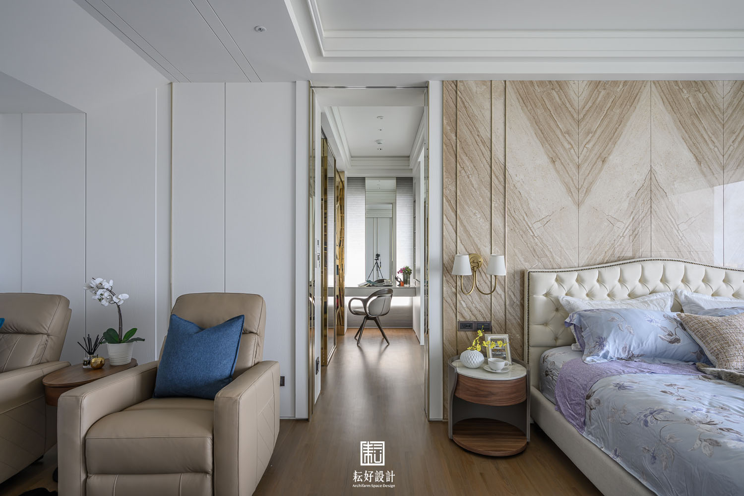 主臥壁面的實木皮與金屬飾條是公共空間中的樣式,而在此處,則增加了實木皮進出面的變化以及與床頭石材的對比,在公共空間風格延續之上,更增添些許細膩的材質表現。衣帽間與梳妝室間的區隔是頂天的玻璃門,收攏時則是件氣派而又低調的玻璃屏風,稍稍區隔了衣帽間的光線,但其中的懸空造型層板與展示櫃仍能與梳妝室有所對應。主浴浴缸的特色石材,巨大的晶白筆劃躍然於黑底之上,剛好與全室透白的銀狐花紋相呼應,主浴因而豐富起來。