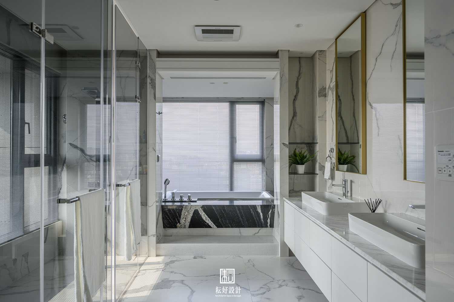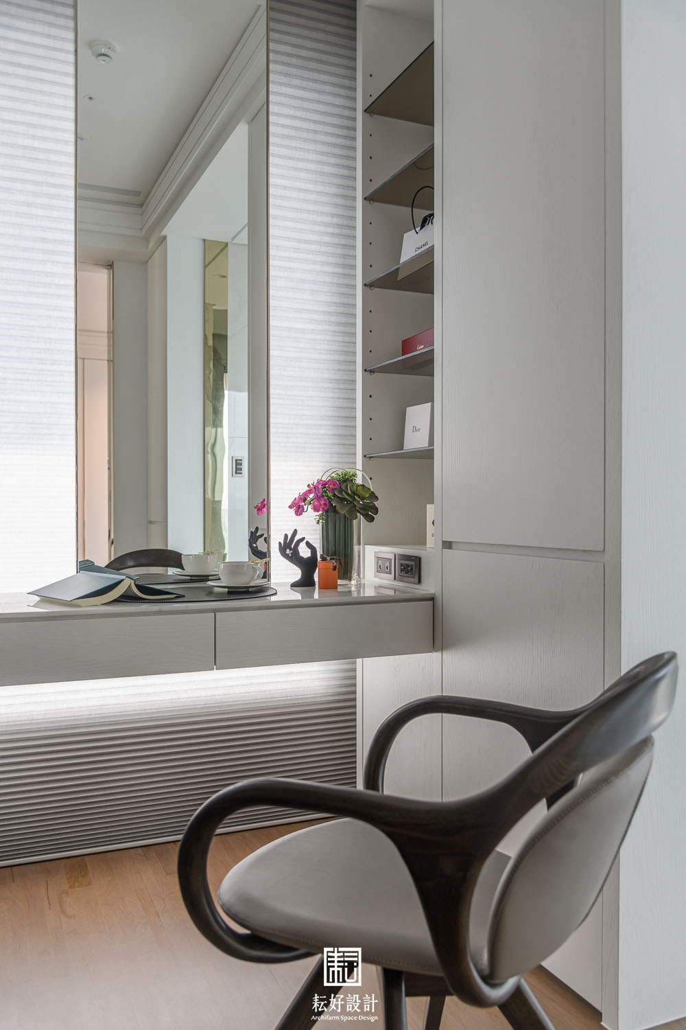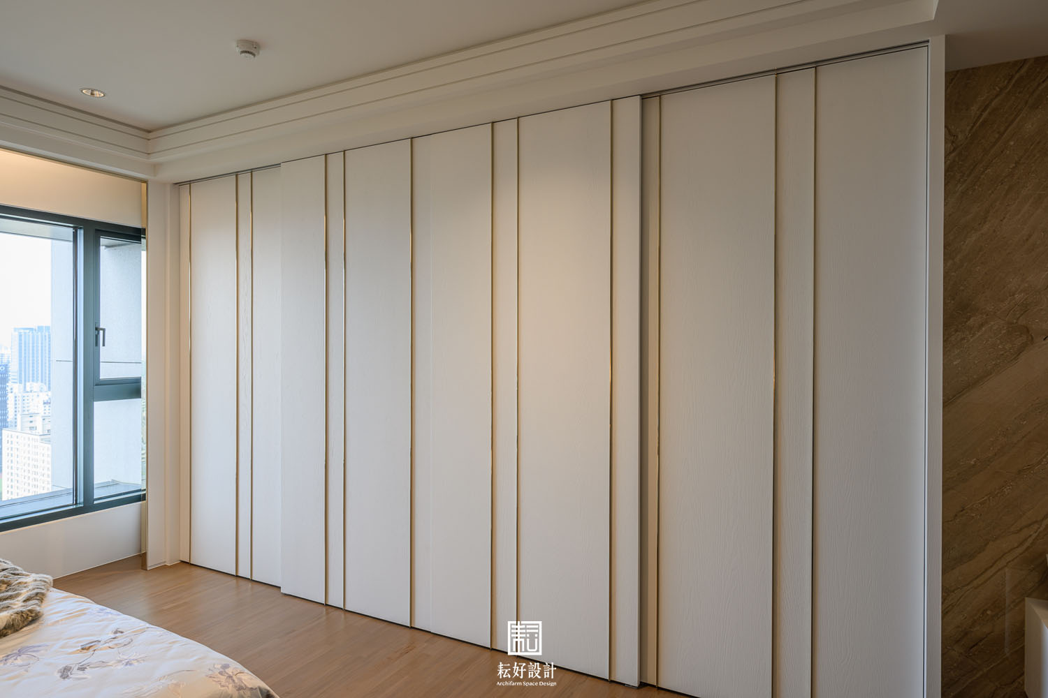 本案鄰近的綠意景觀及高樓層的優勢極為難得,因此在配置上做了詳盡的調整,公共空間區劃了玄關、衣帽間、書房、客廳、餐廳、兩間廚房、以及兩間儲藏室。業主特地加大了熱炒廚房的空間,使其有著完善的使用機能;而輕食廚房的配置也為開放的客餐廳空間提供一處端景。從輕食廚房往客廳落地窗望去,豐富的軸線視野依序展開。因業主的戶型位於雙拼的外側,具備絕佳的景觀視角,三間臥室及三間衛浴皆能向外開窗,尤其是主浴的浴缸處縱覽景觀公園,為業主提供舒適大氣的休息場所。主臥室提供業主完整的使用機能,配置了視聽區、整面牆的衣櫃、衣帽間、梳妝室及浴室,衣帽間、梳妝室及浴室的空間,以語彙相同的橫拉門隔開,為睡眠區劃設了整潔的立面空間。女孩房的使用面積較小,卻仍與主臥有著相同的豐富機能,衣帽間、梳妝室,以及業主女兒特別強調的展示空間,為其長久來的收藏提供亮相的機會。男孩房的空間較為單純,有著衣帽間及開放衣櫃。