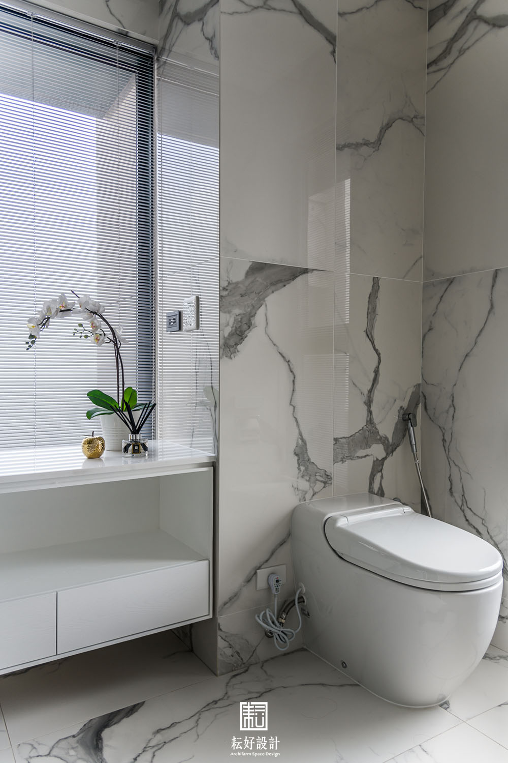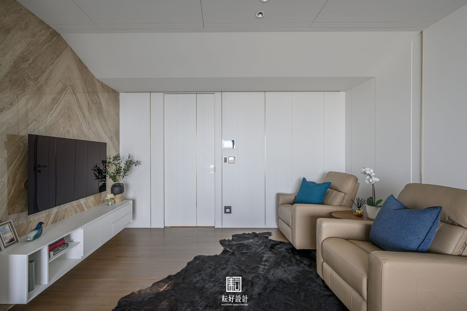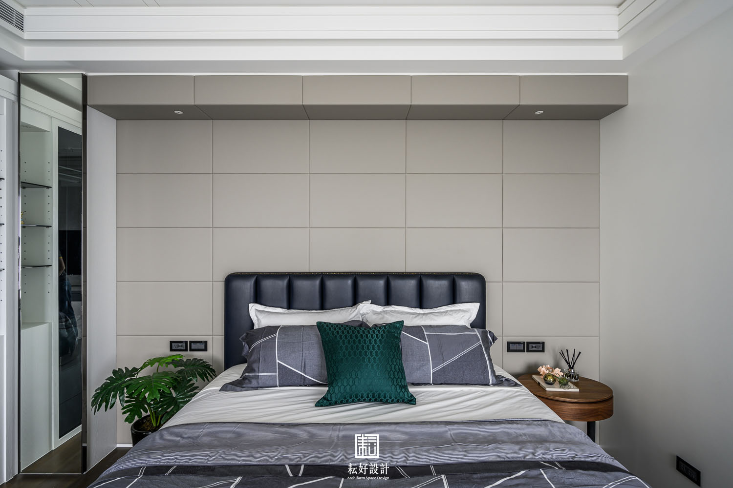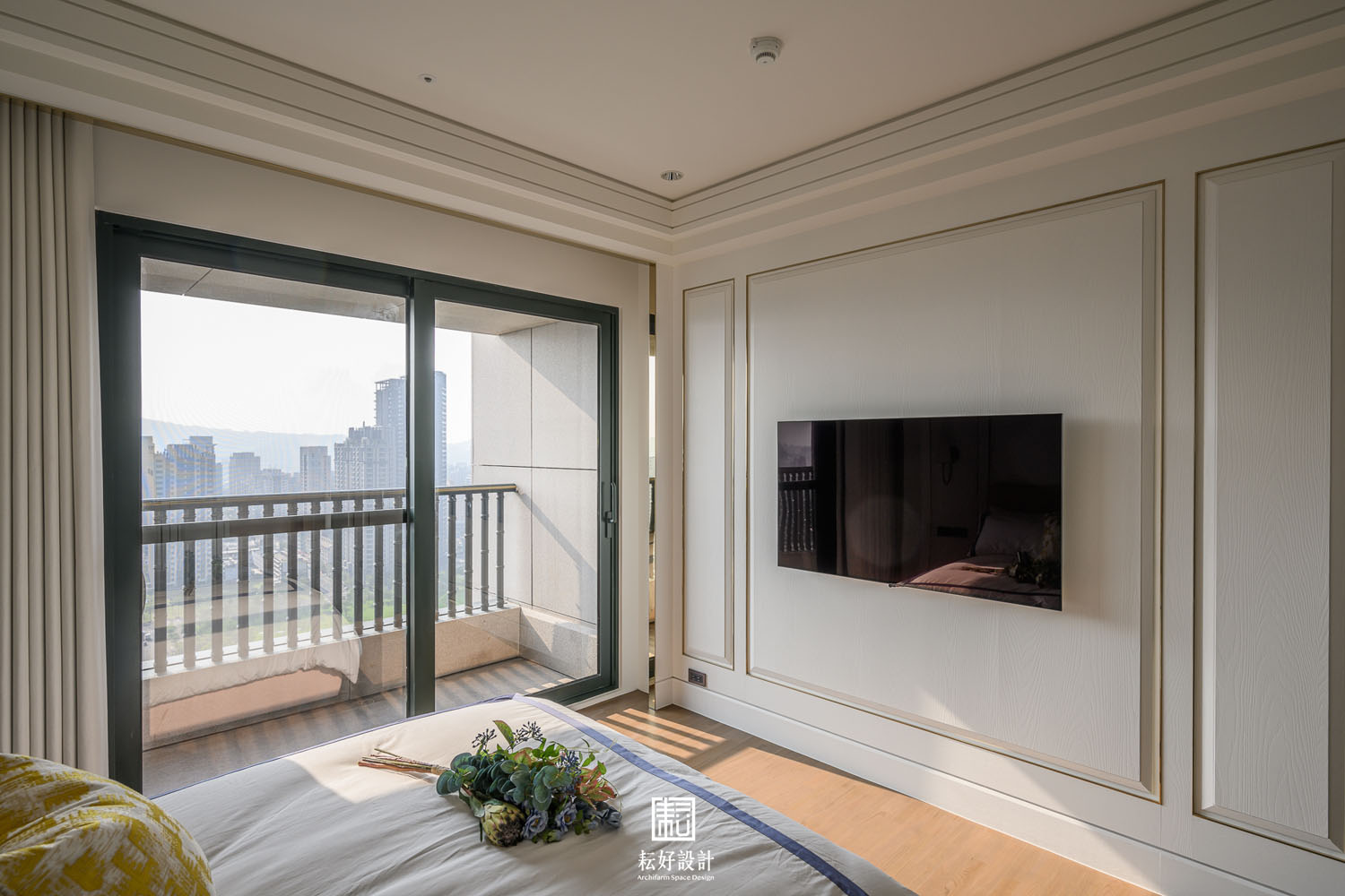 本案鄰近的綠意景觀及高樓層的優勢極為難得,因此在配置上做了詳盡的調整,公共空間區劃了玄關、衣帽間、書房、客廳、餐廳、兩間廚房、以及兩間儲藏室。業主特地加大了熱炒廚房的空間,使其有著完善的使用機能;而輕食廚房的配置也為開放的客餐廳空間提供一處端景。從輕食廚房往客廳落地窗望去,豐富的軸線視野依序展開。因業主的戶型位於雙拼的外側,具備絕佳的景觀視角,三間臥室及三間衛浴皆能向外開窗,尤其是主浴的浴缸處縱覽景觀公園,為業主提供舒適大氣的休息場所。主臥室提供業主完整的使用機能,配置了視聽區、整面牆的衣櫃、衣帽間、梳妝室及浴室,衣帽間、梳妝室及浴室的空間,以語彙相同的橫拉門隔開,為睡眠區劃設了整潔的立面空間。女孩房的使用面積較小,卻仍與主臥有著相同的豐富機能,衣帽間、梳妝室,以及業主女兒特別強調的展示空間,為其長久來的收藏提供亮相的機會。男孩房的空間較為單純,有著衣帽間及開放衣櫃。
