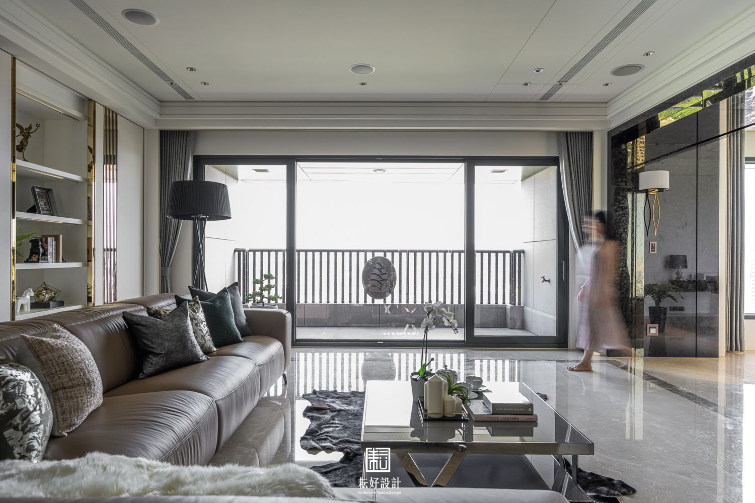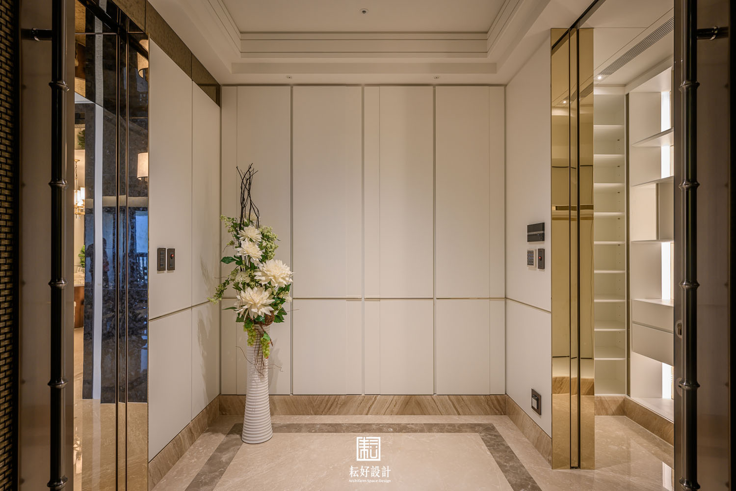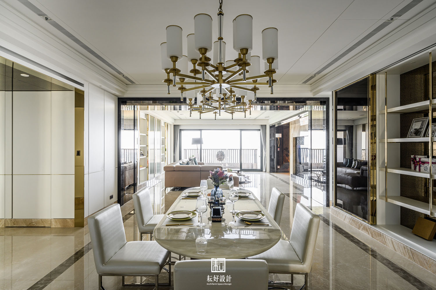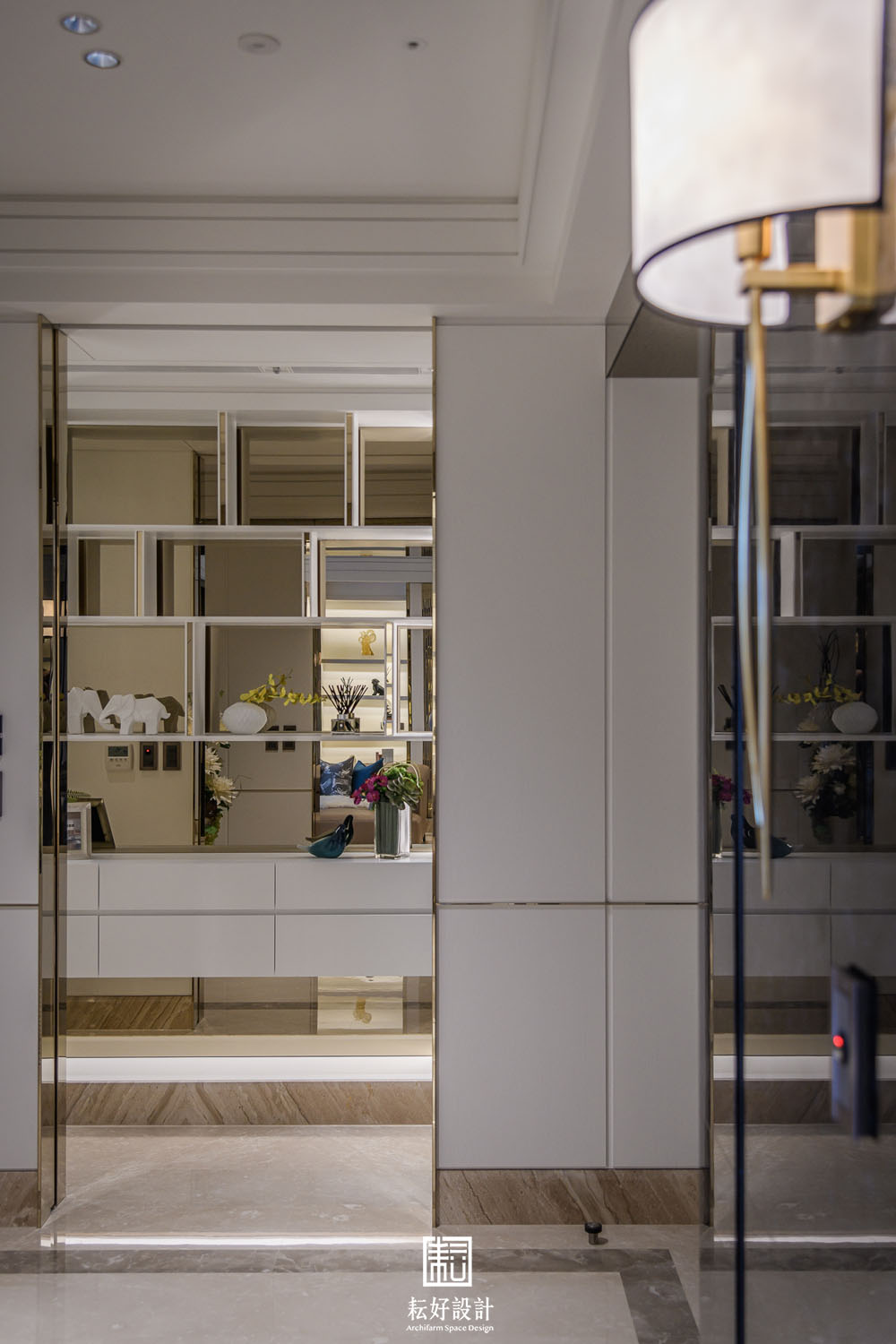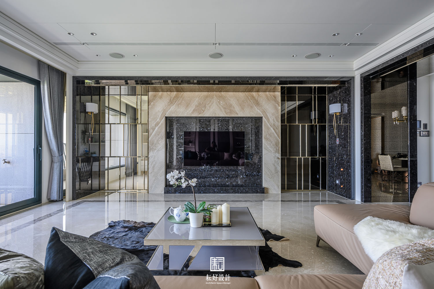 在風格上,以現代古典的風格去塑造空間,盡最大的努力讓空間顯得端莊素雅不過於繁複。整體以白色為主,藉著極薄的金色飾條,勾勒出素淨的背景。每處天花與壁面的銜接處、每處樑下空間,皆以最細緻的造型及工序處理,包含數道層疊的造型板或線板尺寸的調整,以使天花在高層建築的樑柱限制下達到罕見的淨高度,除水平空間的開闊視野外,垂直高度的氣勢也不落人後。空間過渡的通道門、拱門、廊道,以及幾處展示櫃體,則以較突顯的色彩搭配。玄關及書房通道門的金色框架被細分成數塊的茶玻,豐富了電視牆面的視覺感受。客廳、餐廳、輕食廚房的過渡區拱門,則以黑色的咖啡絨石材及仿古茶鏡,塑造出兩座大氣的大拱,除創造了空間的焦點外,也讓使用者忘卻其為高層建築的堅實結構,輕食廚房的拱門尺寸經過細緻的調整,遮蔽住輕食廚房的廚具高櫃,卻又不至於與前方的拱門產生不協調的氛圍。通往臥室區的通廊,隱含著一處公共廁所及儲藏室,藉著木作及石材的造型細節,使得兩處空間皆不明顯,看似通道空間的兩座屏風。整大面的倒吊仿古茶鏡除了延續外側大拱的元素及氛圍,也藉著尺寸的調整,極好地隱藏大橫樑的存在,也鋪展開了臥室區過道的氣勢。越過了左右兩側屏風,進到三間臥室的過廊時,挑高的天花除呼應公共空間的天花造型外,也使得這處動線有著極罕見的氣勢,不因其通廊的空間性質而狹窄不適。