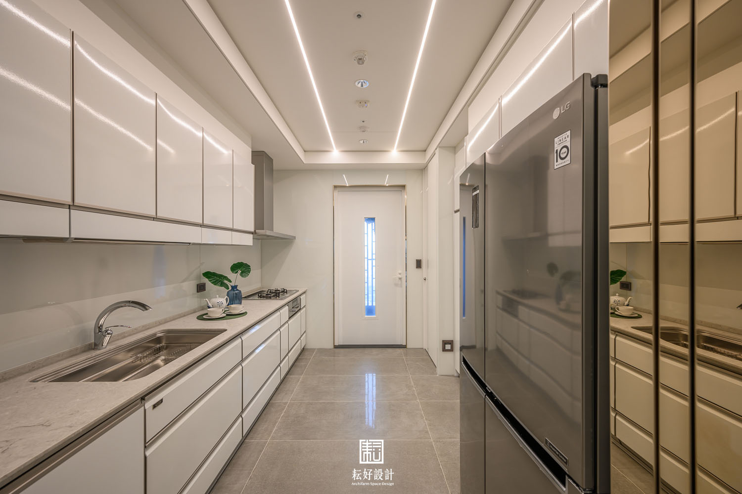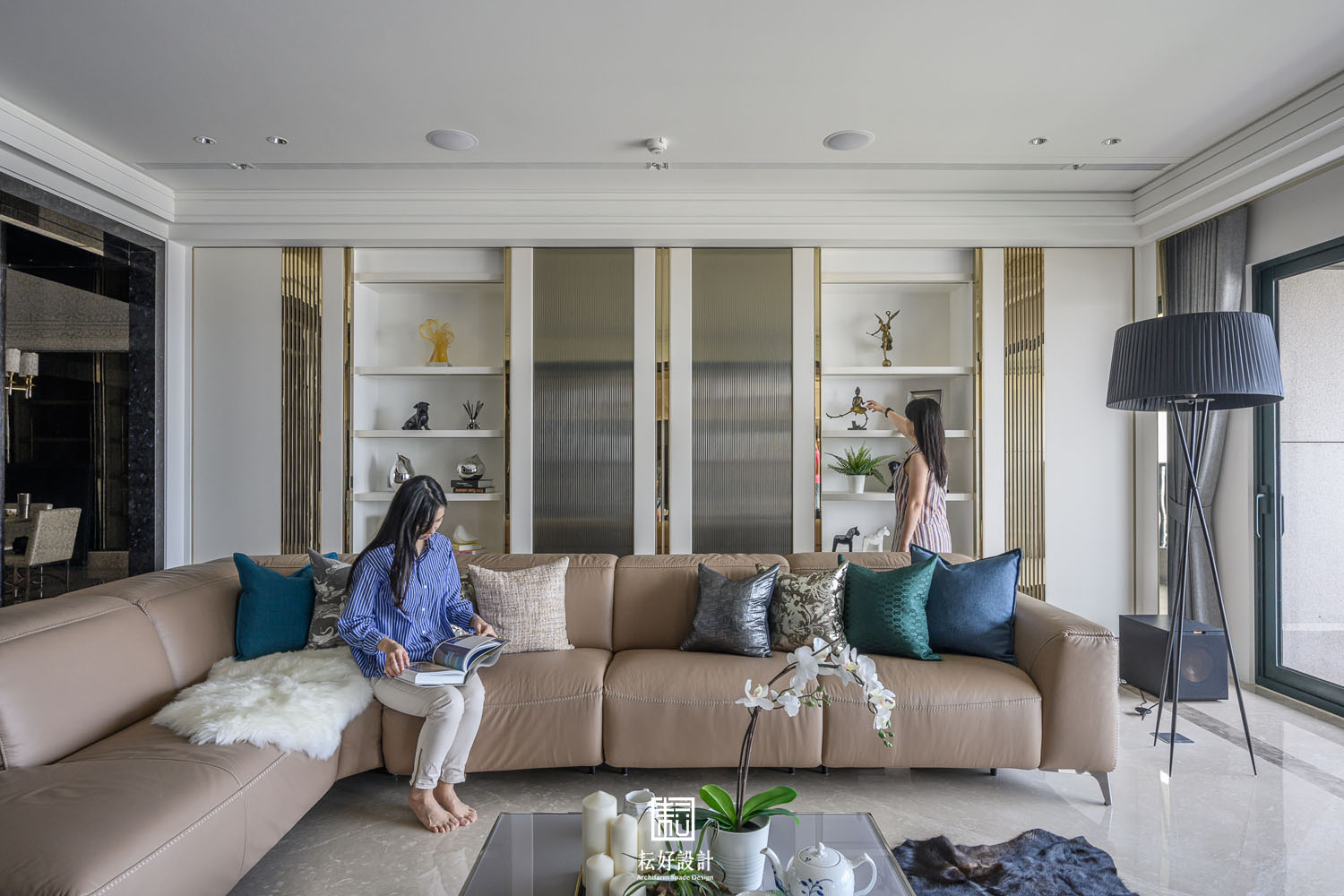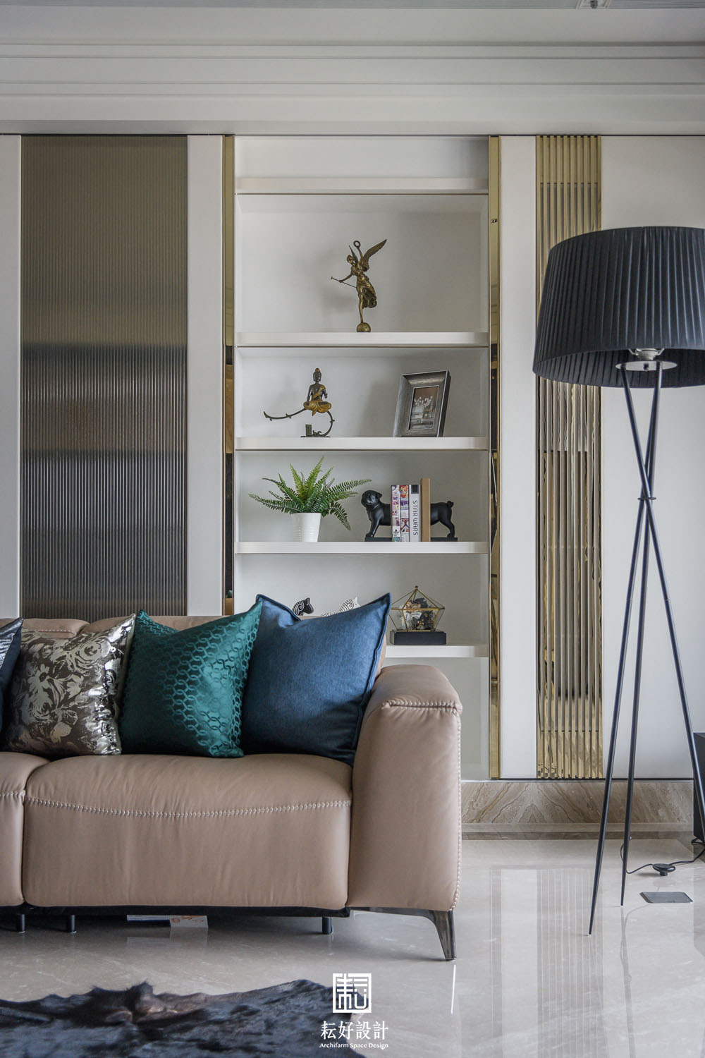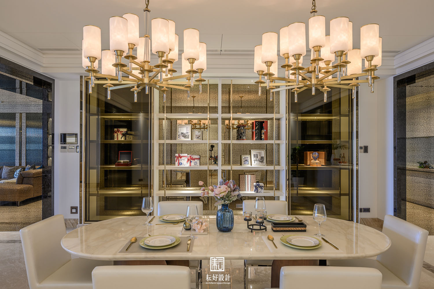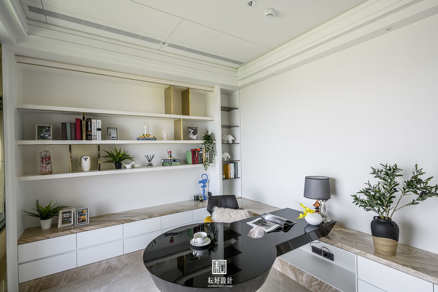 幾處較顯眼的端景,則以相同的材質或色彩搭配,藉著造型上的設計,使其不過於喧囂,卻又吸引目光佇足。玄關衣帽間的造型櫃不似傳統櫃體,數層長向的造型層板為其上的鞋款或包款提供一處特色的展示台。客廳電視牆的石材過渡到米黃色地坪不過於突兀,電視背襯暗色石材,使其融入至電視牆的造型之中。客廳後側高櫃除顯眼的直紋玻璃及金色格柵外,開放的層板櫃以白色實木皮搭配白色壁紙與白色皮革,豐富的材質紋理卻有著相同的顏色,呼應了空間低調而細膩的風格,上述的手法也延續到了書房的書櫃之中。餐廳的展示櫃是本案較為突顯的端景,材質多樣造型也較為繁複,為業主提供了重點展示的空間。輕食及熱炒廚房的裝飾是簡單的,只以整面的烤漆玻璃或琺瑯鐵板包覆,但輕食廚房的中島除了美麗的紋理外,大跨距的空隙則創造了一處簡單卻也吸睛的用餐背景。