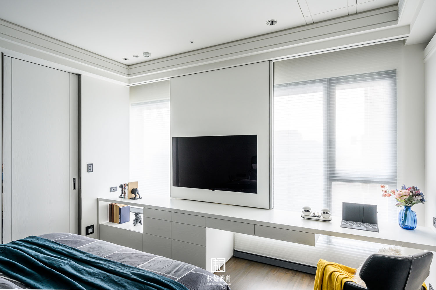 男孩房的選色有著較大的差異,整體空間仍以白色為主,但局部的裝飾則以灰黑色為主。其中的白色,不似其餘空間的實木噴白,而是輔以烤漆,使得空間的底色泛著瑩白光芒,極為細膩柔滑。受限於該處格局,床鋪正對大面開窗,因此以二重奏的風琴簾為使用者提供彈性的光線佈局。晴朗日光透過展開的紗質簾,勾勒出柔和煦人的白色光線,極為宜人。
