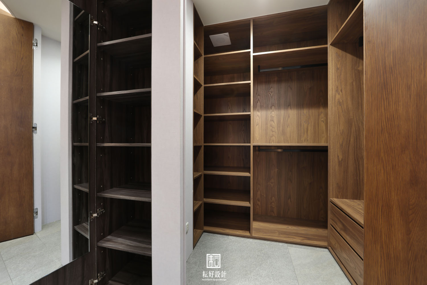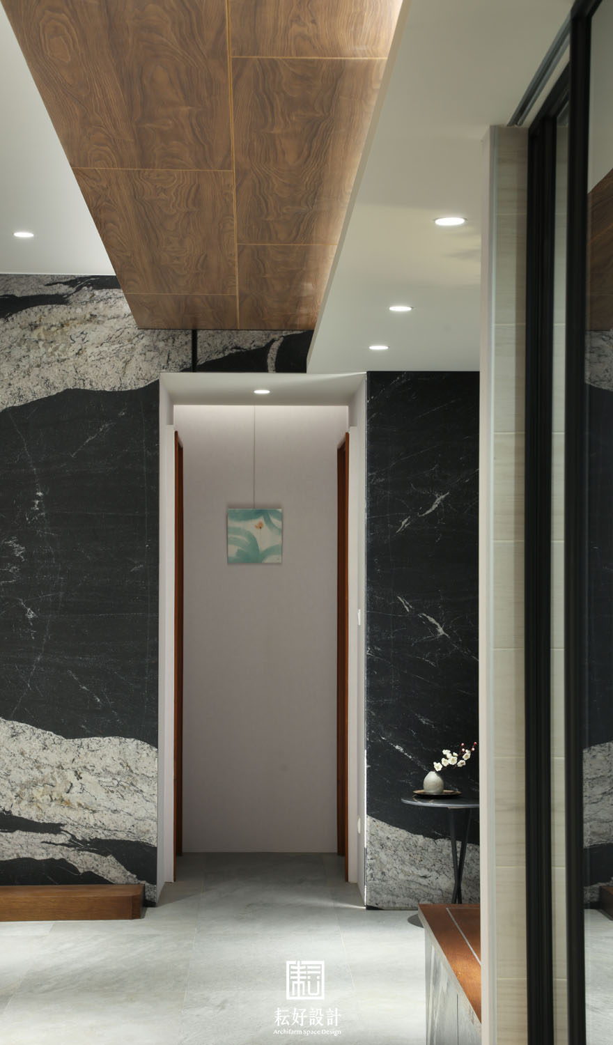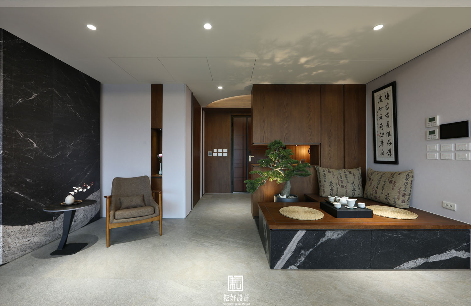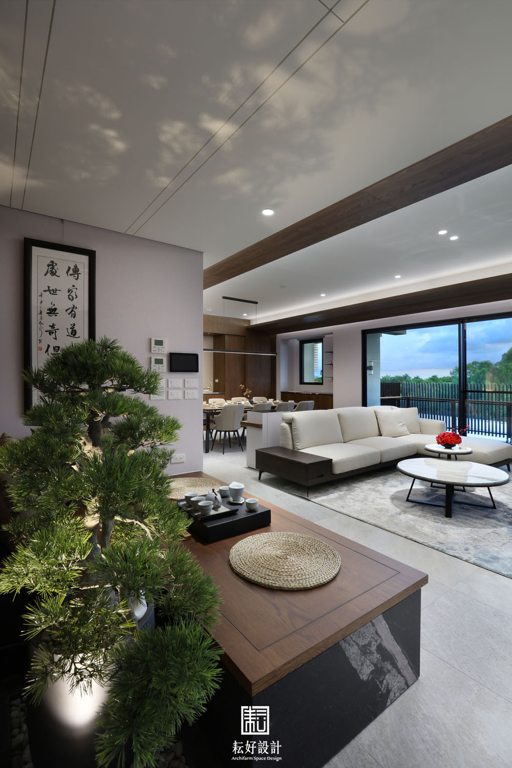 踏入大門,以一堵半遮擋的櫃體,為其後的萬坪綠景妝點出欲語還休的期待感。玄關處配置有充足的收納空間,右側儲藏室兼作室內環控、客廳影音的設備空間。移步換景後的客廳餐廳連貫成整體的大氣空間,此時回看入口處,公共空間的中心地帶是低矮臥榻搭配飄型的仿真羅漢松,沒有過於突兀的量體,以突顯整體空間的空靈氣質。廚房、洗衣工作間皆以簡潔的線條收斂,藉此強調客餐廳空間的整體性,塑造大氣的one room公領域空間。廊道兩側分別是主臥及兩間臥室的入口,皆以橫拉門隱藏住視覺的窺探;為賓友來訪時提供完整的接待空間、使私領域與公領域之間的活動不至於互相叨擾。特別調整臥室一二入口玄關的位置,將客廳電視主牆尺寸放大,冀望為此案塑造更為闊綽的視覺質感。