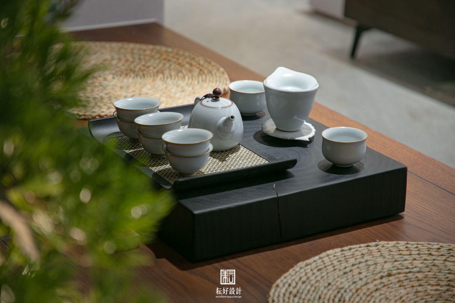 軟裝佈置不見常備綠色植栽,借景窗外即可,反倒是多配置繽紛的花果枝枒,增添室內的人味。搭配的擺件字畫也以禪風為主,使室內空間有極為一致的調性而不過於喧嘩。
