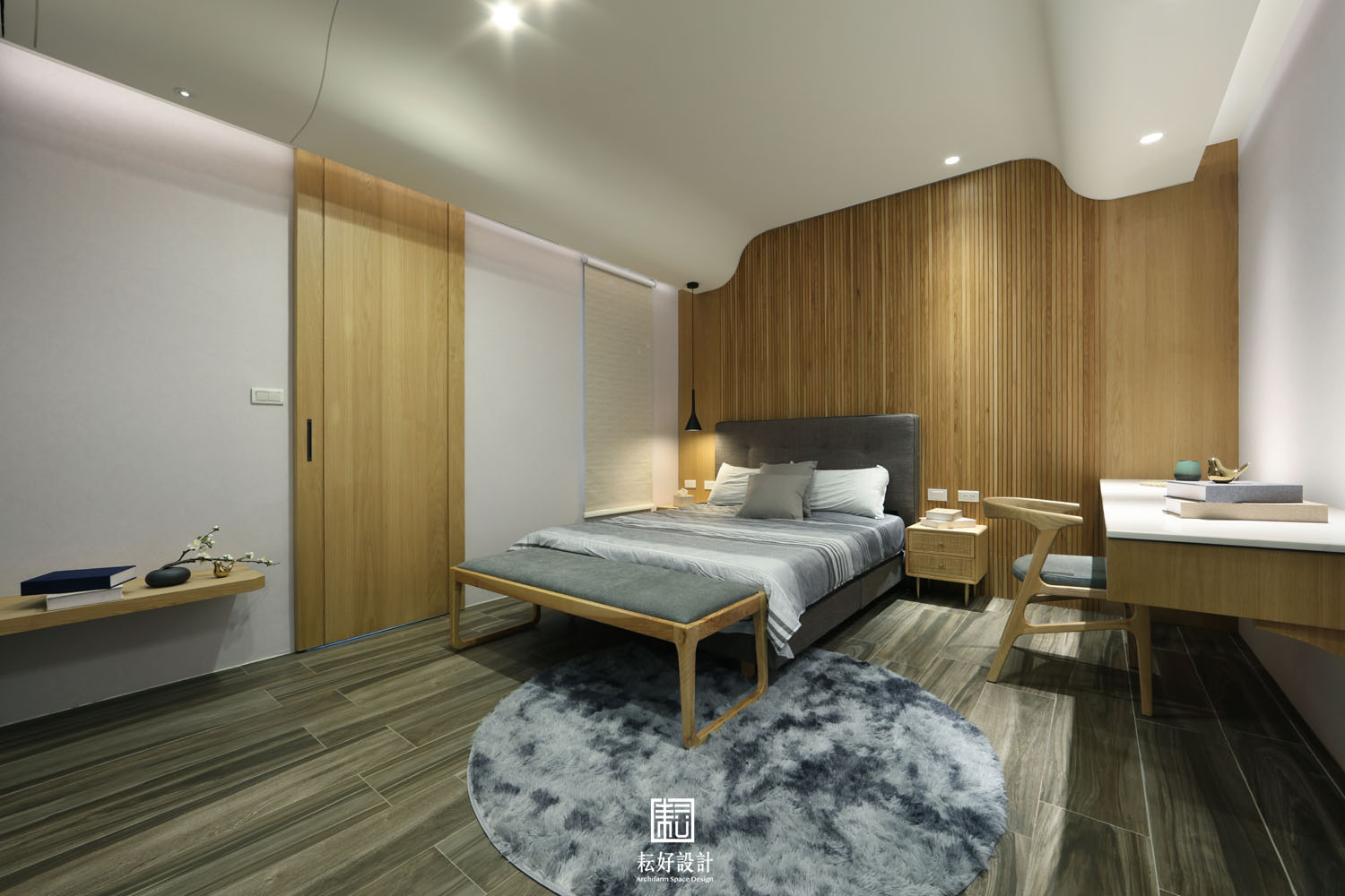 此案有極佳的外部條件,室內無須造景,而以引景入室為規劃的重點。整體氛圍以日式禪風搭配建築外觀的語彙,塑造寧靜、祥和、溫潤、人文的氣質。以木材及石材為主要材料,減少光亮面的色澤以符合整體材質質地。客廳的電視主牆,以建設公司欽點輕井澤施作,將大筆的白墨筆劃拼接為連綿的山巒,與窗外綠景相映成趣。主臥背牆以垂直溝縫修飾新灰姑娘的均質紋理,為主人房帶來暖心的居住體驗。兩間臥室則大面使用橡木原色與米白的壁紙,空間雖小,卻不產生壅擠的氛圍。
